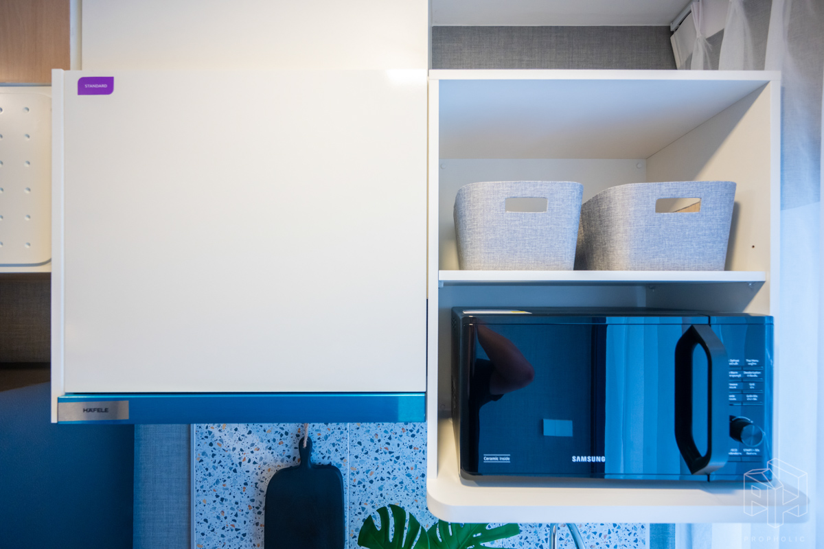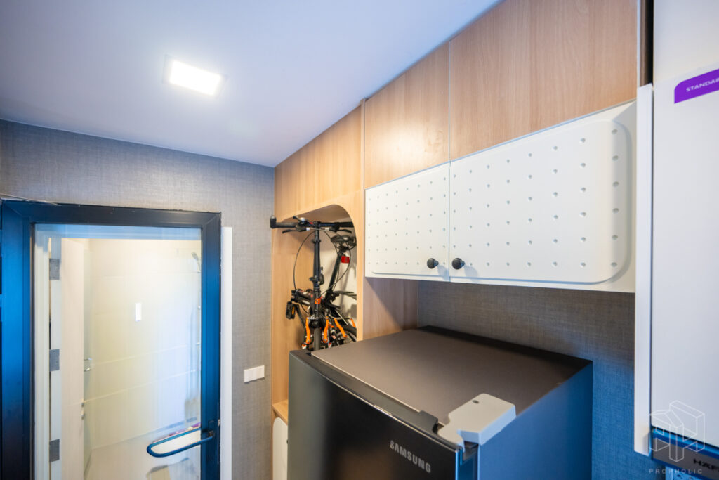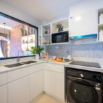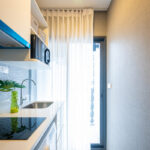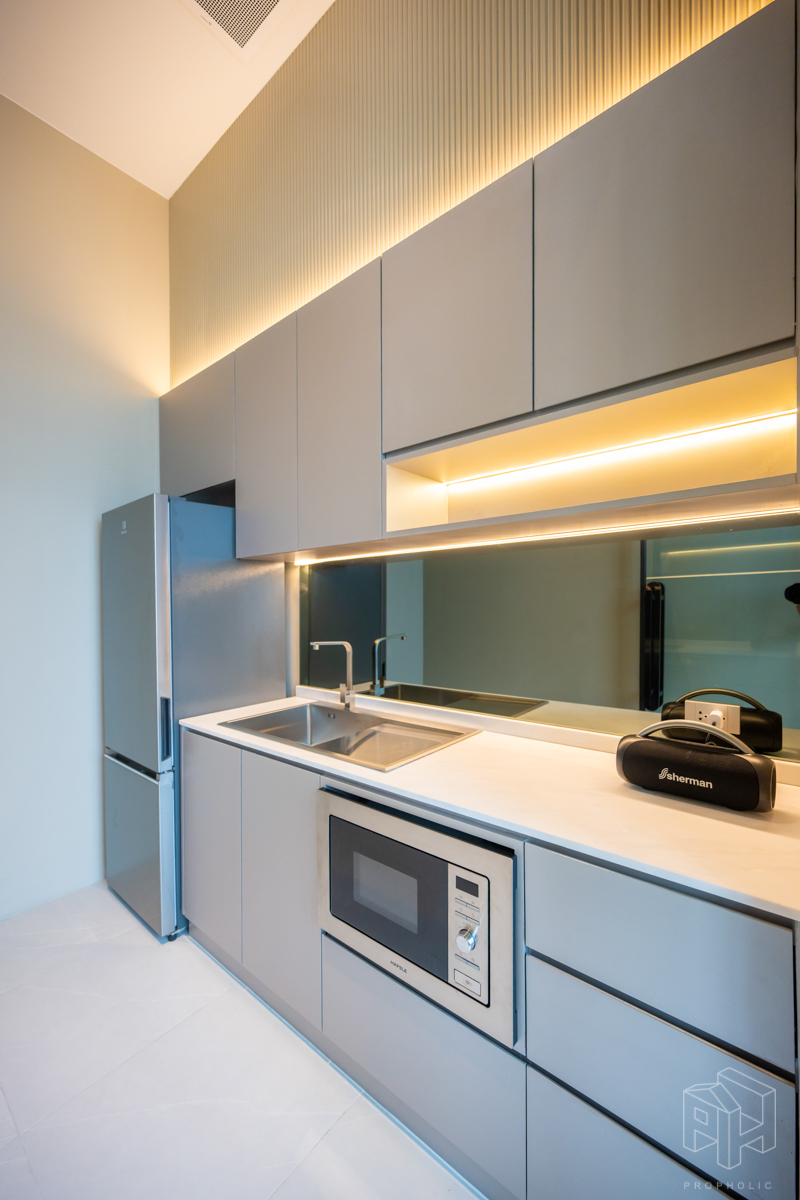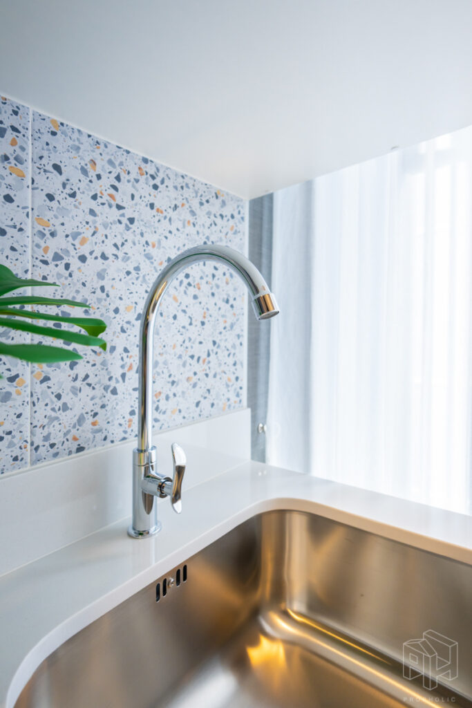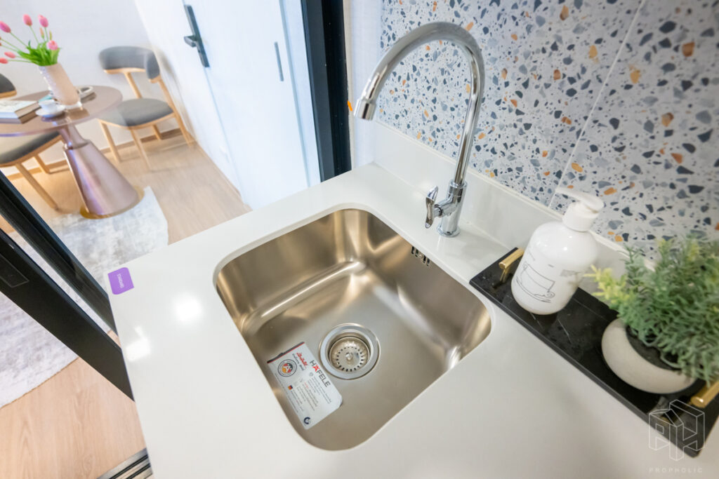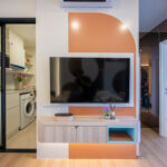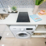 ครัวแบบ L-Shape พร้อมพื้นที่วางเครื่องซักผ้าในตัว ใช้งานครบจบในพื้นที่เดียวเหมาะสำหรับคอนโดมาก
