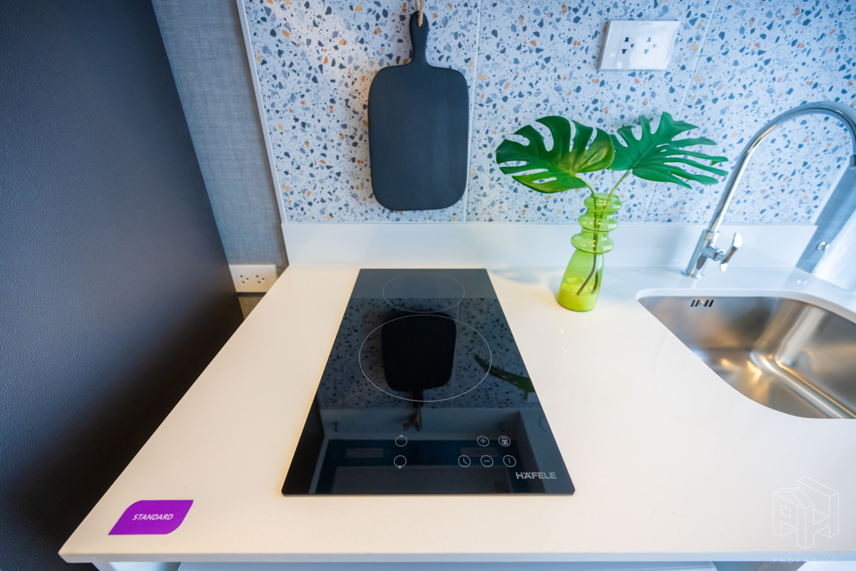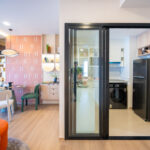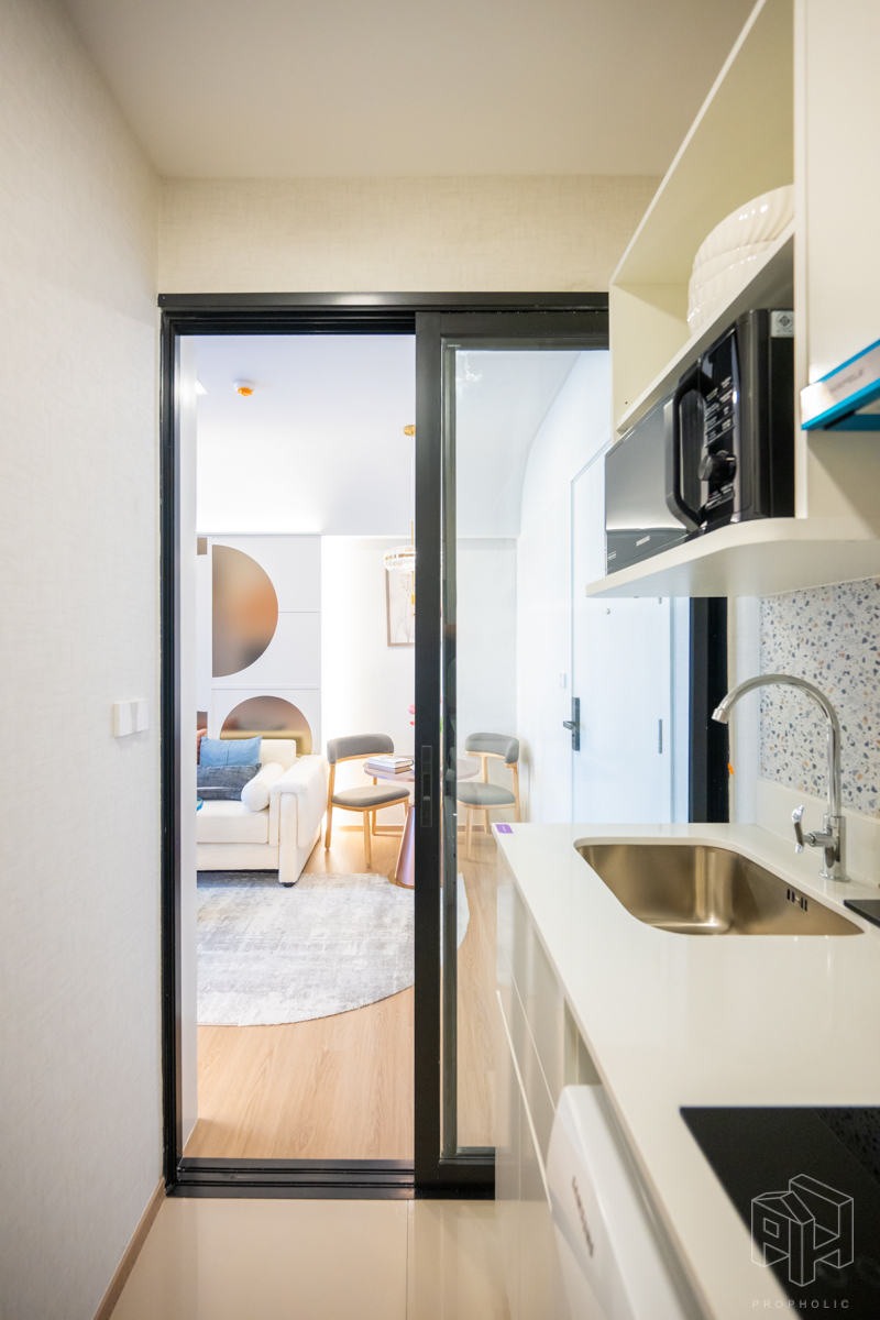 มุมครัวปิดกั้นกระจกเชื่อมต่อพื้นที่นั่งเล่น ช่วยกันกลิ่นและยังคงความโปร่งของห้อง