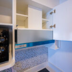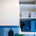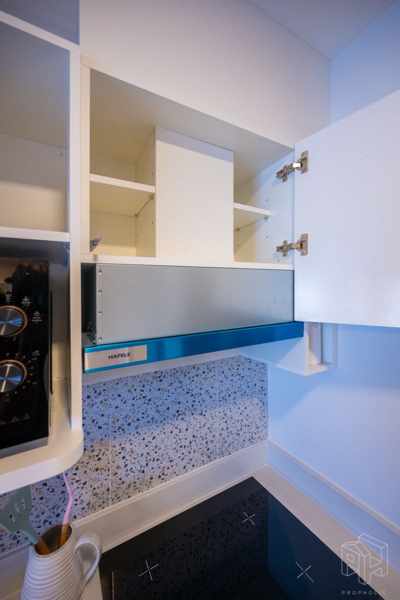 ชั้นเก็บของบิวต์อินเต็มผนังเพิ่มพื้นที่จัดเก็บ ทำให้ครัวดูเป็นระเบียบและใช้งานคล่องตัว