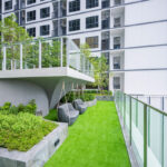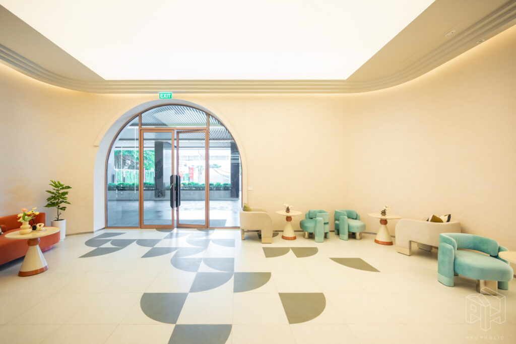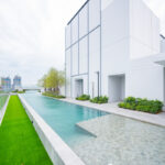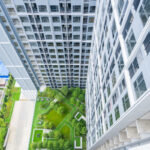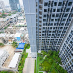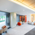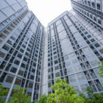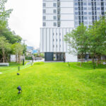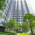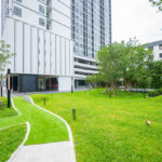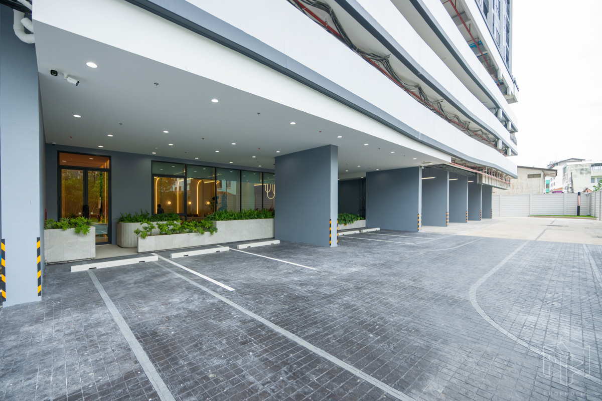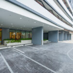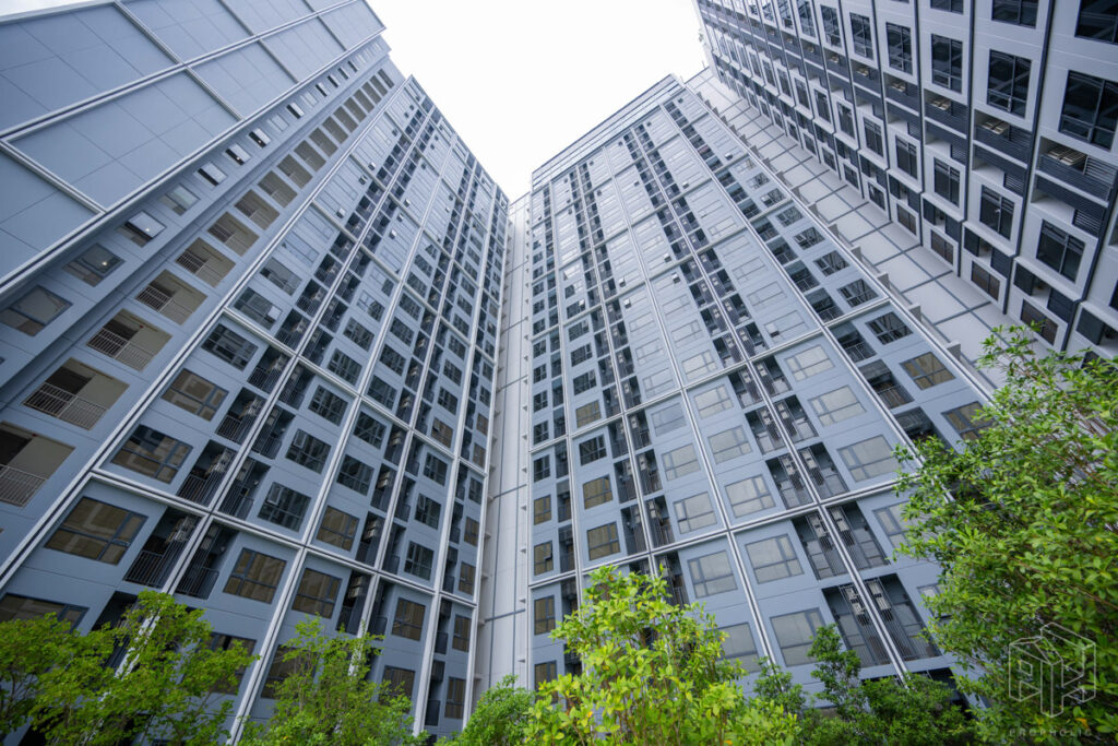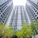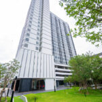 คอนโดมิเนียม High-Rise ดีไซน์โมเดิร์น โดดเด่นเป็นสง่า พร้อมทางเข้าออกที่ดูเป็นระเบียบและปลอดภัย