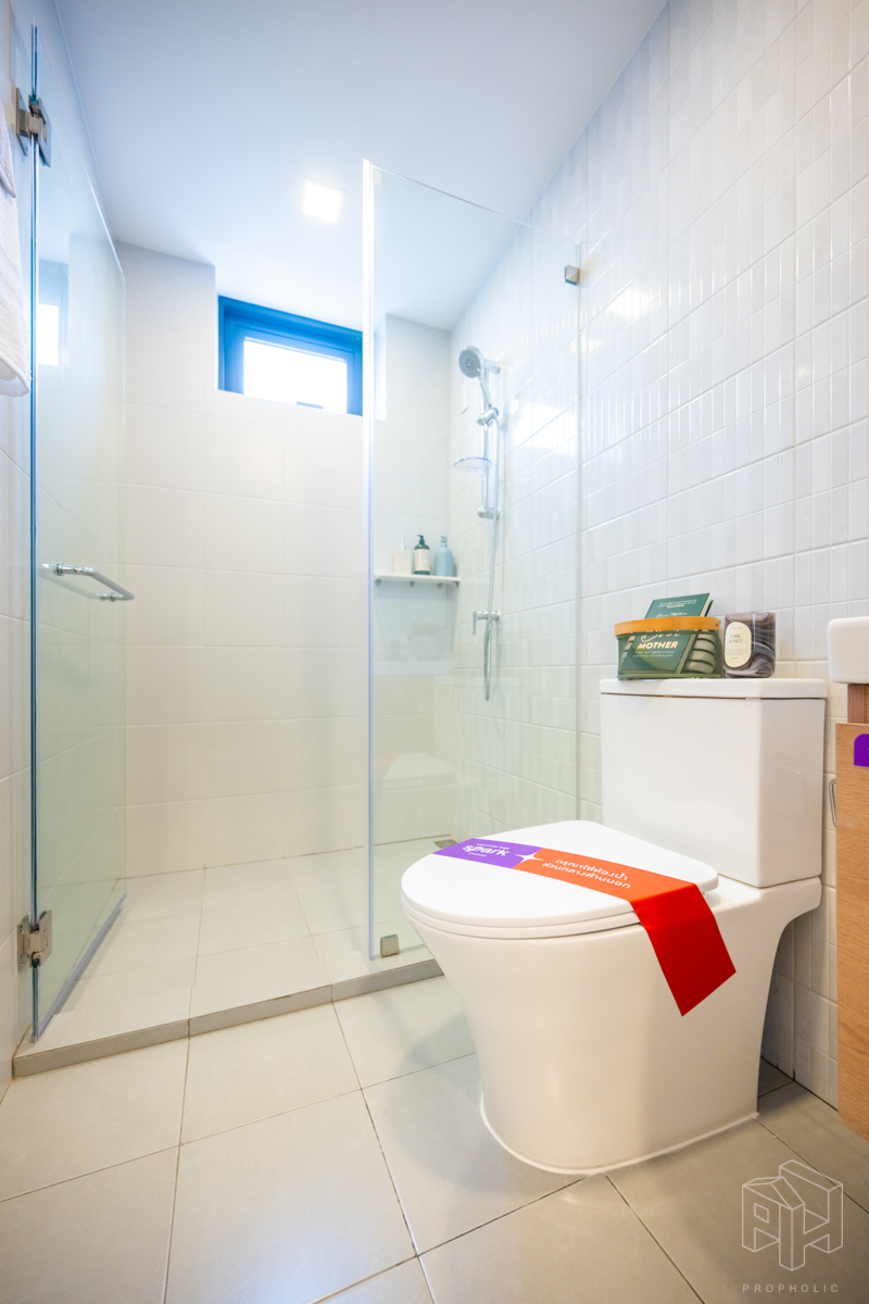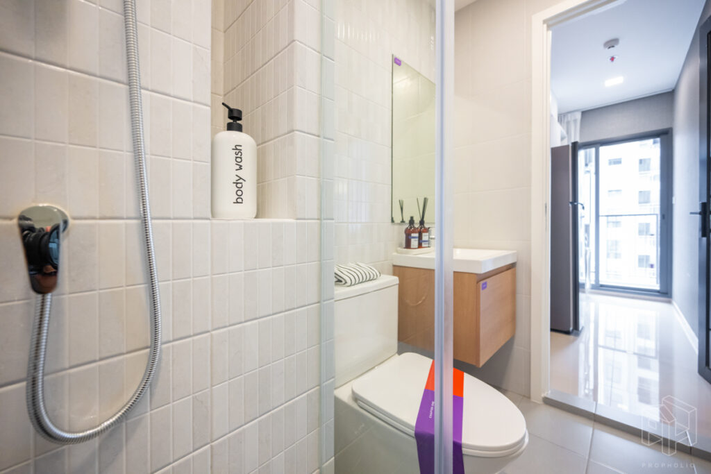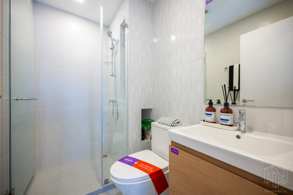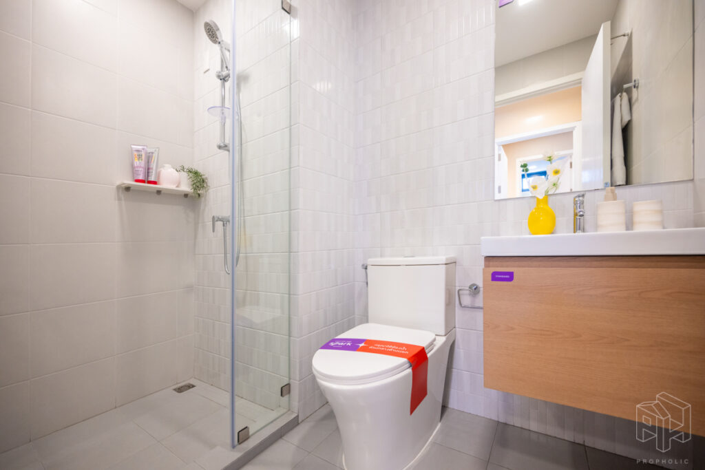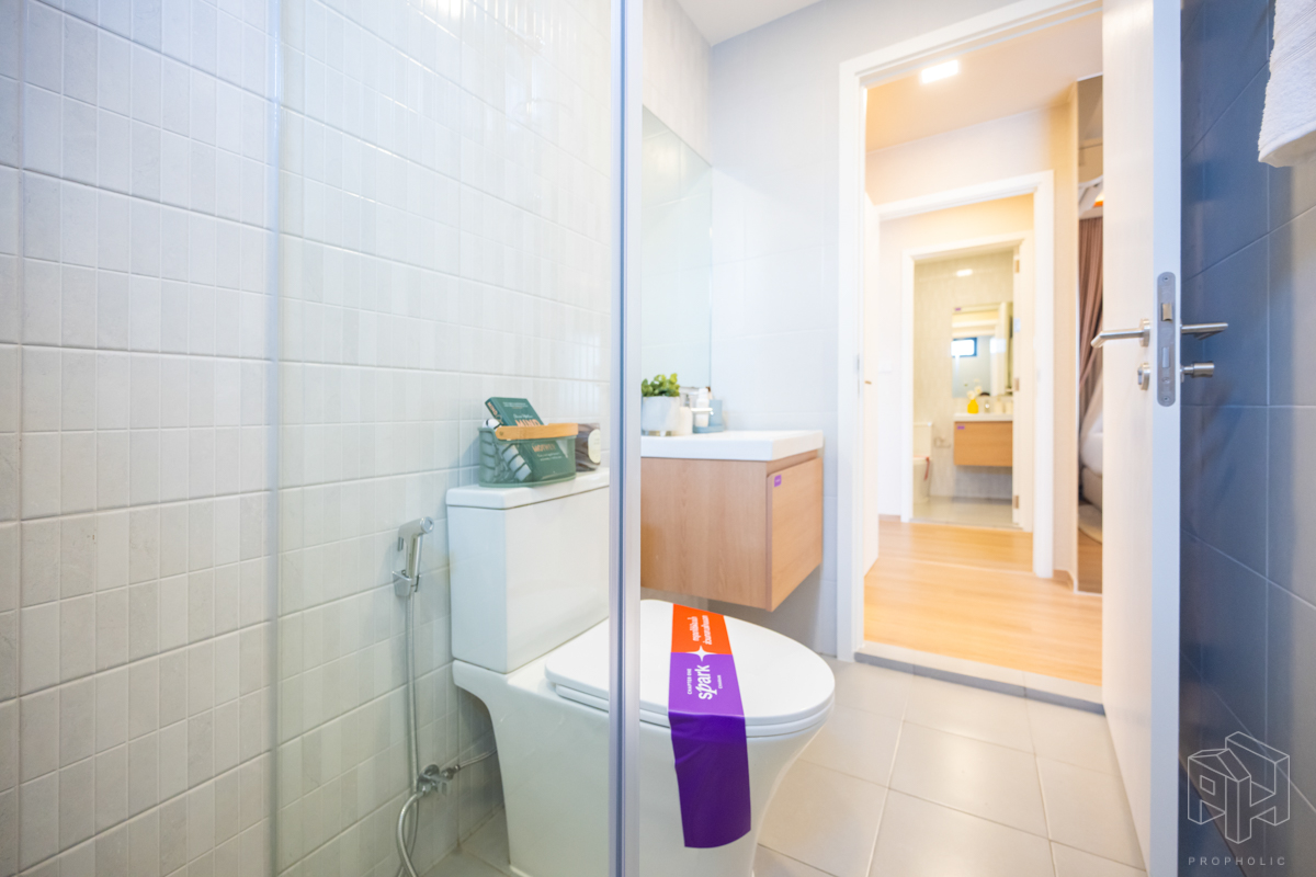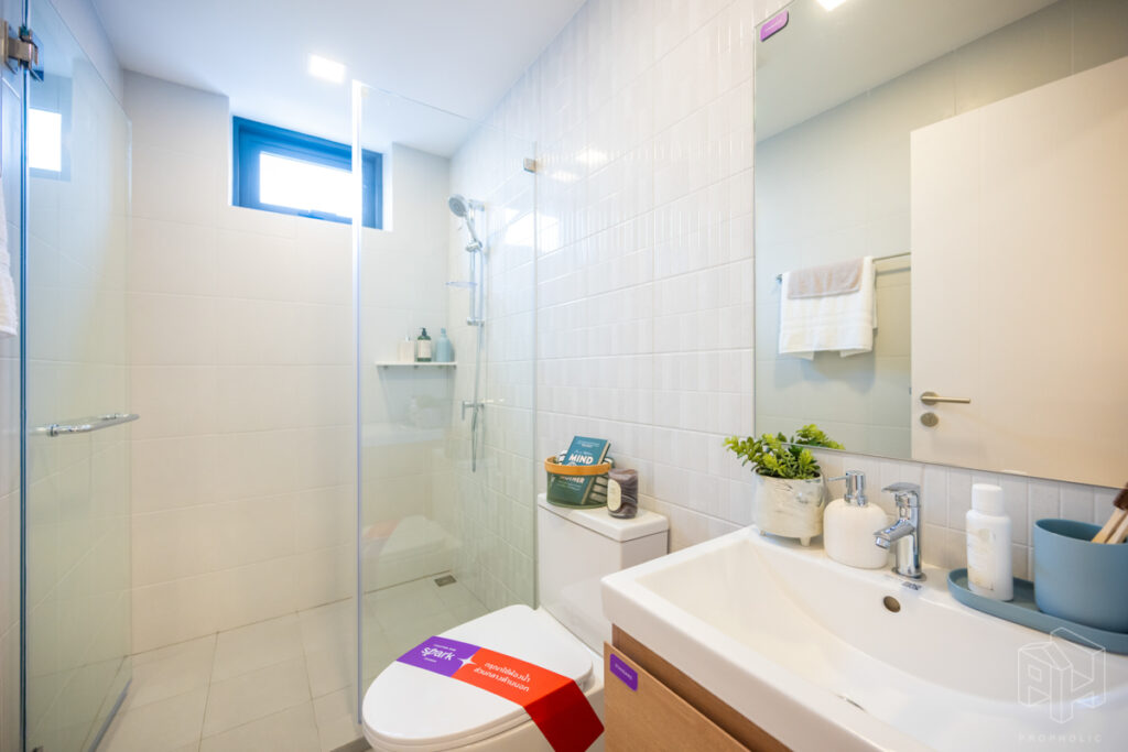 ห้องน้ำแยกโซนชัดเจนพร้อมช่องแสงธรรมชาติ ช่วยลดความอับชื้น สามารถติดตั้งฉากกั้นอาบน้ำเพิ่มได้