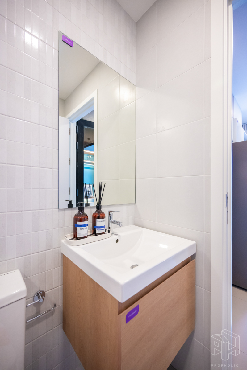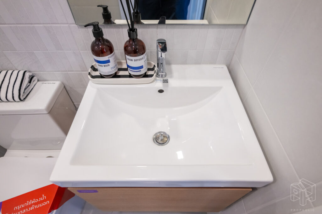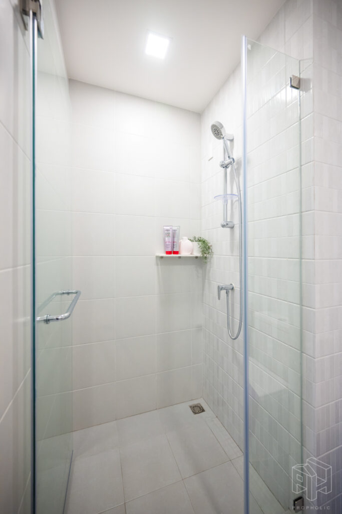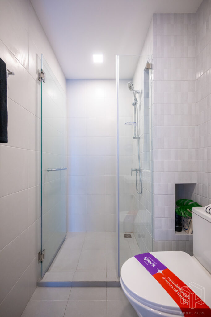 ห้องน้ำแยกโซนเปียกและแห้ง ใช้งานสะดวกและช่วยให้พื้นที่ดูกว้างกว่าเดิม ส่วนฉากกั้นอาบน้ำต้องติดตั้งเอง