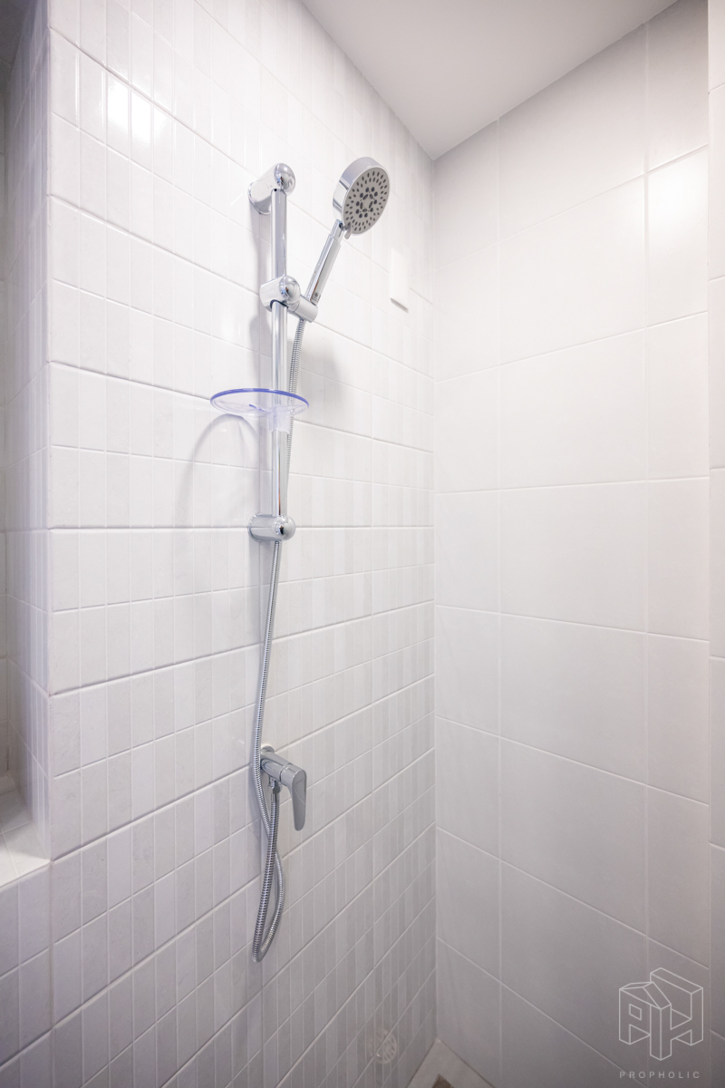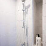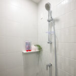 ฝักบัวแบบเลื่อนขึ้นลงได้ ติดผนังพร้อมชั้นวางในตัว ใช้งานสะดวก