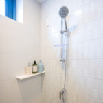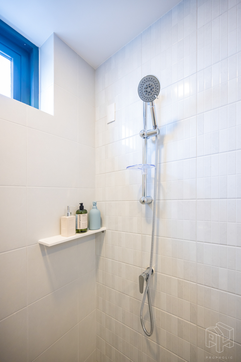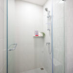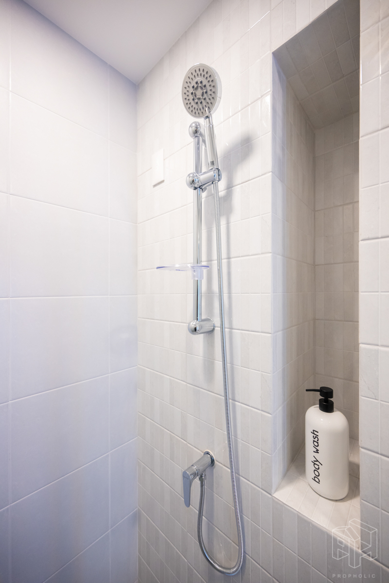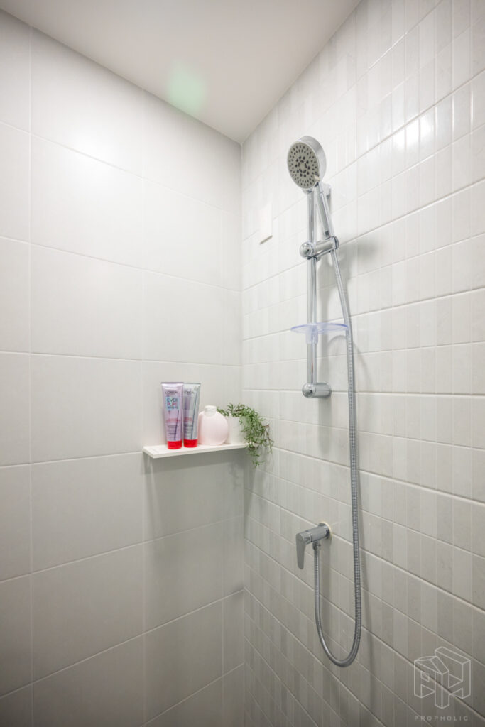 ฝักบัวพร้อมชั้นวางในตัวช่วยให้หยิบใช้ของอาบน้ำง่าย