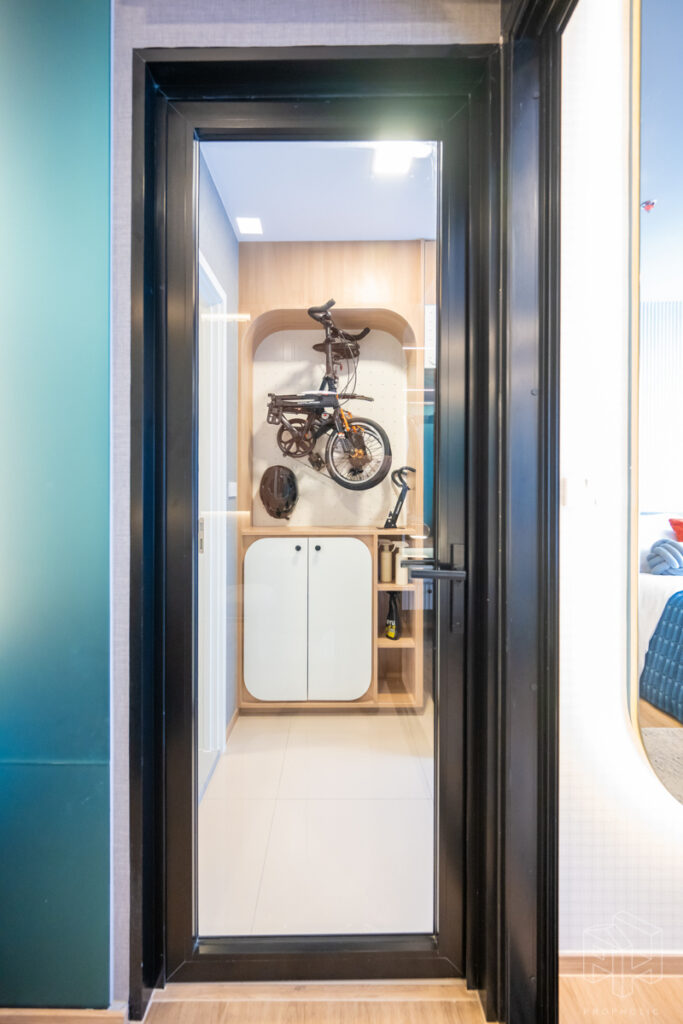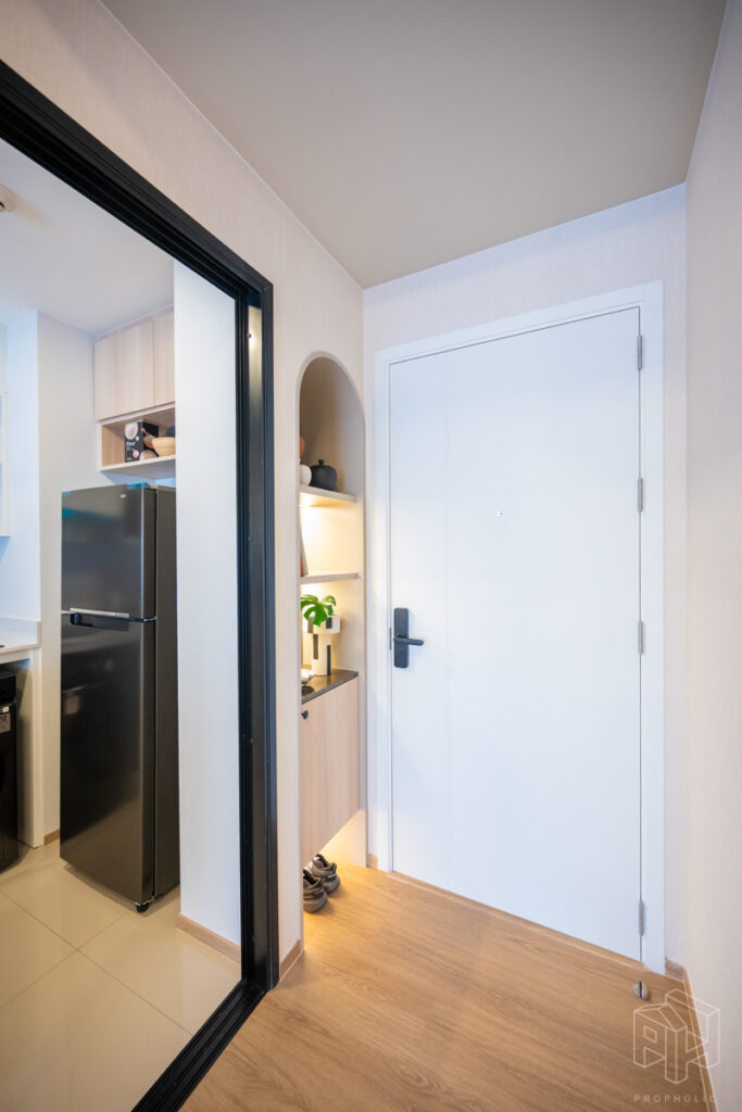 เปิดห้องเข้ามา พบกับชั้นโชว์กรุไฟซ่อนเพิ่มบรรยากาศพรีเมียม ทำให้โถงทางเดินดูสว่างและมีดีเทลทันทีที่เข้าห้อง