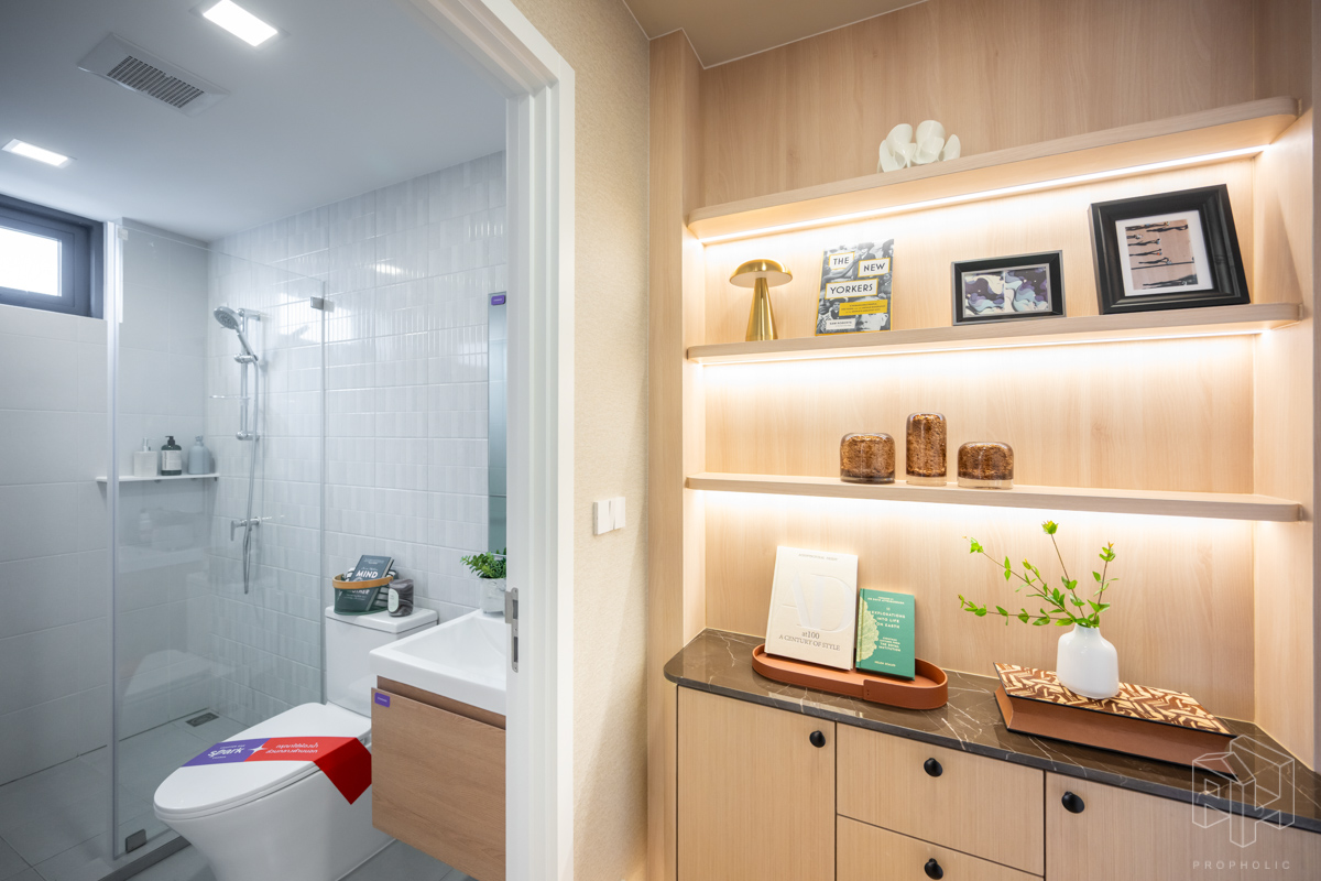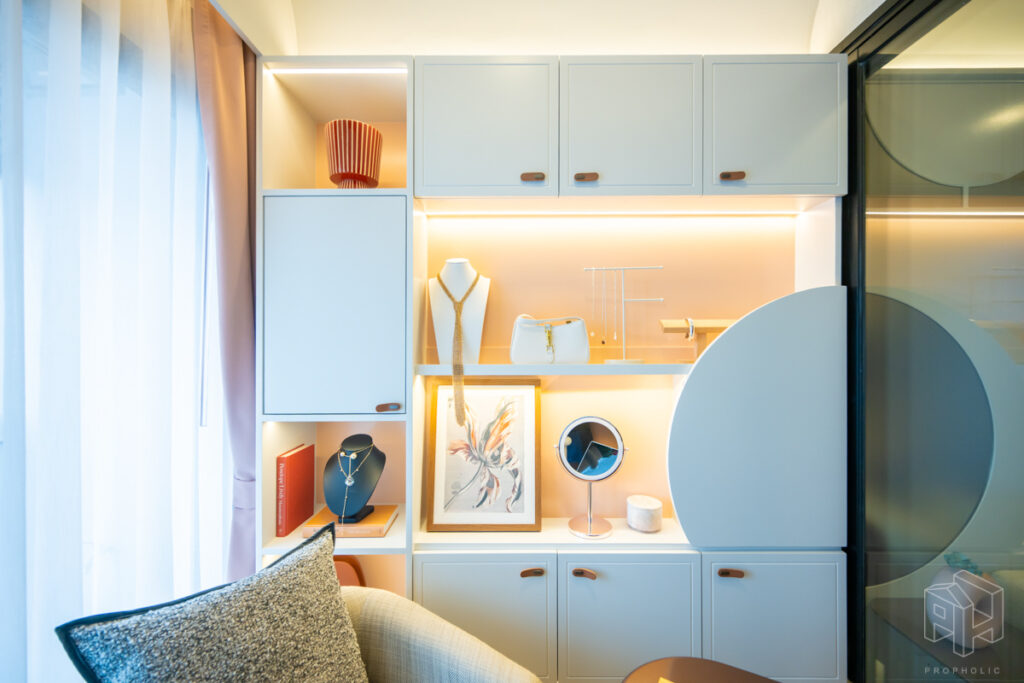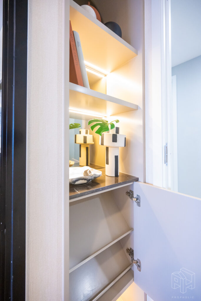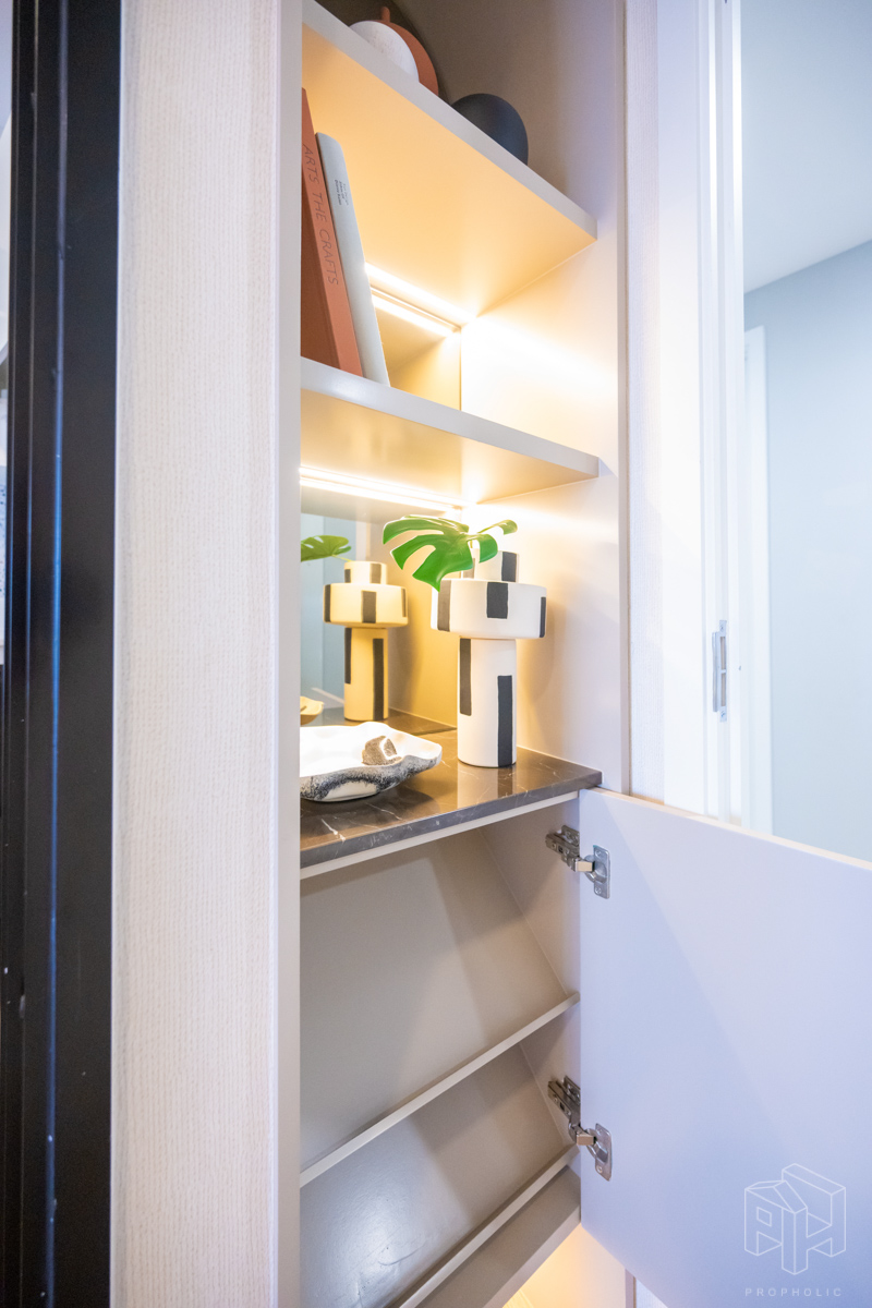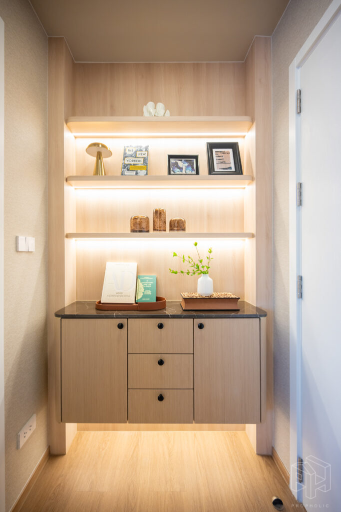 มุมเก็บของดีไซน์สวย พร้อมไฟ Warm Light ให้ความรู้สึกอบอุ่นน่าใช้งาน