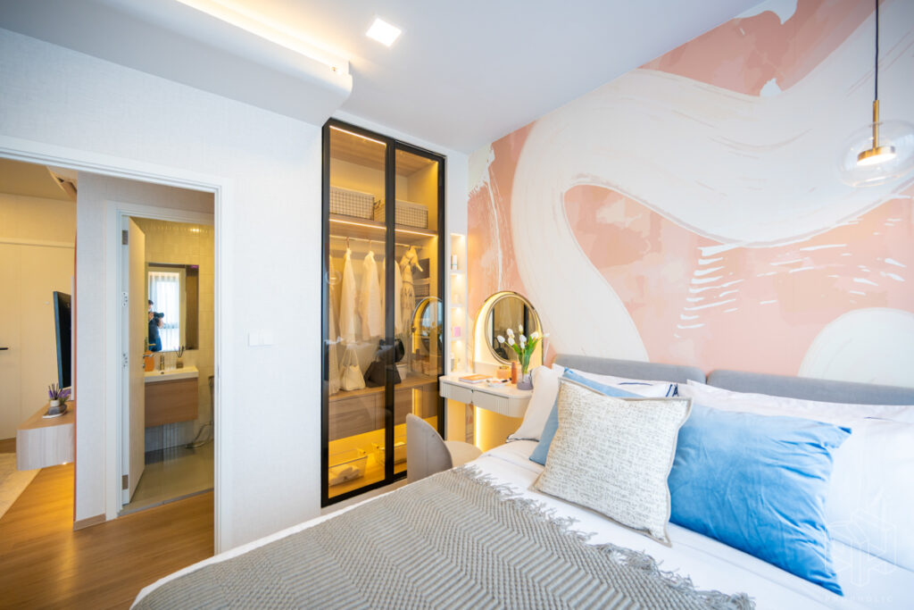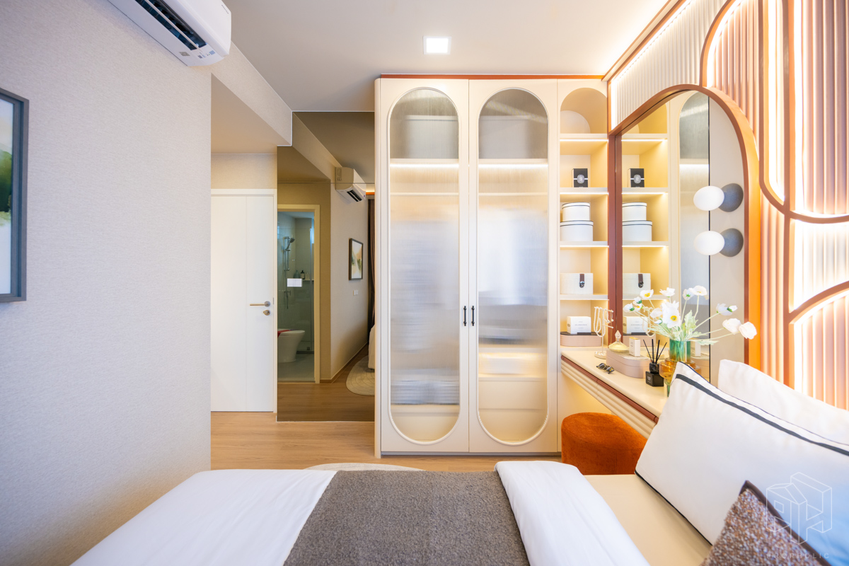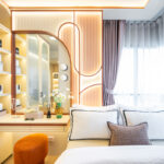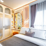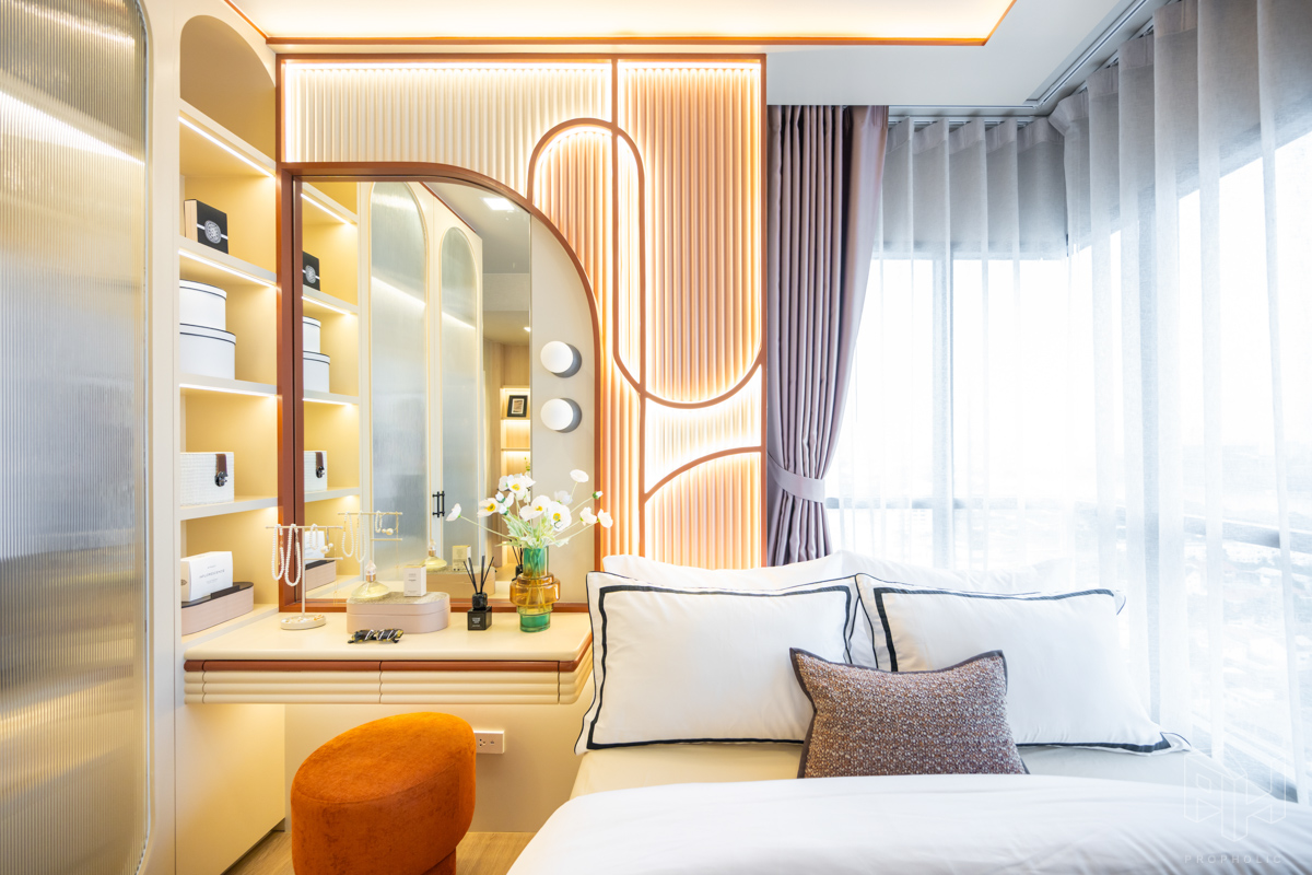 ตัวอย่างการตกแต่งห้องนอนดีไซน์ Luxury Curved พร้อมตู้เสื้อผ้าและโต๊ะเครื่องแป้ง Built-in ครบชุด