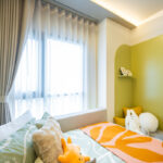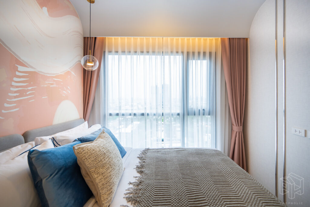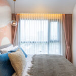 ตัวอย่างการตกแต่งห้องนอนรับแสงธรรมชาติ ผ้าม่านสองชั้น ปรับบรรยากาศได้ตามต้องการ