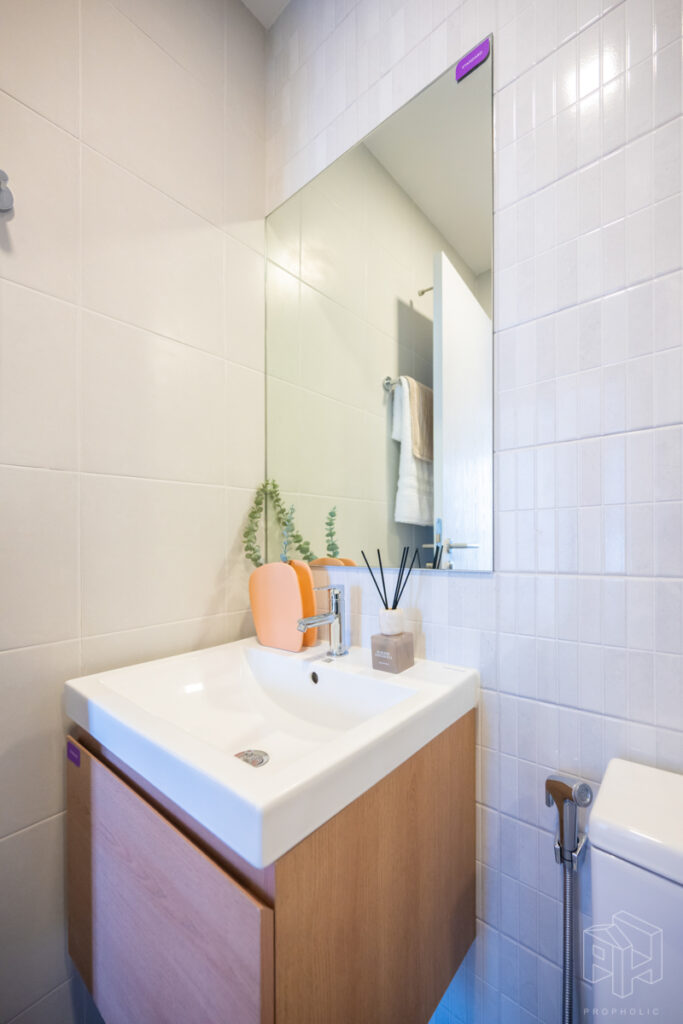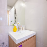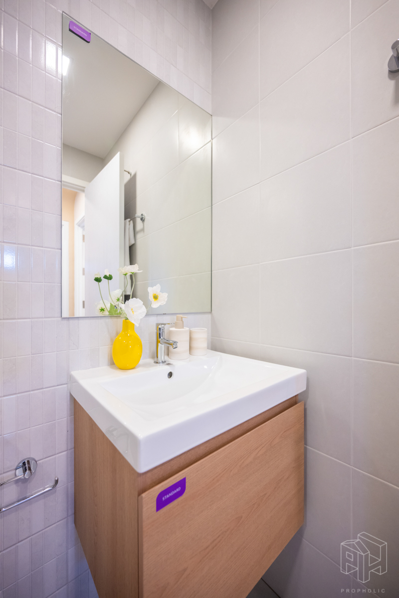 อ่างล้างหน้าพร้อมกระจกเงา ช่วยเพิ่มมิติให้ห้องน้ำดูใหญ่และสว่างขึ้น