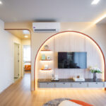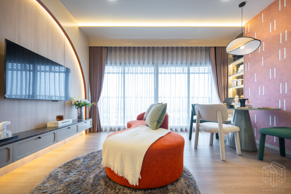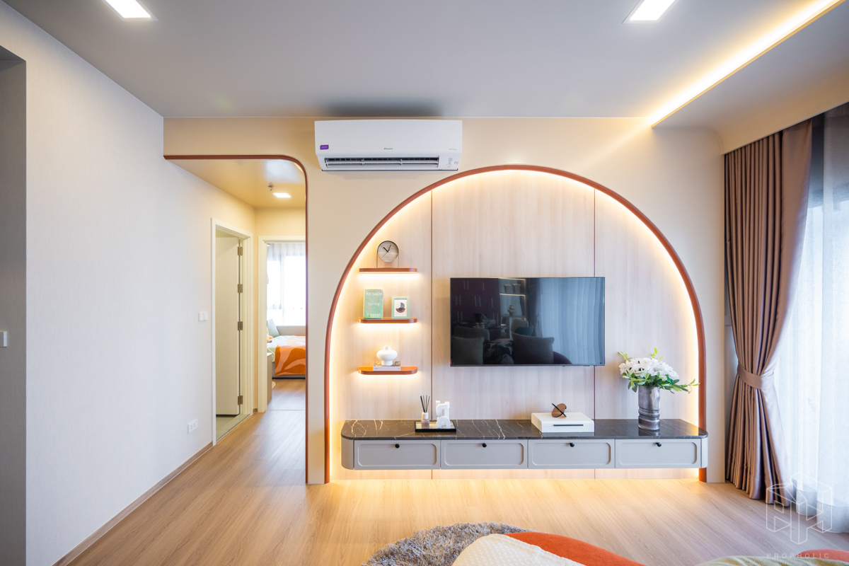 ตัวอย่างผนังทีวีโค้งพร้อมไฟซ่อนช่วยสร้างมิติให้ห้องนั่งเล่นดูพรีเมียมและอบอุ่นขึ้นทันที