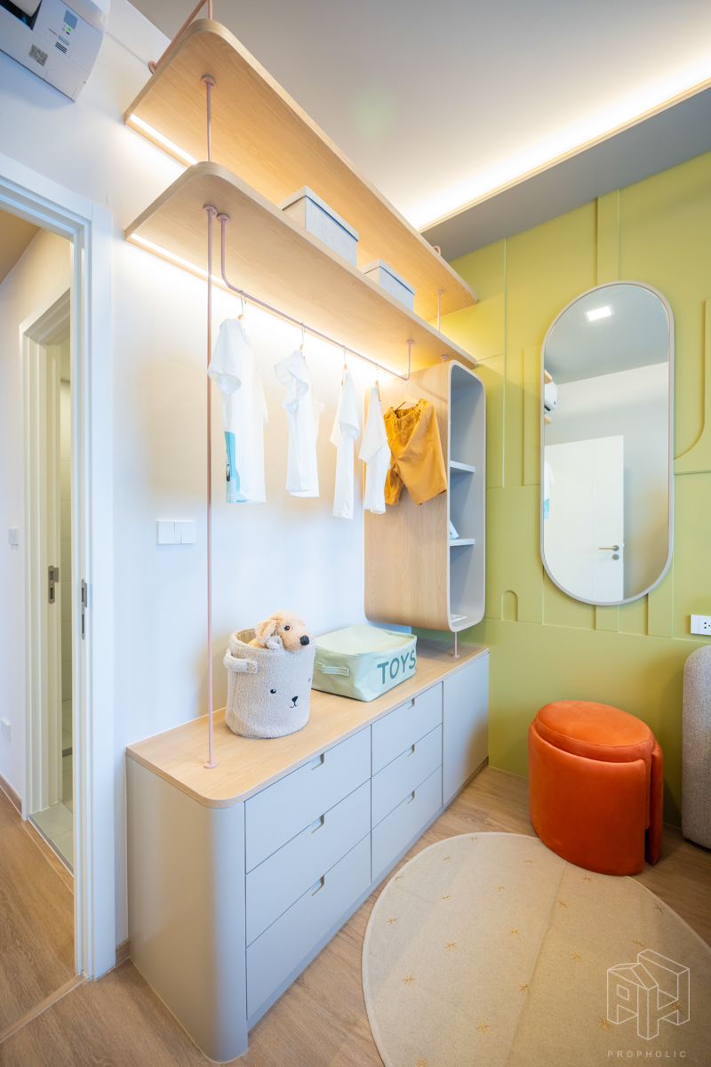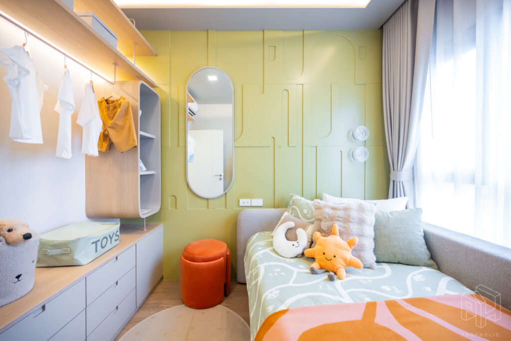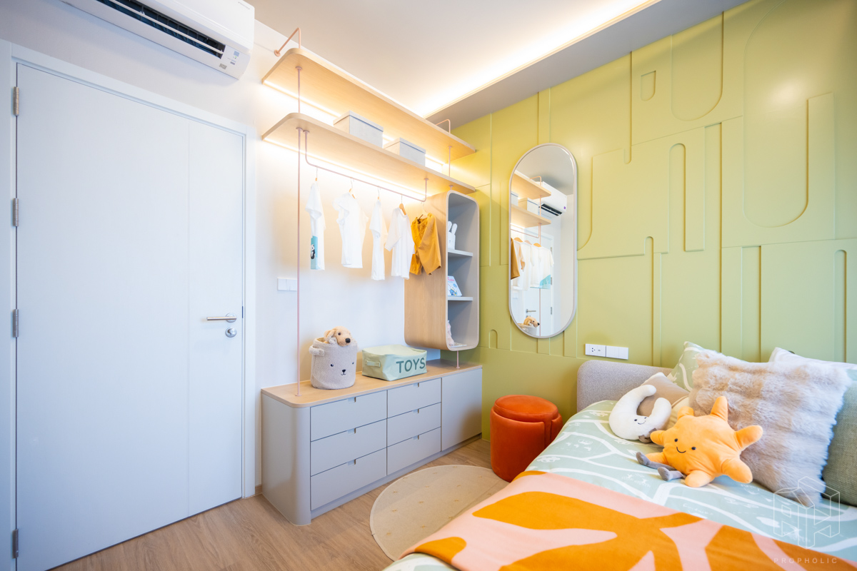 ผนังตกแต่งพร้อมชั้นวางช่วยเก็บของเล่นและอุปกรณ์ต่าง ๆ