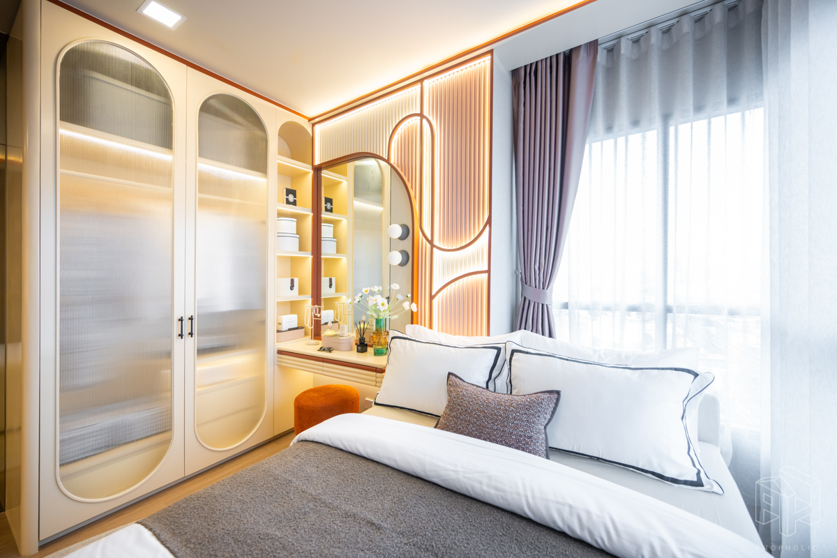 ในห้องนอน Master Bedroom สามารถตกแต่งเป็น มุมแต่งตัวสุดหรู ดีไซน์โค้งมนโดดเด่น เคียงคู่หน้าต่างรับแสงธรรมชาติเต็มที่