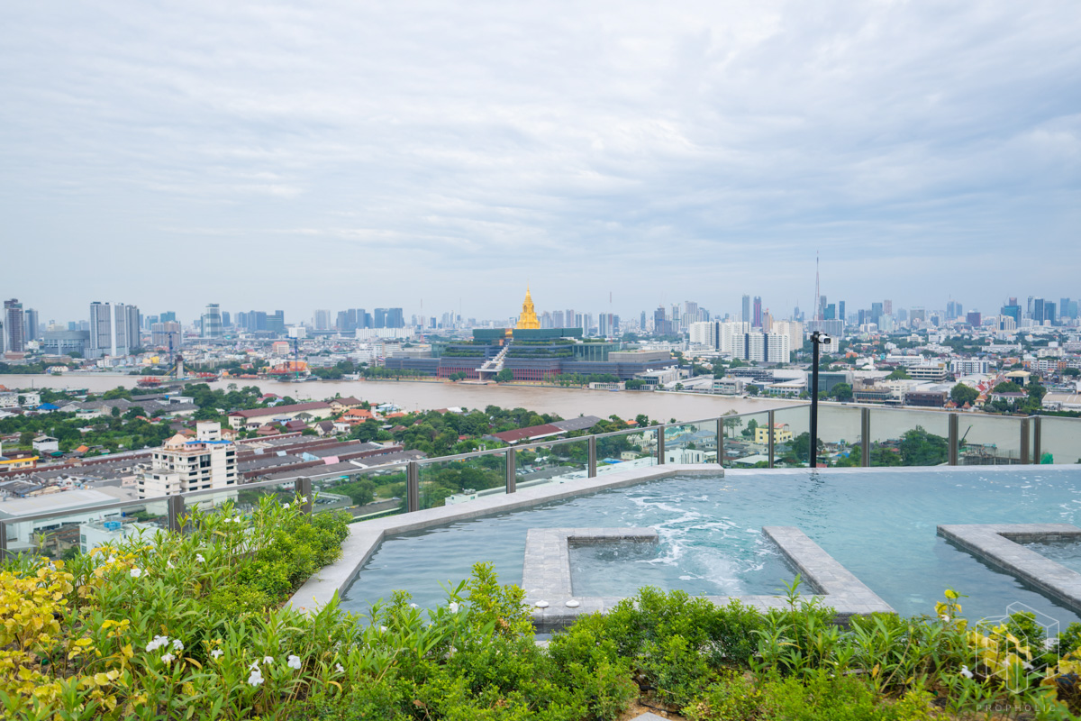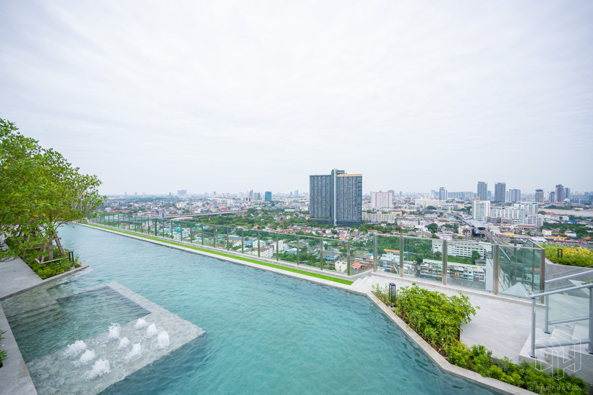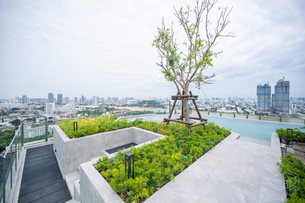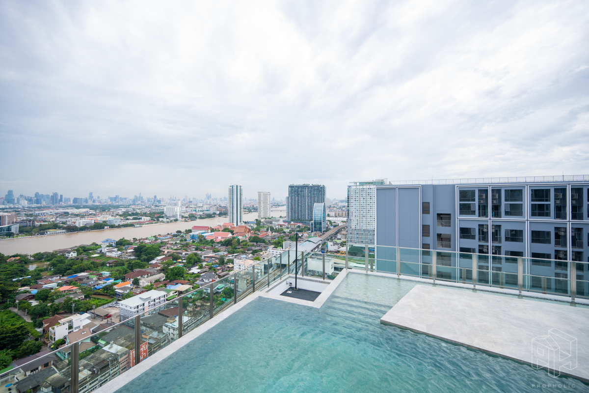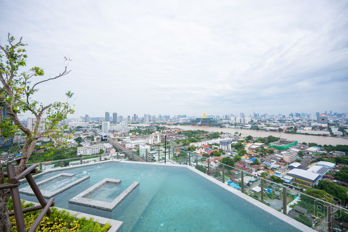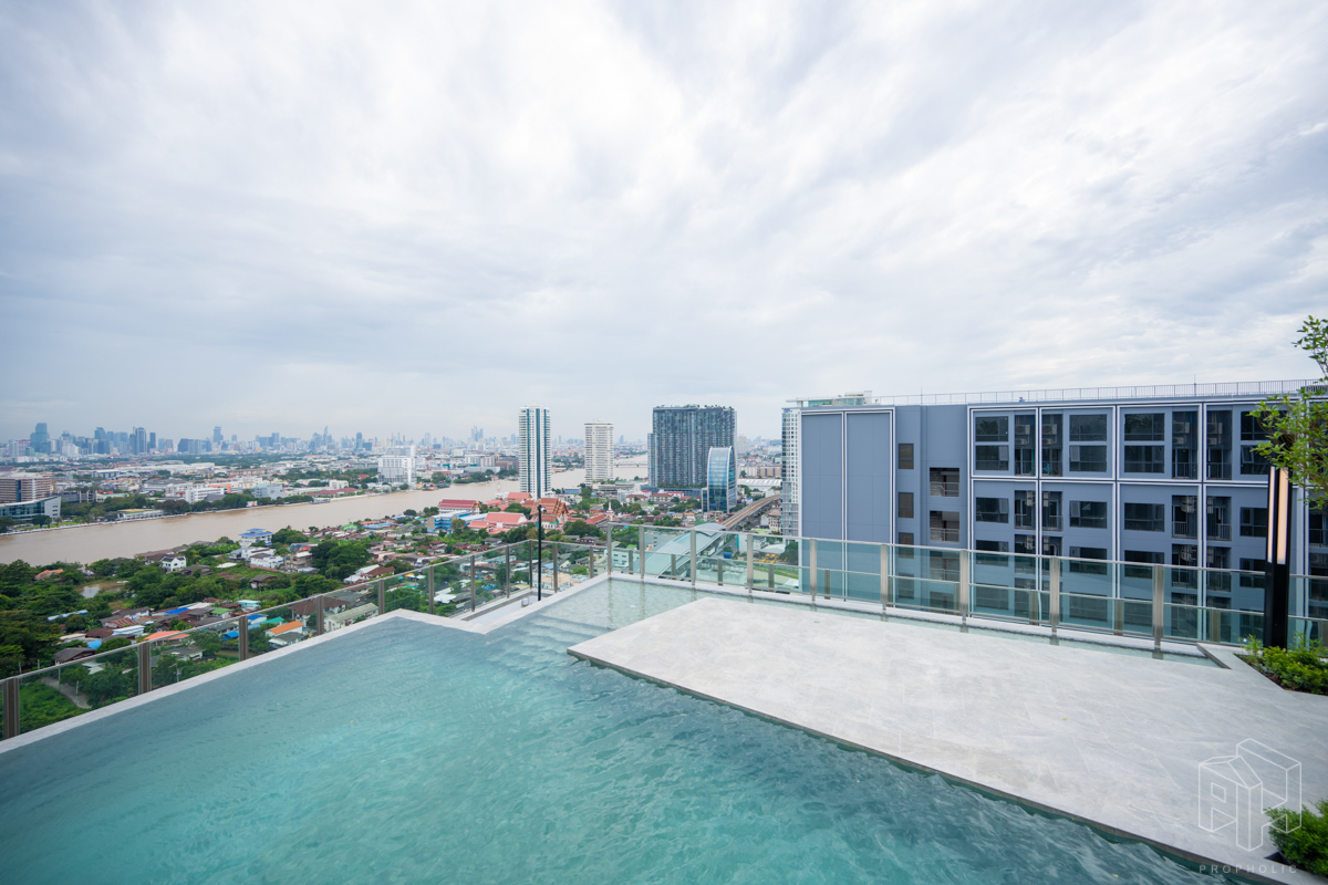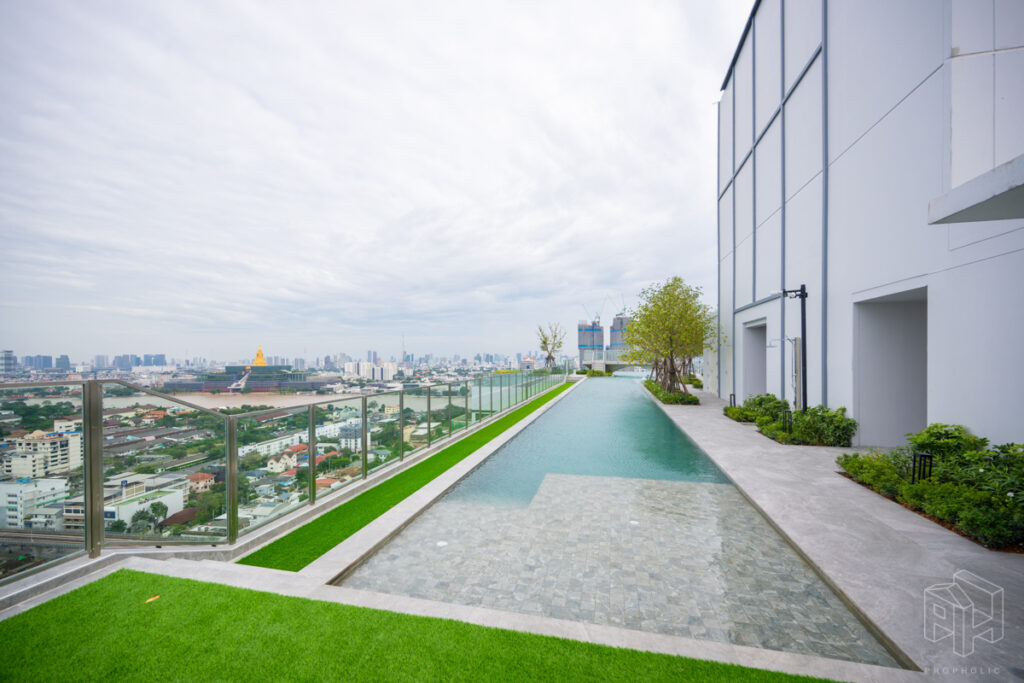 บนชั้นดาดฟ้าของอาคาร บรรยากาศของความเป็น “คอนโดวิวแม่น้ำ” ยิ่งเด่นชัดขึ้นไปอีก สระว่ายน้ำยาวกว่า 50 เมตร ทอดตัวไปมองเห็นเส้นขอบน้ำที่ไหลเรื่อย เหมือนต่อเนื่องกับตัวสระ Sky Fitness ที่มีกระจกบานใหญ่เปิดรับวิว และพื้นที่ลอยฟ้าที่ถูกออกแบบให้เป็นจุดพักผ่อนจริงจังมากกว่าพื้นที่สวยงามเพื่อโชว์ ภาพจริงจากชั้นนี้ในวันที่ฟ้าใส หรือวันที่แสงพระอาทิตย์กำลังลับเส้นน้ำคือสิ่งที่ยากจะหาได้ในคอนโดราคาใกล้เคียงกันในย่านนี้ หรือแม้แต่คอนโดหลายแห่งในโซนใจกลางเมืองเองก็ไม่สามารถมอบทิวทัศน์แบบนี้ในระดับราคาเดียวกันได้