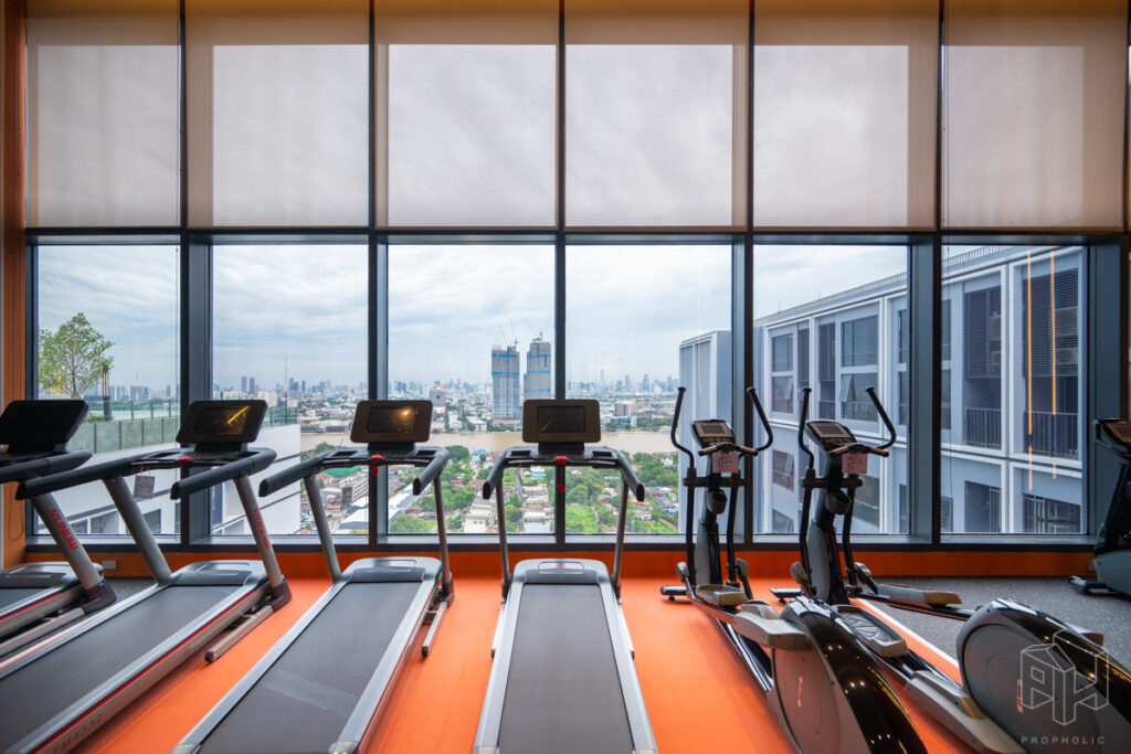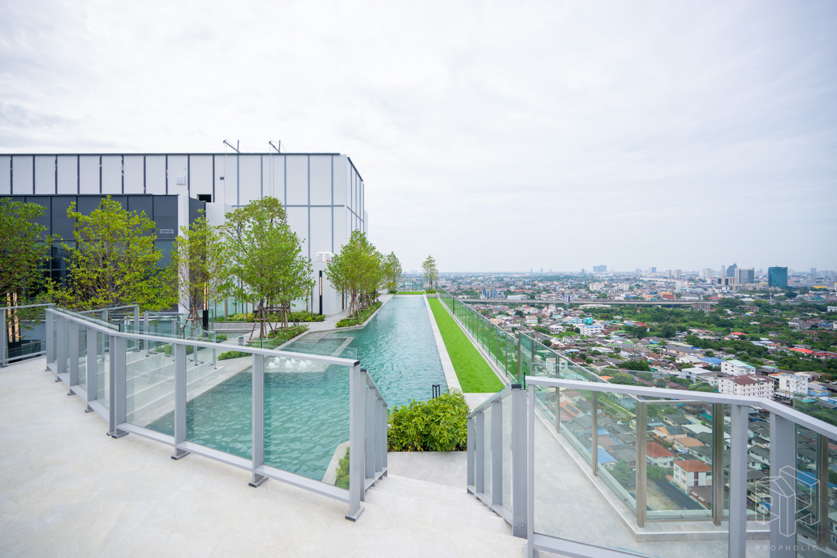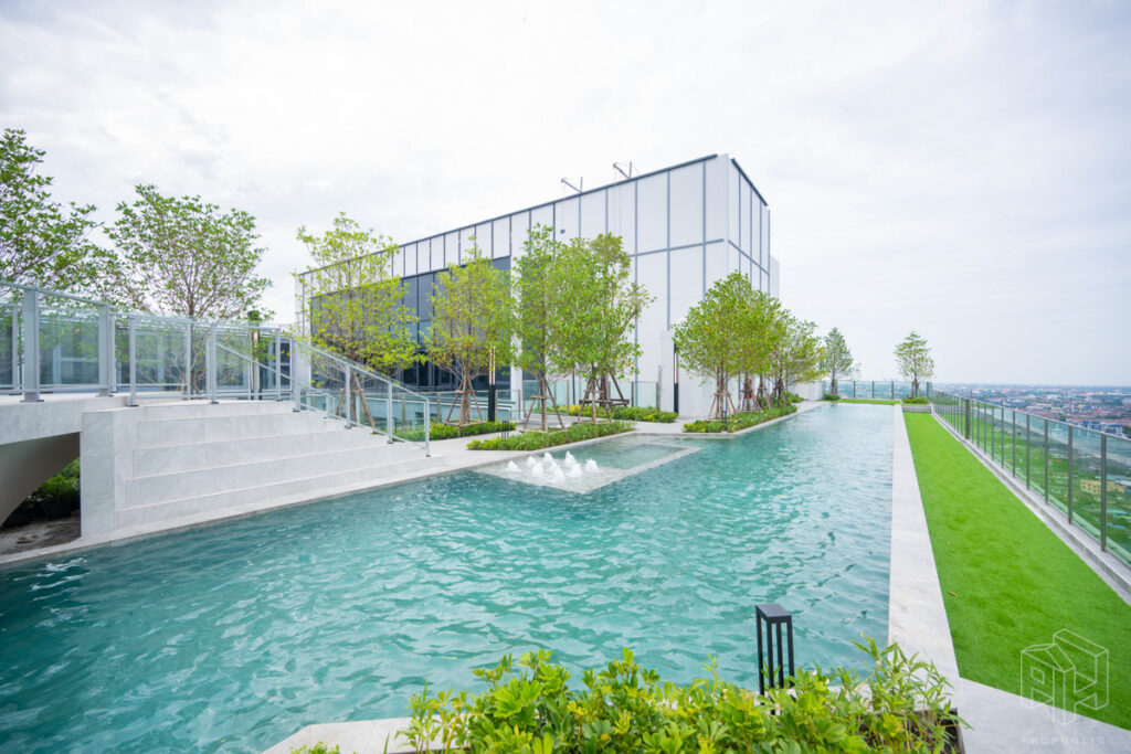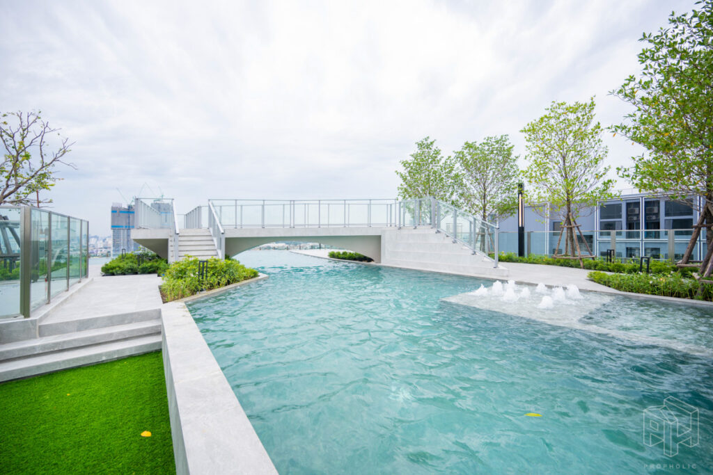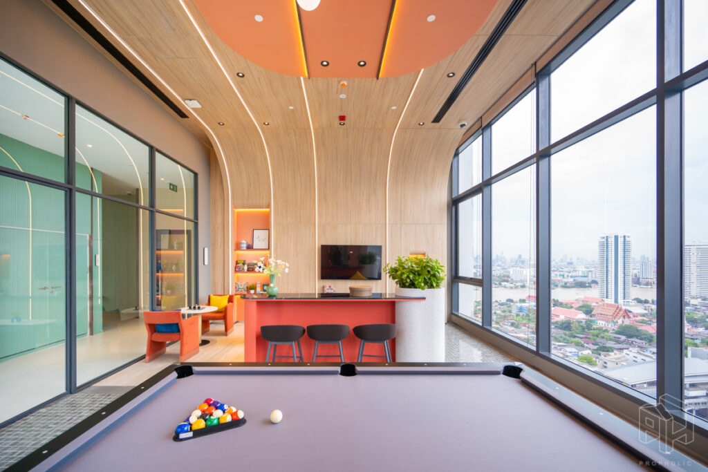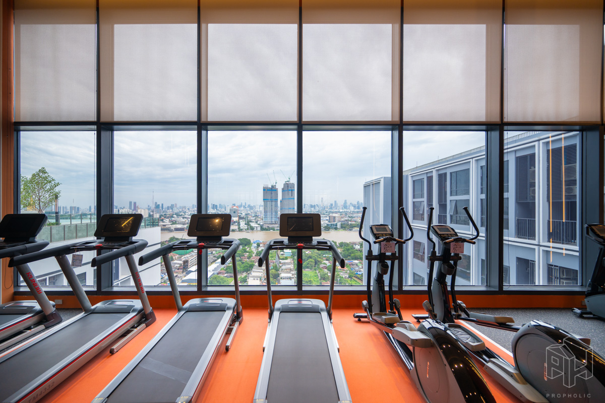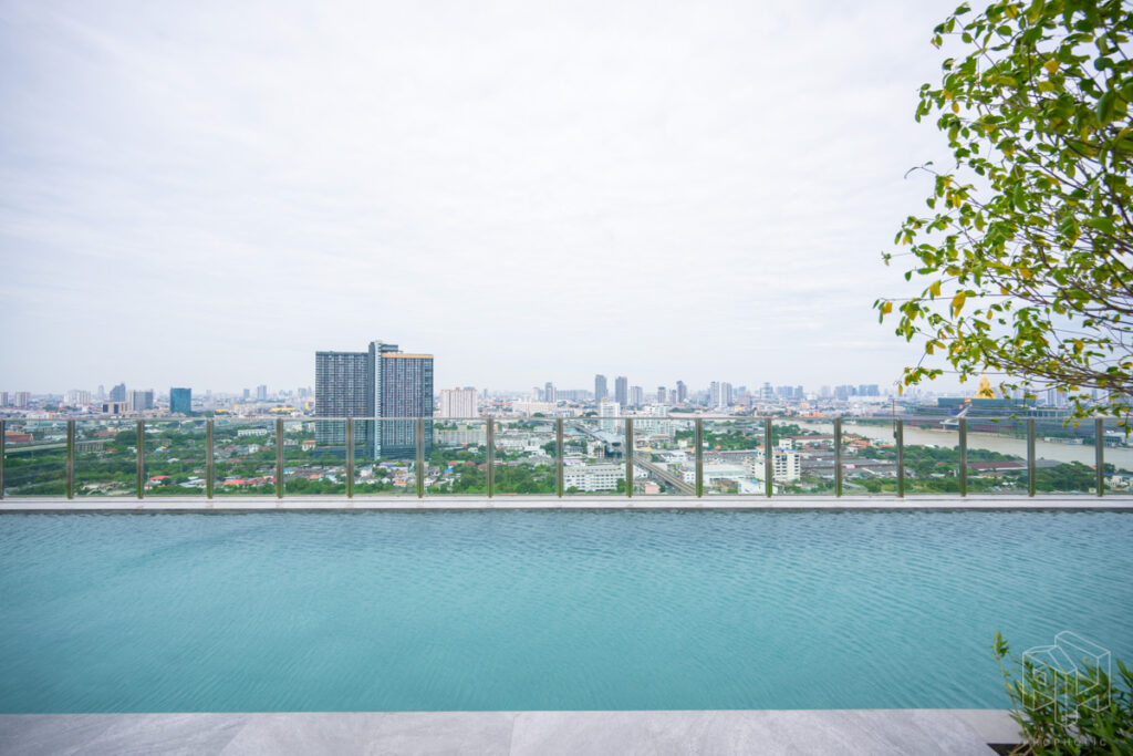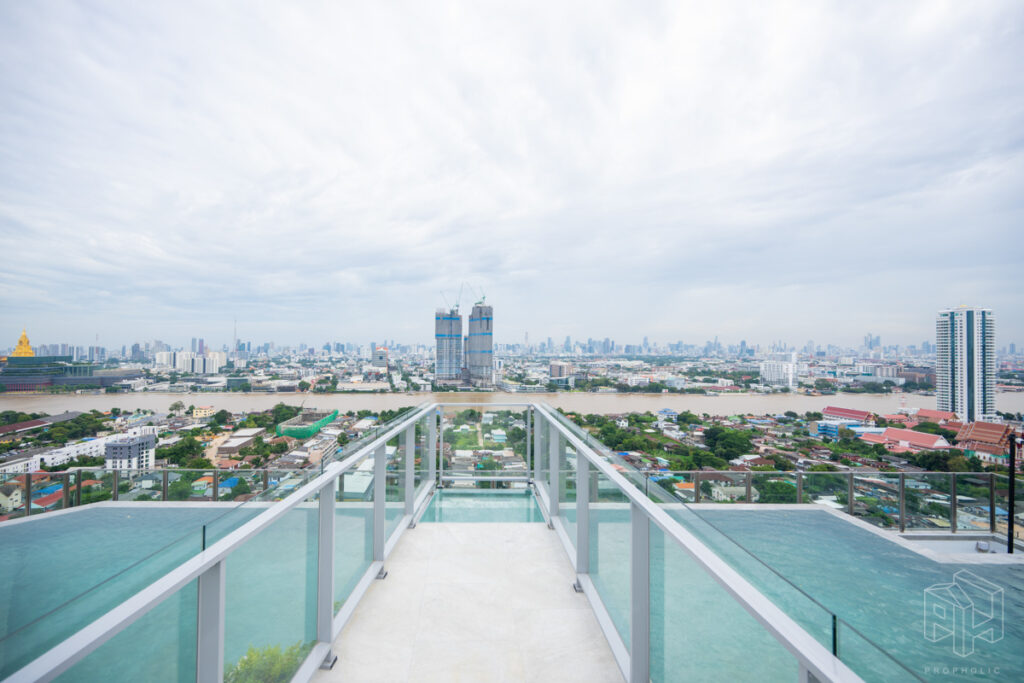 บนชั้นดาดฟ้าของอาคาร บรรยากาศของความเป็น “คอนโดวิวแม่น้ำ” ยิ่งเด่นชัดขึ้นไปอีก สระว่ายน้ำยาวกว่า 50 เมตร ทอดตัวไปมองเห็นเส้นขอบน้ำที่ไหลเรื่อย เหมือนต่อเนื่องกับตัวสระ Sky Fitness ที่มีกระจกบานใหญ่เปิดรับวิว และพื้นที่ลอยฟ้าที่ถูกออกแบบให้เป็นจุดพักผ่อนจริงจังมากกว่าพื้นที่สวยงามเพื่อโชว์ ภาพจริงจากชั้นนี้ในวันที่ฟ้าใส หรือวันที่แสงพระอาทิตย์กำลังลับเส้นน้ำคือสิ่งที่ยากจะหาได้ในคอนโดราคาใกล้เคียงกันในย่านนี้ หรือแม้แต่คอนโดหลายแห่งในโซนใจกลางเมืองเองก็ไม่สามารถมอบทิวทัศน์แบบนี้ในระดับราคาเดียวกันได้