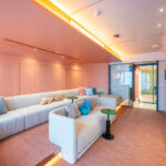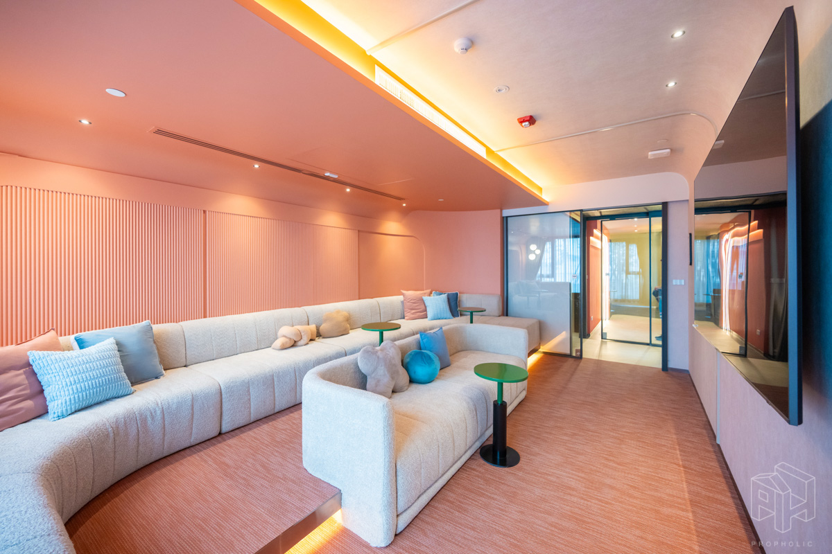 หน้าต่างสูงเกือบเต็มผนังเปิดรับแสงธรรมชาติ ทำให้โซนนั่งเล่นโปร่งโล่งและเหมาะกับการพักผ่อน