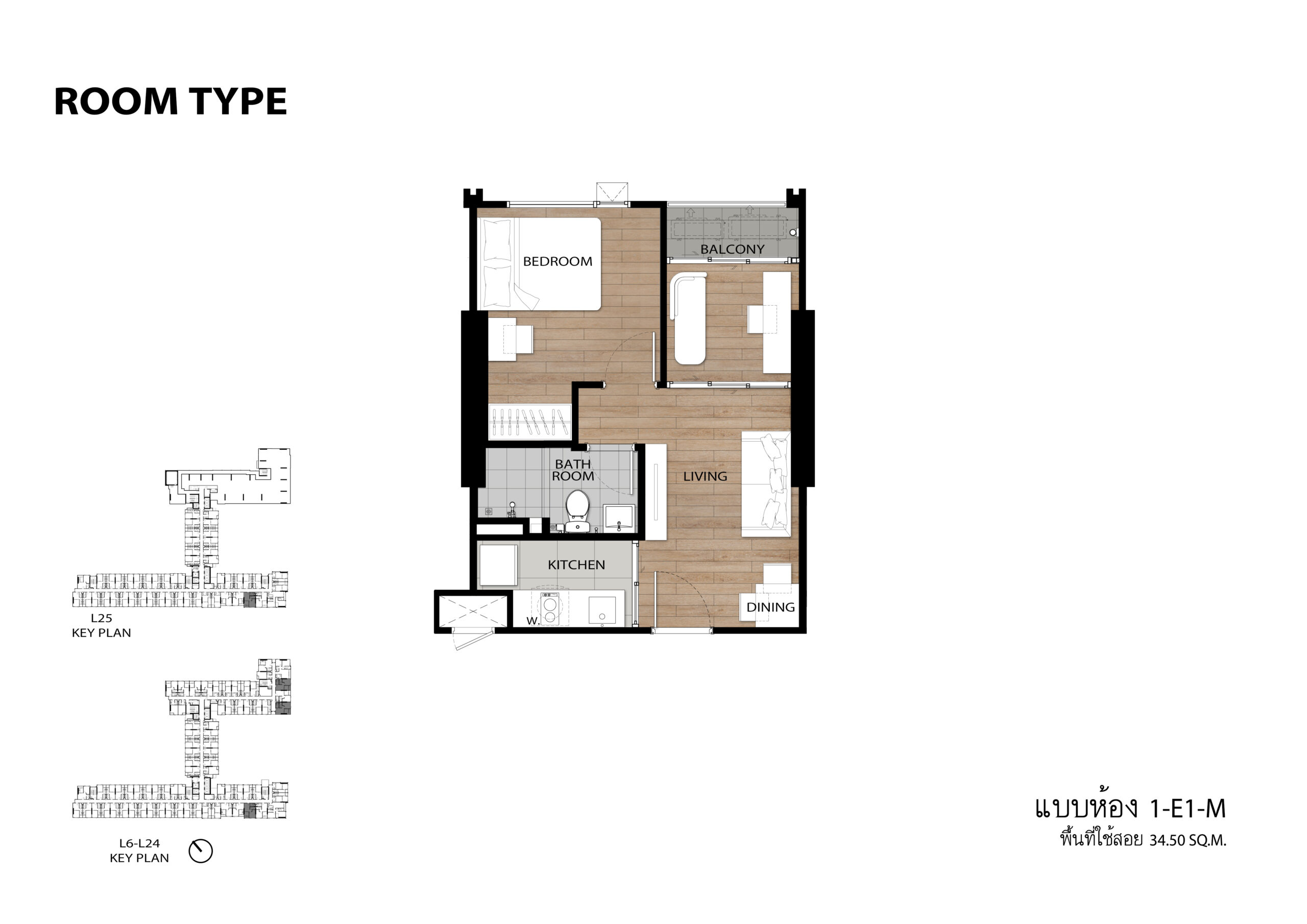 (A) 22.00-23.75 ตร.ม., (B) 26.00-27.00 ตร.ม., (C) 28.00-28.75 ตร.ม., (D) 30.00-30.75 ตร.ม., 1 Bedroom Plus 34.50 ตร.ม.