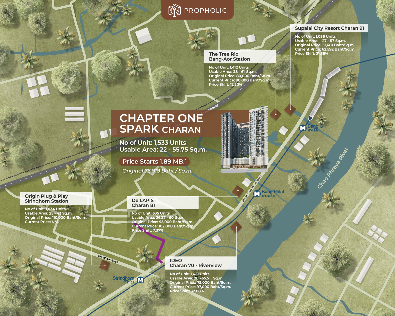 จากทำเลโซนจรัญฯ แล้วมีคอนโดมิเนียมเพื่อนบ้านอย่างเช่น The Tree Rio Bang-Aor Station ที่เป็น High-rise สร้างเสร็จเมื่อหลายปีมาก่อน, Supalai City Resort Charan 91 เป็นคอนโด Low rise อยู่ในซอยย่อย , Origin Plug & Play Sirindhorn Station เป็นตึกสูง อยู่ห่างจากโซนแม่น้ำออกไปหน่อย, De Lapis Charan 81 ที่อยู่ใกล้รถไฟฟ้าบางพลัด สร้างเสร็จหลายปี, Ideo Charan 70 – Riverview ที่อยู่ฝั่งเดียวกับแม่น้ำ