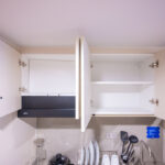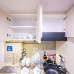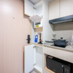ถัดมาเป็นส่วนครัวที่อยู่ตรงข้ามกับห้องน้ำ มีตู้เคาน์เตอร์ ตู้แขวน เตาไฟฟ้า ที่ดูดควันและชั้นวางไมโครเวฟ ตู้เคาน์เตอร์ครัวพร้อมอ่างล้างจานและตู้แขวนไว้เก็บของด้านบน ท็อปเคาน์เตอร์ครัวเป็นชิ้นเดียวยาวและมีส่วนกันเปื้อนที่ผนัง ให้เครื่องดูดควันและเตาไฟฟ้าจาก MEX เป็นครัวขนาดกะทัดรัด แต่ก็สามารถใช้ทำอาหารได้ทุกวัน