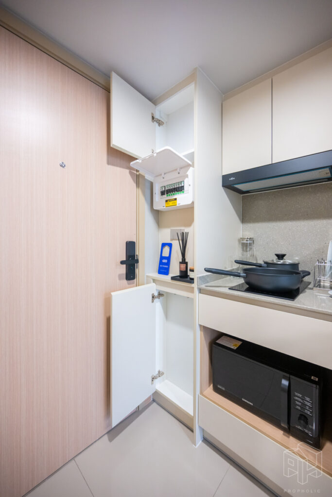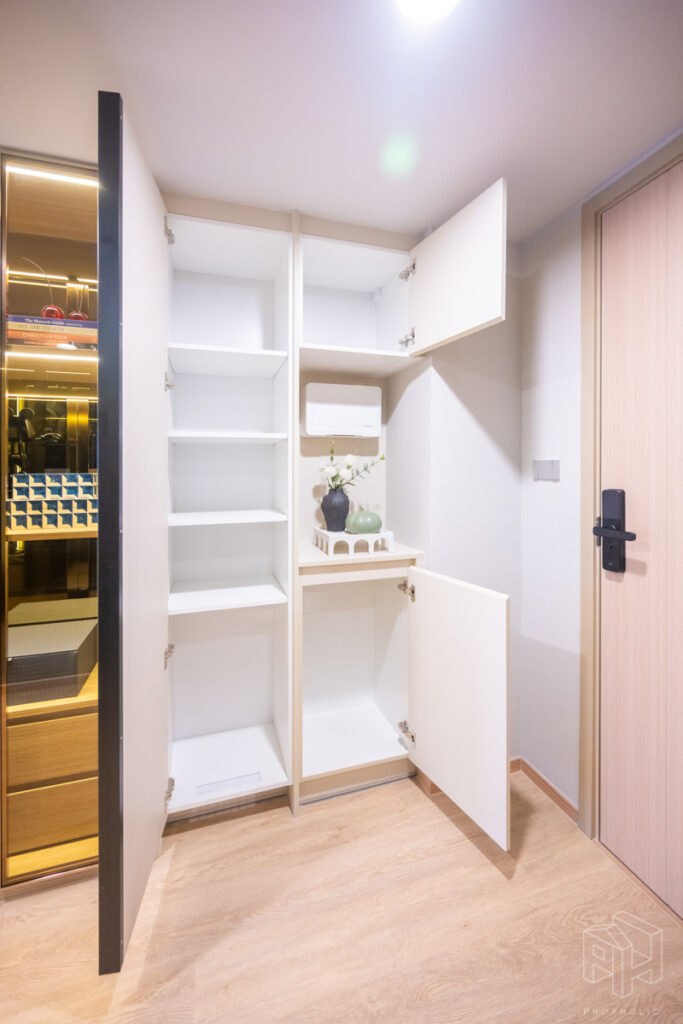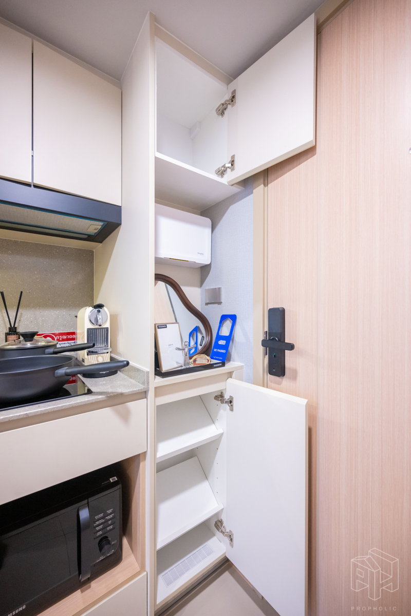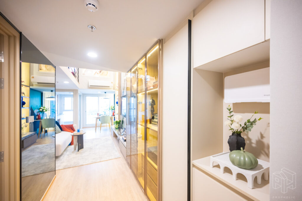 เข้ามาในห้องก็เป็นส่วนของ Foyer ที่มีชั้นวางรองเท้าและสามารถ Built-in ชั้นวางของ หรือตู้โชว์ไว้บริเวณนี้ได้ ประตูติดตั้ง Digital Door Lock ให้ทุกห้อง