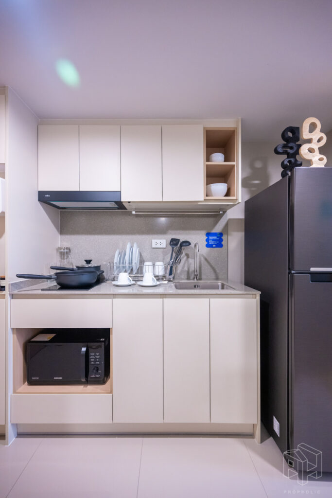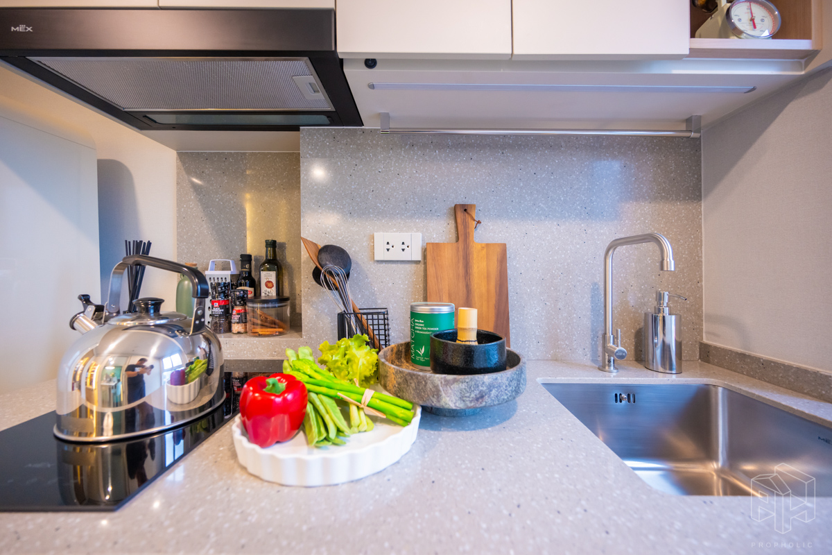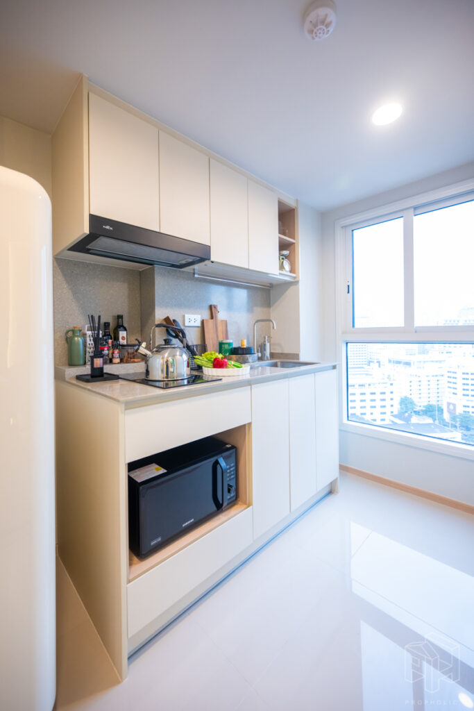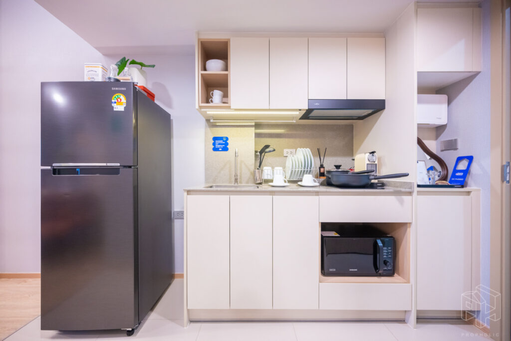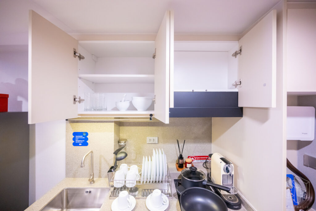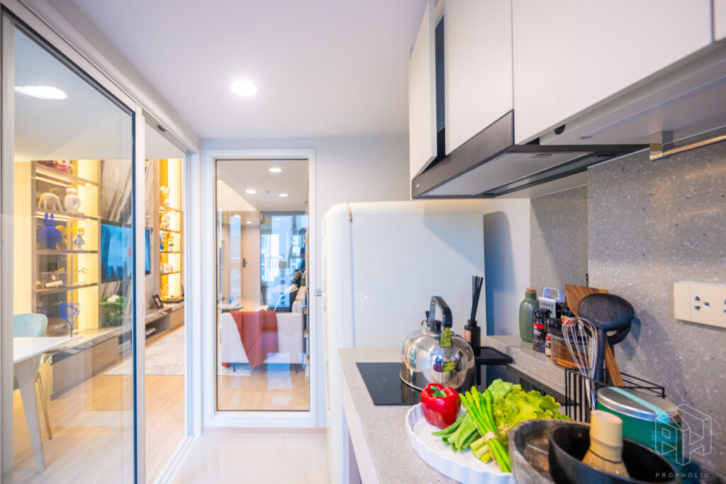 ครัวห้องนี้เป็นแบบปิดติดอากาศ มีพื้นที่กว้าง สามารถเข้ามาทำอาหารด้านในพร้อมกันได้หลายคน และครัวแบบนี้ช่วยในเรื่องของการระบายกลิ่นอาหารให้ไม่เข้าไปรบกวนภายในห้องได้อีกด้วย