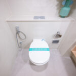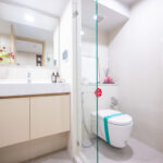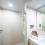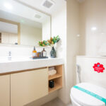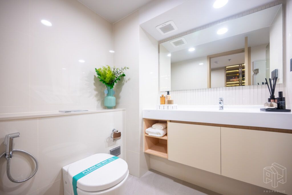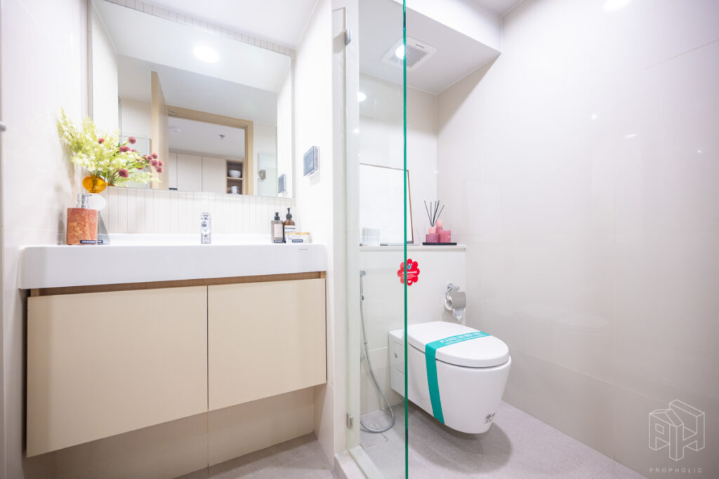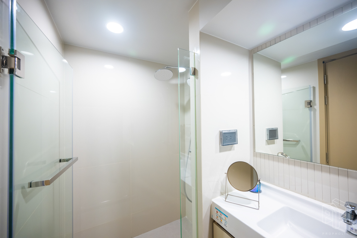 เข้ามาในห้องก็จะเจอกับห้องน้ำและครัว เหมือนกับห้องแรก โดยห้องน้ำแบ่งสองฝั่ง โซนสุขภัณฑ์และโซนอาบน้ำและมีประตูกระจกกั้นของใครของมัน ดังนั้นถ้าติดม่านหรือติดฟิล์มก็จะเหมือนได้ห้องน้ำแบ่งส่วน ใช้งานพร้อมกันได้ด้วย มีฝั่งโถชักโครก และฝั่งอาบน้ำ ส่วนตรงกลางเป็นโซนแห้ง มีอ่างล้างหน้าอยู่ตรงกลาง ติดตั้งโถสุขภัณฑ์ American Standard ให้