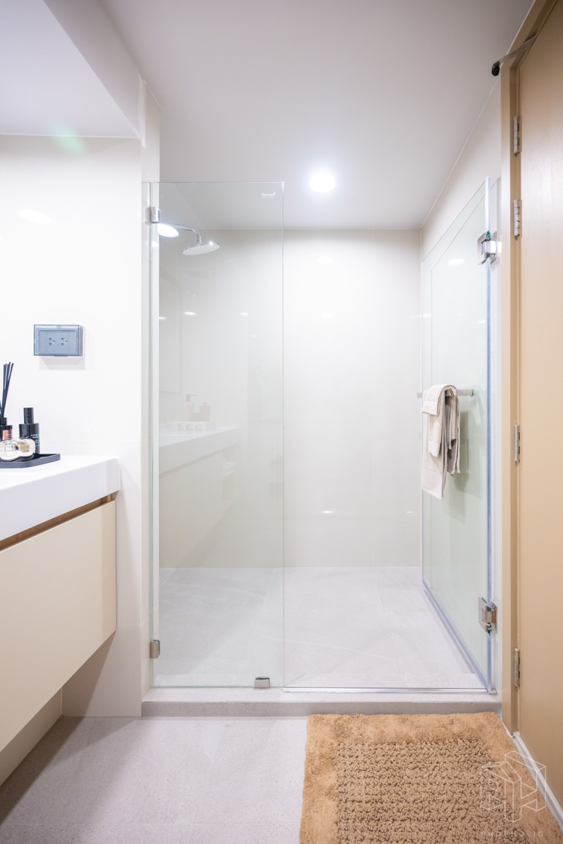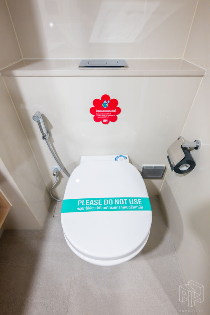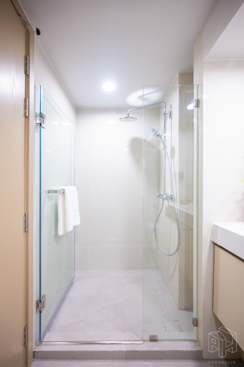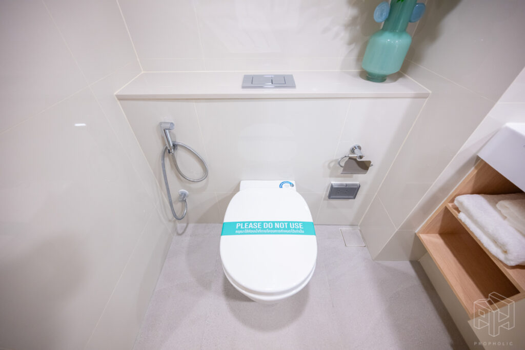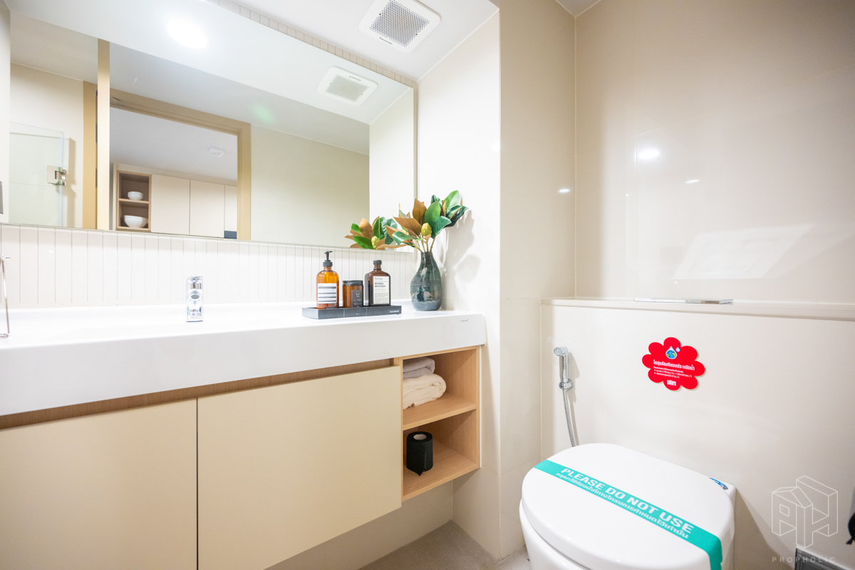 ห้องน้ำอยู่หน้าห้องเช่นกัน มีการแบ่งแยกห้องน้ำให้เป็นสัดส่วน โซนอาบน้ำและโซนสุขภัณฑ์ ง่ายต่อการใช้งาน