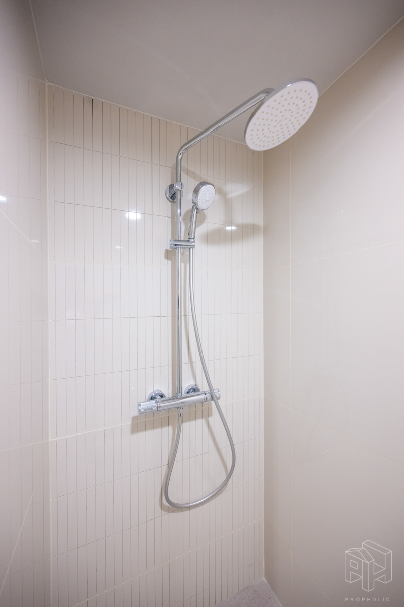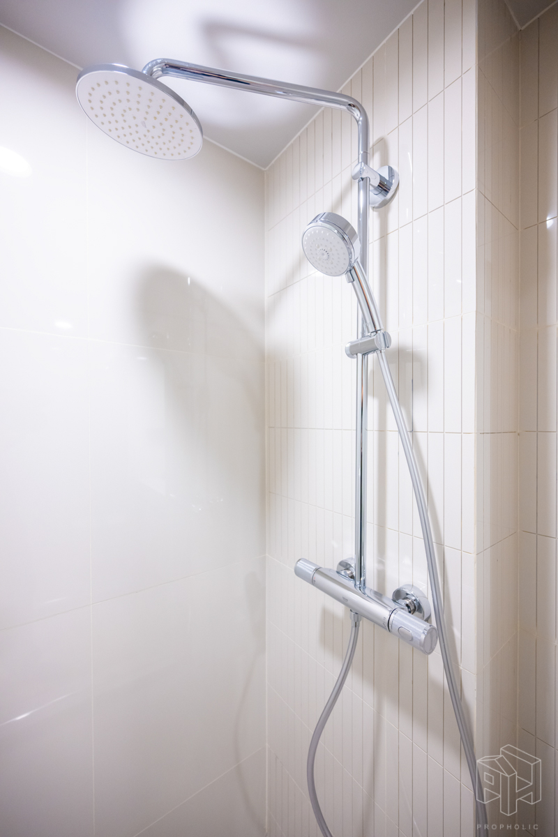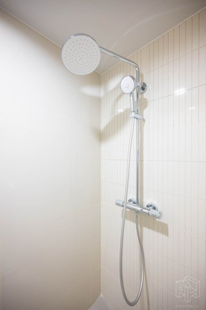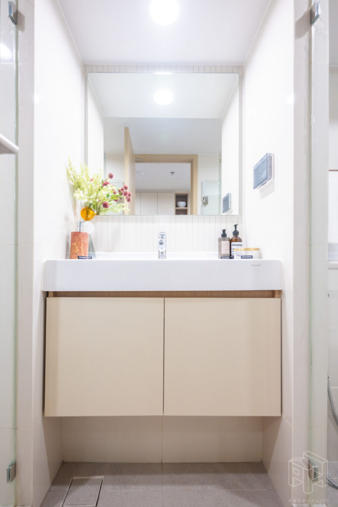 ห้องน้ำอยู่หน้าห้องเช่นกัน มีการแบ่งแยกห้องน้ำให้เป็นสัดส่วน โซนอาบน้ำและโซนสุขภัณฑ์ ง่ายต่อการใช้งาน