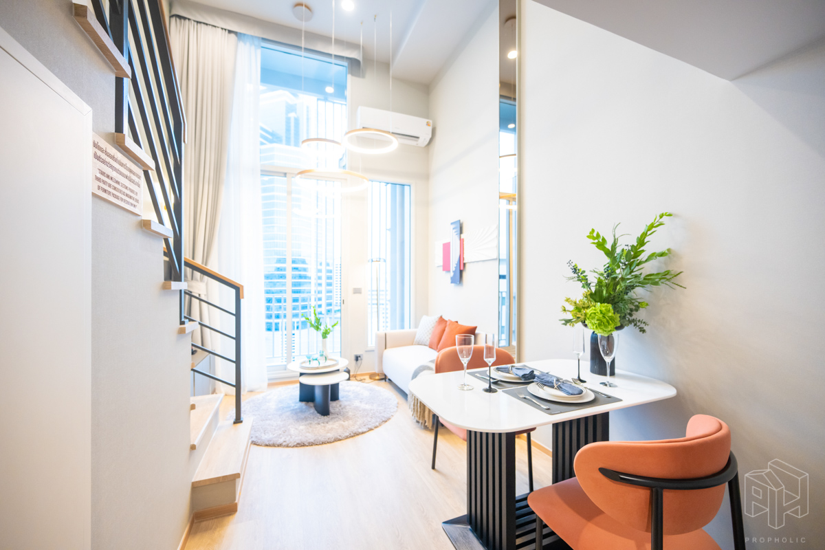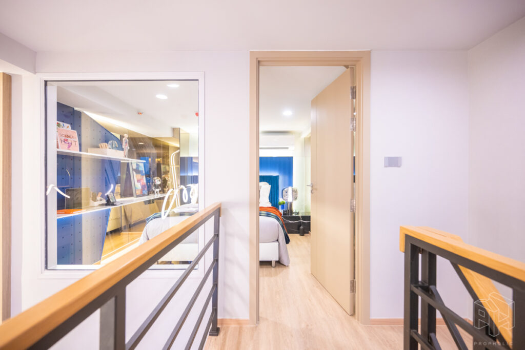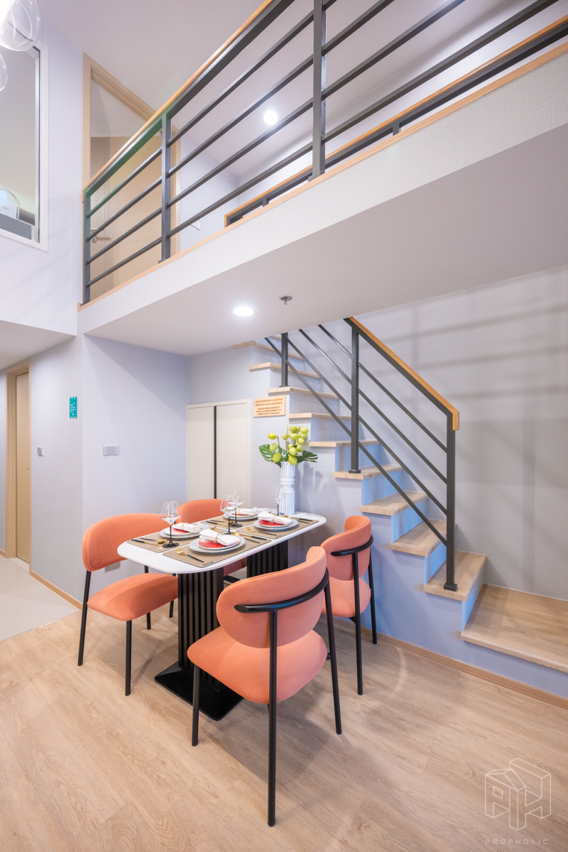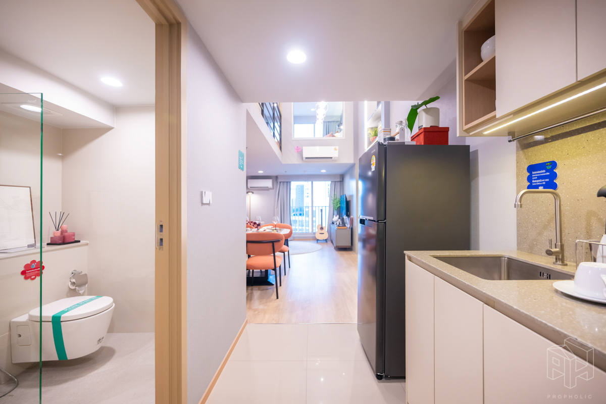 วันนี้เราจะพาไปชมห้องตัวอย่างกันถึง 3 ห้องด้วยกัน โดยทุกยูนิตจะได้รับการติดตั้งพื้นที่ชั้นลอย ตามแบบมาตรฐานจากบริษัทภายนอก จึงไม่ต้องกังวลเรื่องการตกแต่งพื้นที่ชั้นลอยเพิ่มเติม ซึ่งจุดเด่นของการออกแบบห้อง Hybrid เพดานสูง 4.3 เมตรนี้คือการใช้พื้นที่อย่างชาญฉลาดและลงตัว เช่น มีพื้นที่ Laundry & Storage สำหรับเก็บเครื่องซักผ้าใต้บันได, พื้นที่วางของในครัวที่เพิ่มขึ้น และการแยกโซนอาบน้ำกับโซนสุขภัณฑ์ในห้องน้ำออกจากกัน ทำให้แม้จะมีพื้นที่ใช้สอยเยอะ แต่ยังคงรักษาความรู้สึก โปร่งโล่ง ตามสไตล์ห้องเพดานสูงได้อย่างสมบูรณ์แบบ ซึ่งทั้งหมดนี้คือข้อได้เปรียบที่คิดมาเพื่อตอบโจทย์การใช้ชีวิตของคนเมืองอย่างแท้จริง