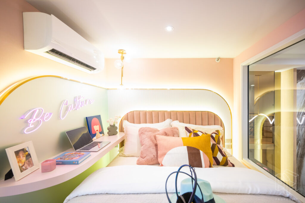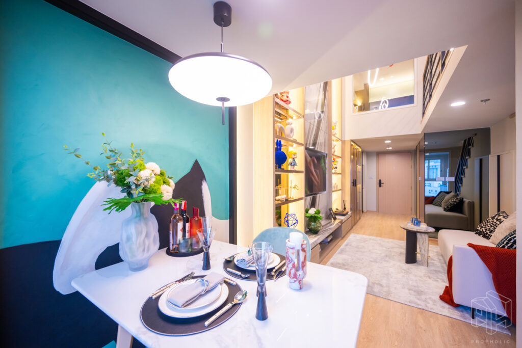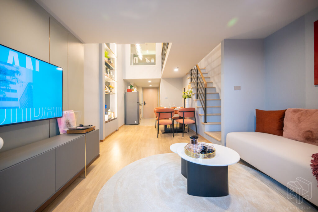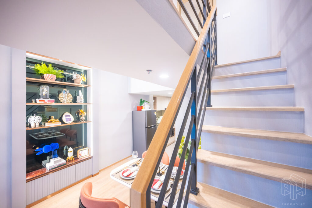 วันนี้เราจะพาไปชมห้องตัวอย่างกันถึง 3 ห้องด้วยกัน โดยทุกยูนิตจะได้รับการติดตั้งพื้นที่ชั้นลอย ตามแบบมาตรฐานจากบริษัทภายนอก จึงไม่ต้องกังวลเรื่องการตกแต่งพื้นที่ชั้นลอยเพิ่มเติม ซึ่งจุดเด่นของการออกแบบห้อง Hybrid เพดานสูง 4.3 เมตรนี้คือการใช้พื้นที่อย่างชาญฉลาดและลงตัว เช่น มีพื้นที่ Laundry & Storage สำหรับเก็บเครื่องซักผ้าใต้บันได, พื้นที่วางของในครัวที่เพิ่มขึ้น และการแยกโซนอาบน้ำกับโซนสุขภัณฑ์ในห้องน้ำออกจากกัน ทำให้แม้จะมีพื้นที่ใช้สอยเยอะ แต่ยังคงรักษาความรู้สึก โปร่งโล่ง ตามสไตล์ห้องเพดานสูงได้อย่างสมบูรณ์แบบ ซึ่งทั้งหมดนี้คือข้อได้เปรียบที่คิดมาเพื่อตอบโจทย์การใช้ชีวิตของคนเมืองอย่างแท้จริง