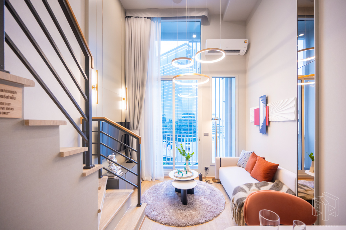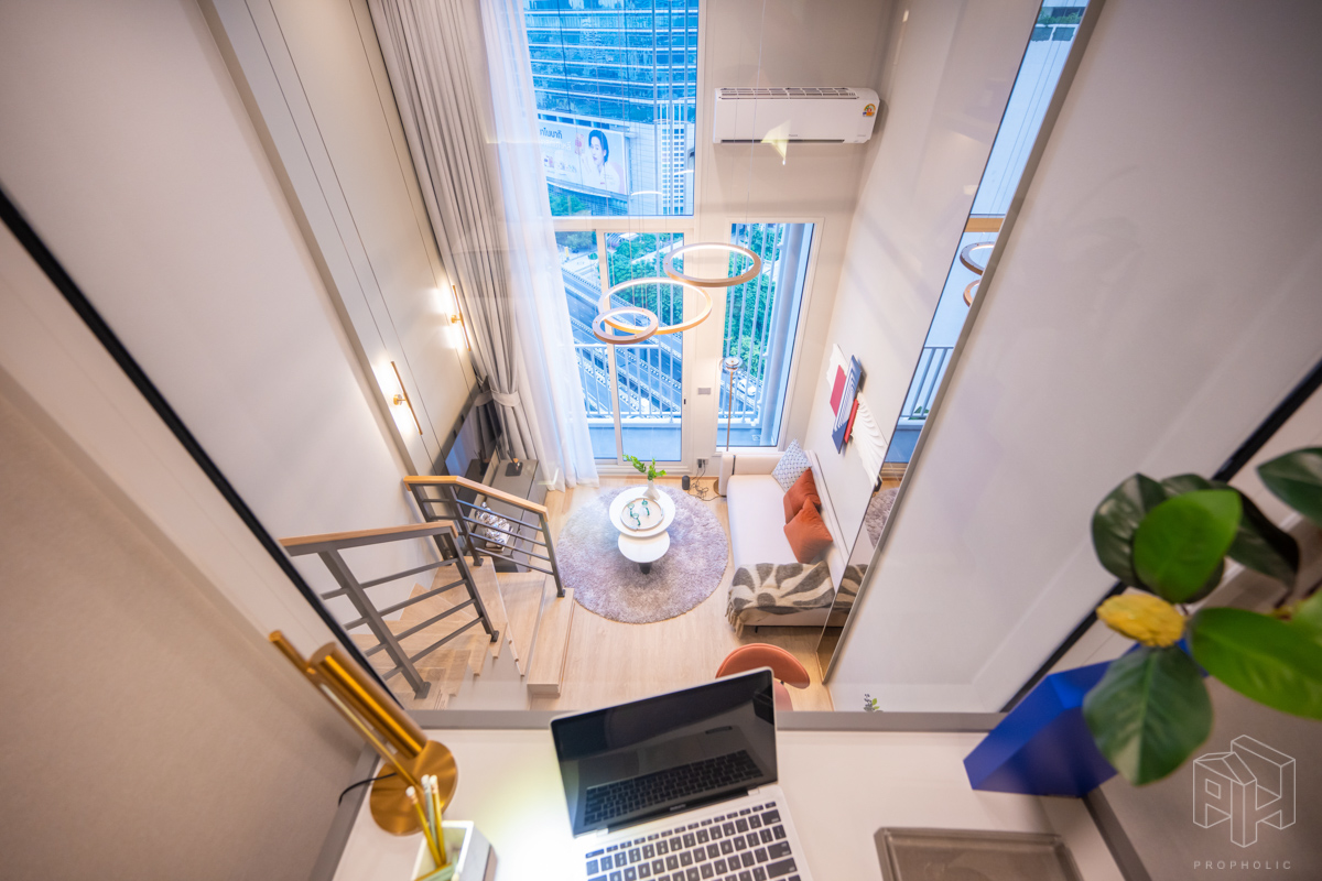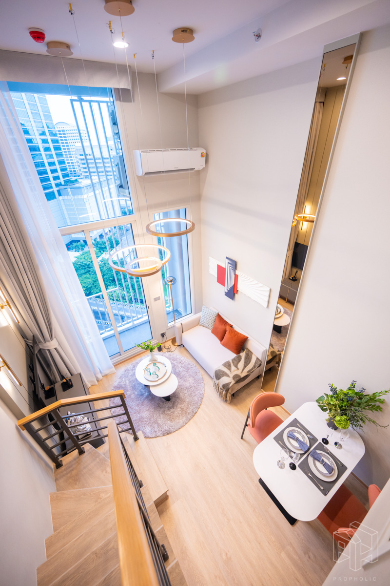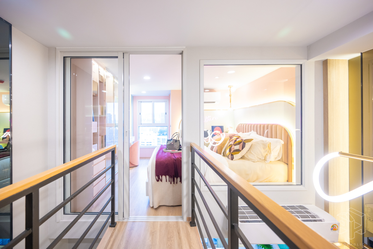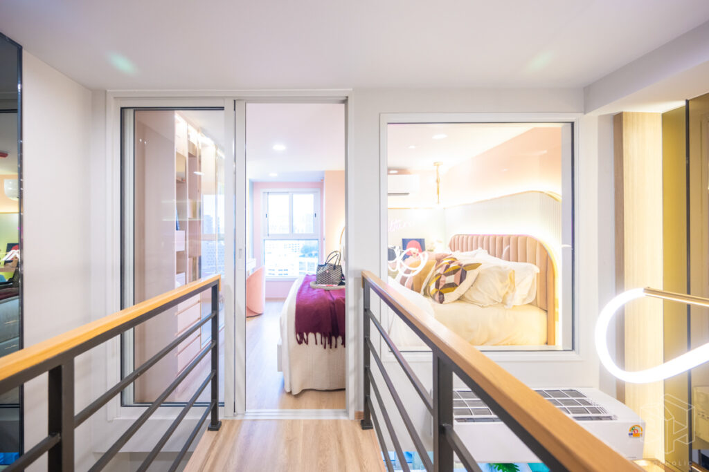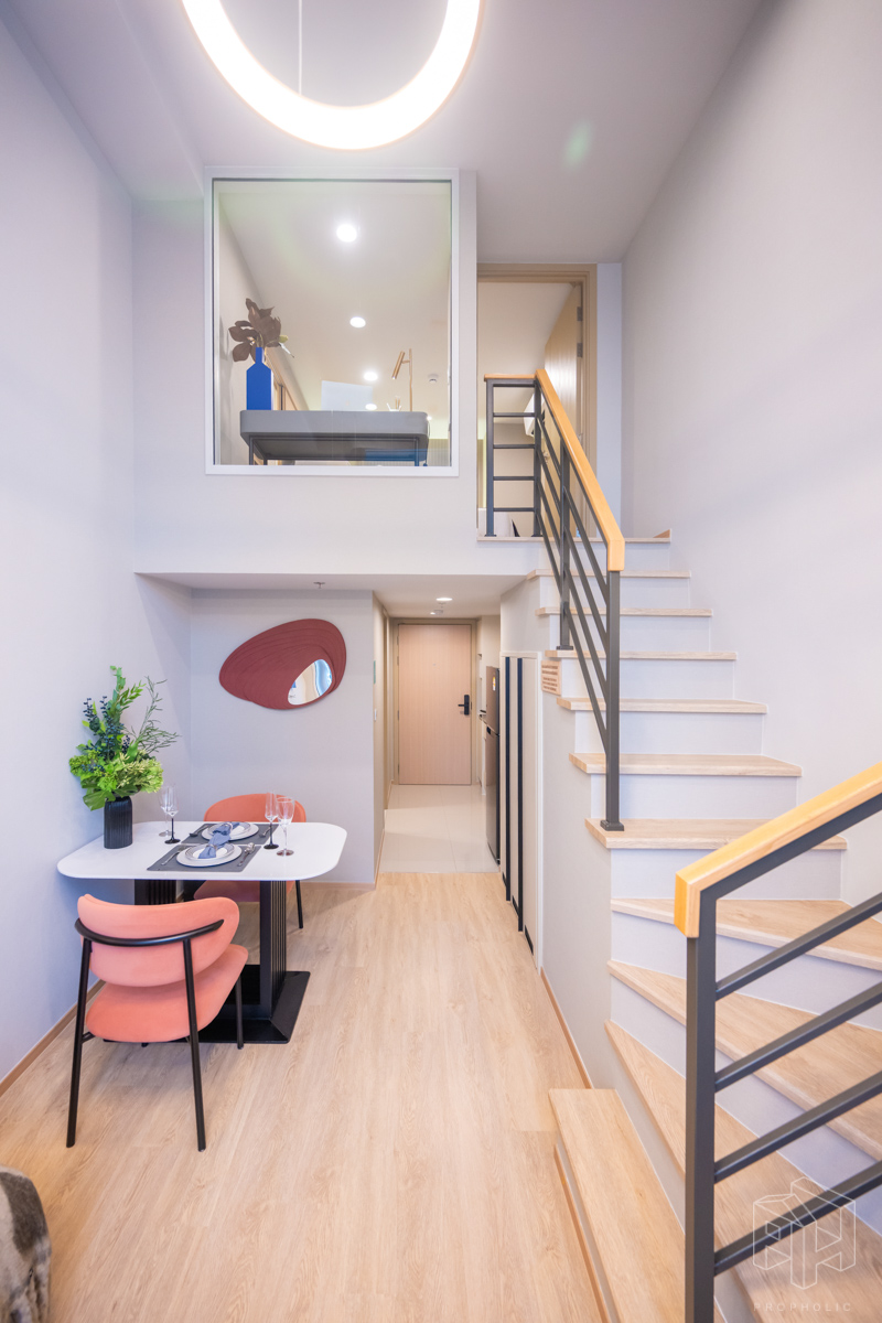 โดยชั้นล่างจะเป็นโซน service มีครัว ห้องน้ำ ห้องนั่งเล่น ระเบียง ส่วนพื้นที่ชั้นลอยที่เชื่อมด้วยบันไดเดินขึ้นไปจะเป็นโซนห้องนอน ซึ่งฟังก์ชันหลักๆ จะเหมือนกันก็คือ เปิดประตูห้องเข้ามาเจอมุมครัวก่อน แล้วก็หันอีกข้างไปจะเจอห้องน้ำ เมื่อผ่านประตูบานเลื่อนครัวไปจะกลายเป็นโซน Living ที่ระเบิด Space กว้าง มองขึ้นไปเห็นเพดานสูง มีระเบียงพาดตลอดแนวของจุดรับแสงของห้อง หลังตกแต่งจะมีบันไดเดินขึ้นไปชั้นลอยห้องนอนที่มีประตูและกระจกกั้นเพื่อความเป็นส่วนตัว