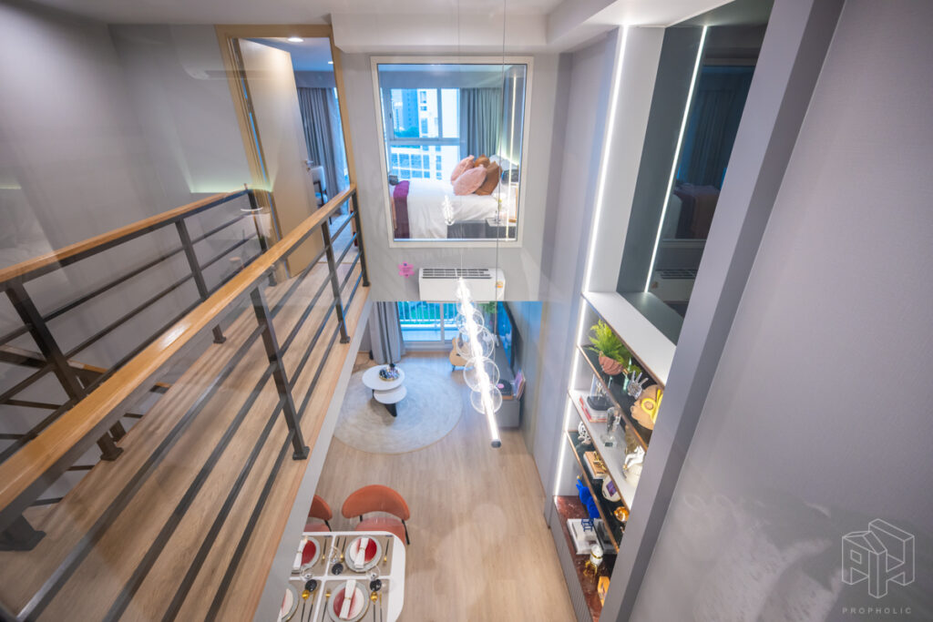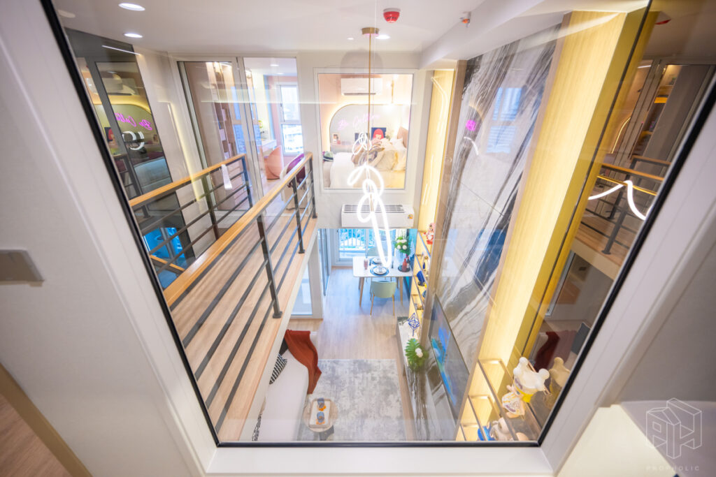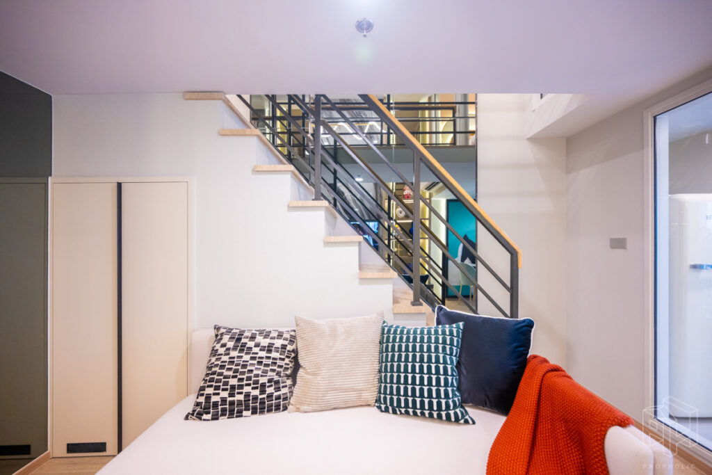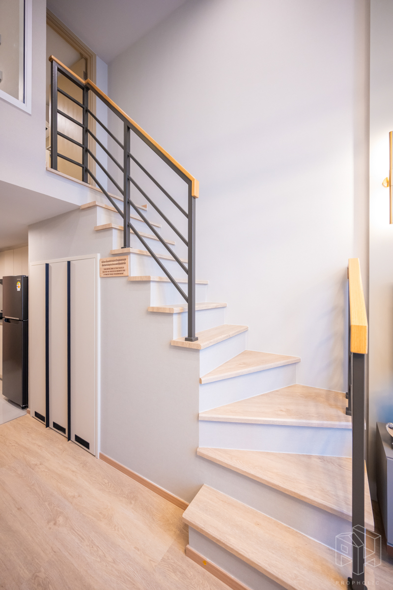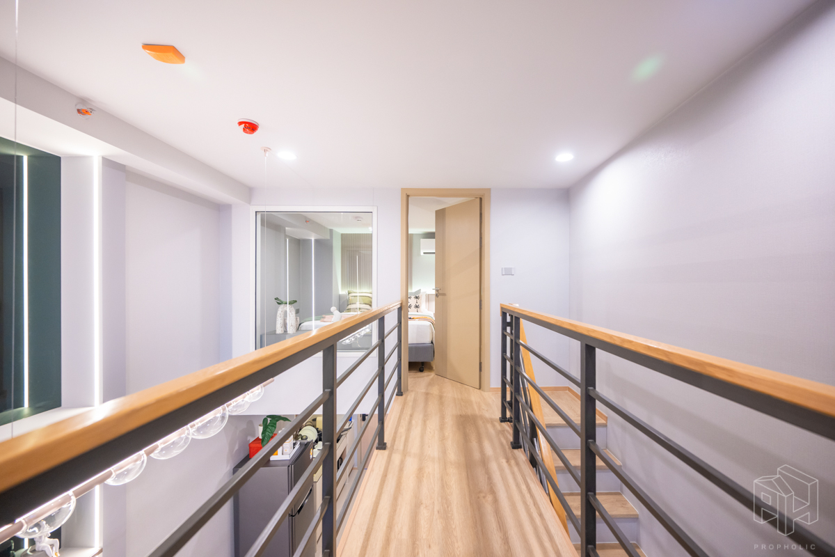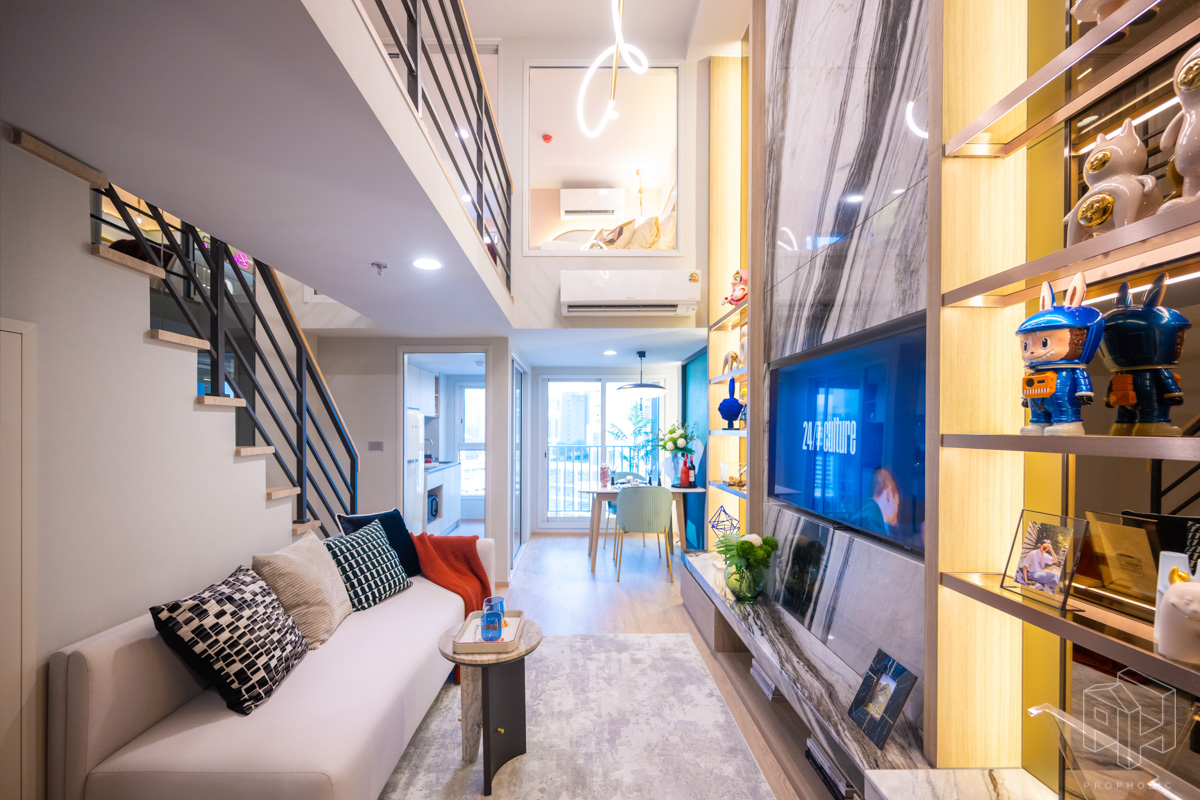 โดยชั้นล่างจะเป็นโซน service มีครัว ห้องน้ำ ห้องนั่งเล่น ระเบียง ส่วนพื้นที่ชั้นลอยที่เชื่อมด้วยบันไดเดินขึ้นไปจะเป็นโซนห้องนอน ซึ่งฟังก์ชันหลักๆ จะเหมือนกันก็คือ เปิดประตูห้องเข้ามาเจอมุมครัวก่อน แล้วก็หันอีกข้างไปจะเจอห้องน้ำ เมื่อผ่านประตูบานเลื่อนครัวไปจะกลายเป็นโซน Living ที่ระเบิด Space กว้าง มองขึ้นไปเห็นเพดานสูง มีระเบียงพาดตลอดแนวของจุดรับแสงของห้อง หลังตกแต่งจะมีบันไดเดินขึ้นไปชั้นลอยห้องนอนที่มีประตูและกระจกกั้นเพื่อความเป็นส่วนตัว