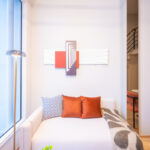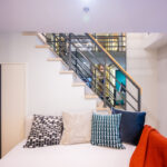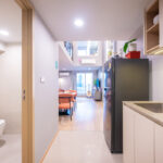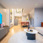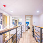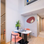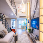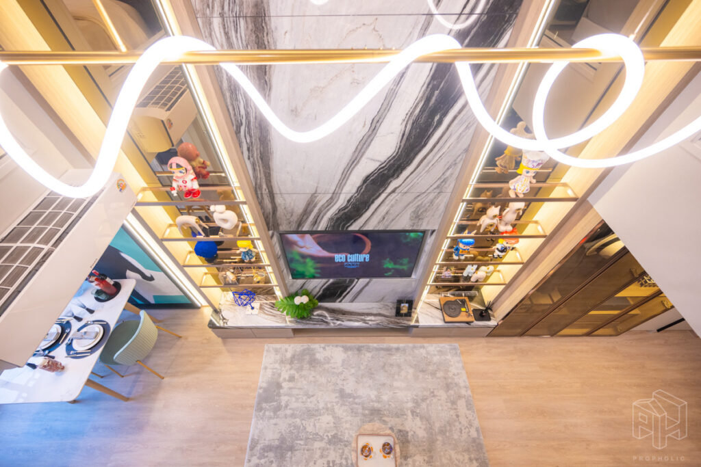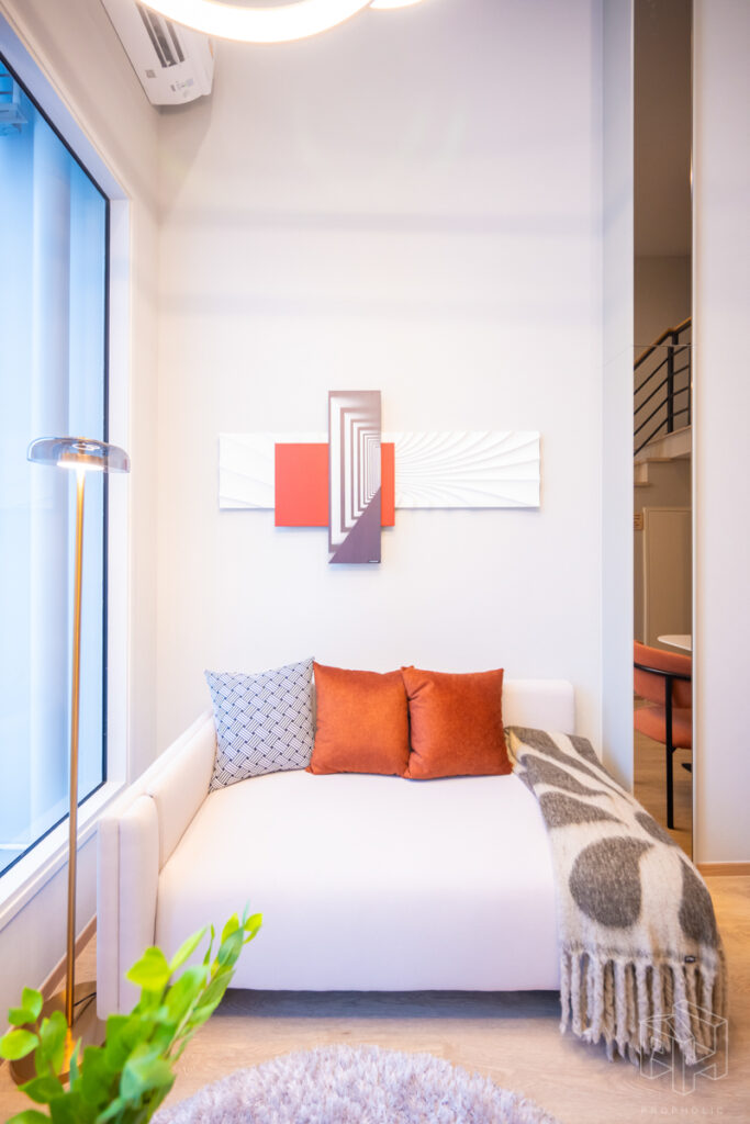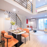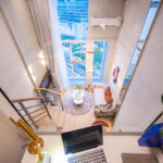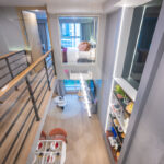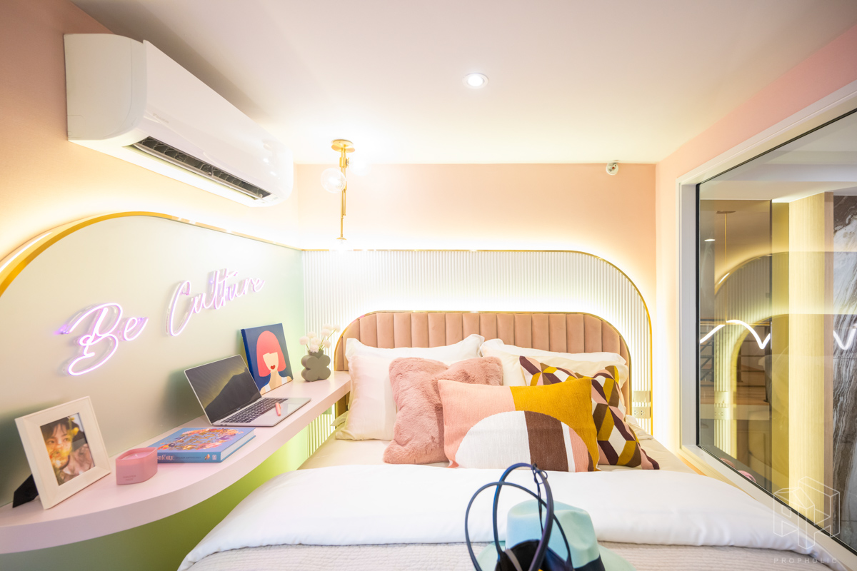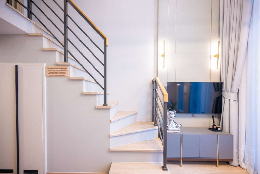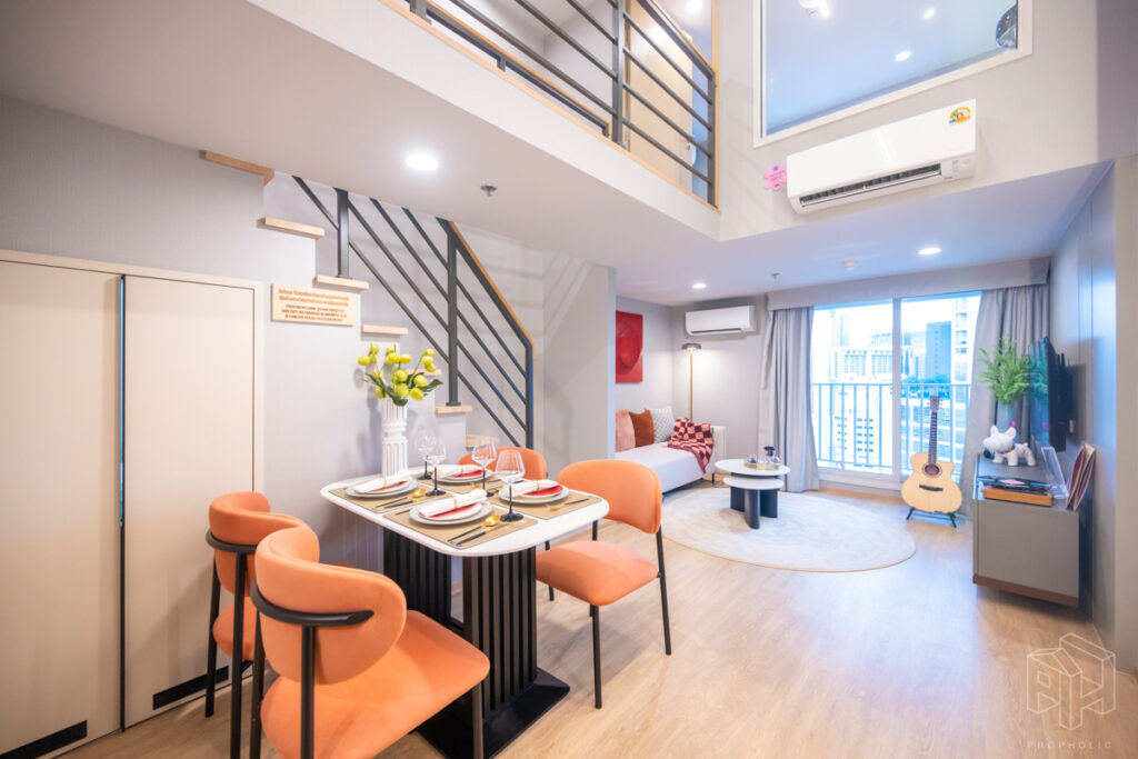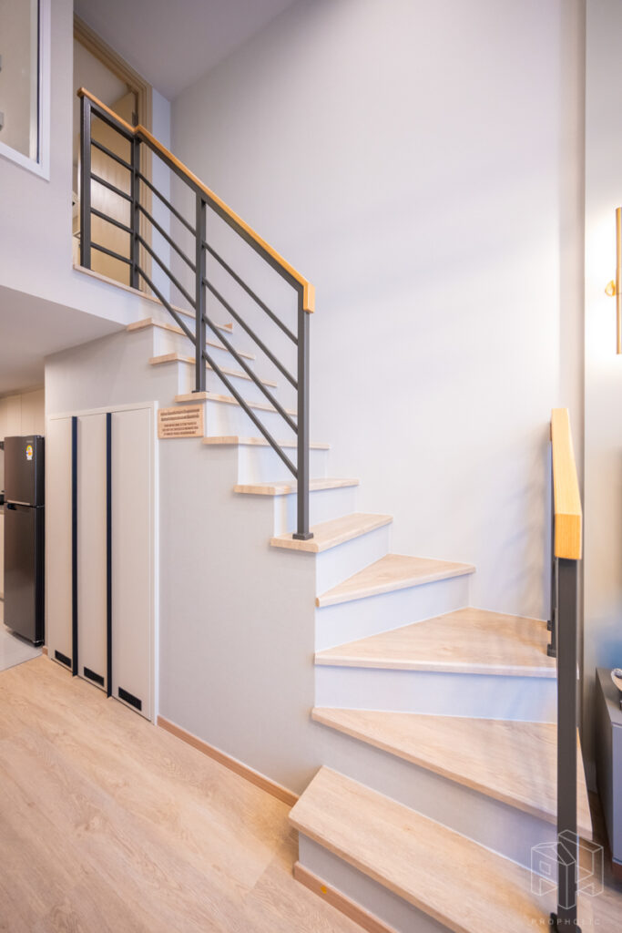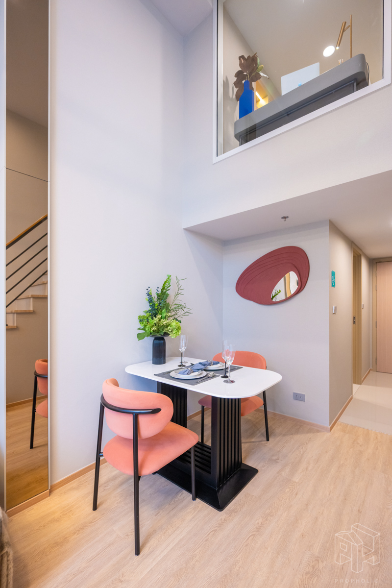 โดยชั้นล่างจะเป็นโซน service มีครัว ห้องน้ำ ห้องนั่งเล่น ระเบียง ส่วนพื้นที่ชั้นลอยที่เชื่อมด้วยบันไดเดินขึ้นไปจะเป็นโซนห้องนอน ซึ่งฟังก์ชันหลักๆ จะเหมือนกันก็คือ เปิดประตูห้องเข้ามาเจอมุมครัวก่อน แล้วก็หันอีกข้างไปจะเจอห้องน้ำ เมื่อผ่านประตูบานเลื่อนครัวไปจะกลายเป็นโซน Living ที่ระเบิด Space กว้าง มองขึ้นไปเห็นเพดานสูง มีระเบียงพาดตลอดแนวของจุดรับแสงของห้อง หลังตกแต่งจะมีบันไดเดินขึ้นไปชั้นลอยห้องนอนที่มีประตูและกระจกกั้นเพื่อความเป็นส่วนตัว