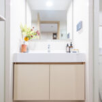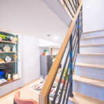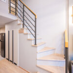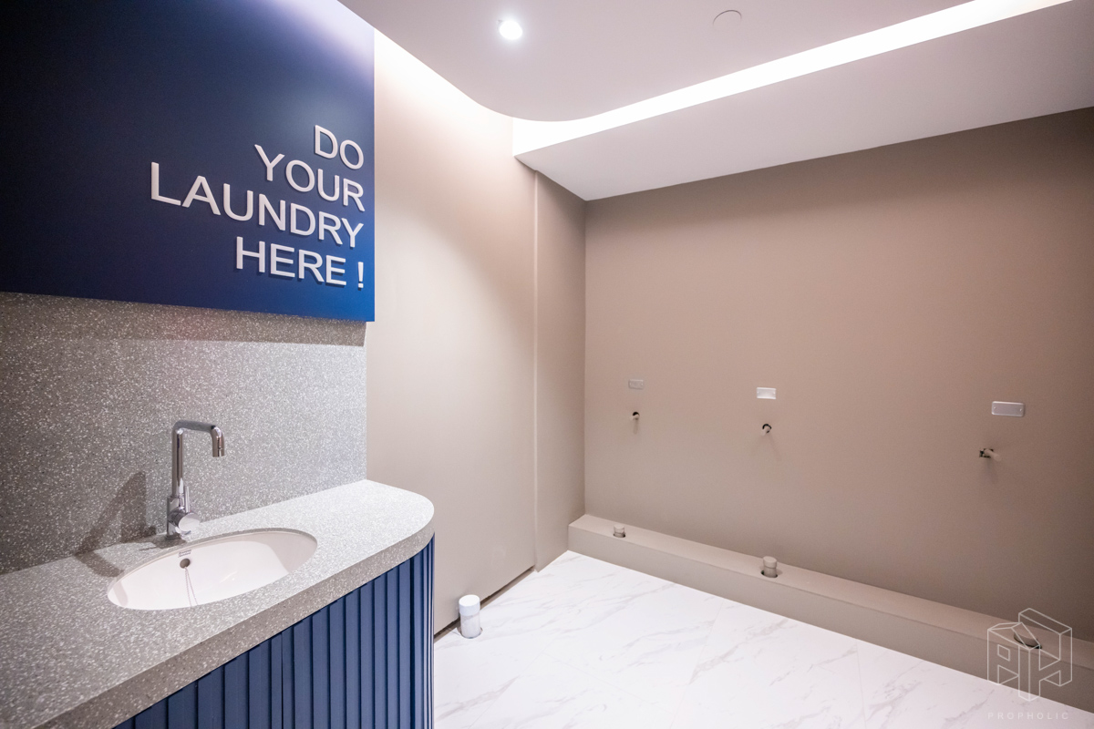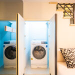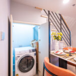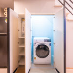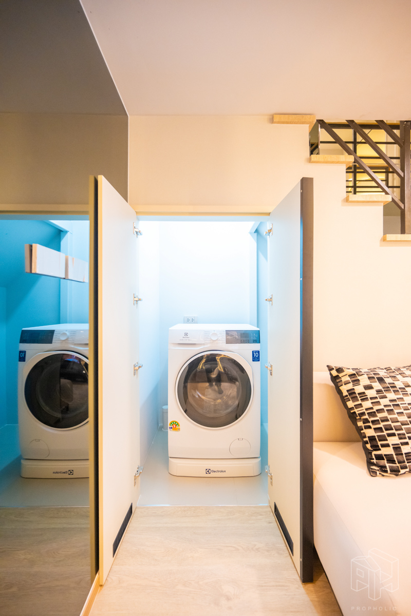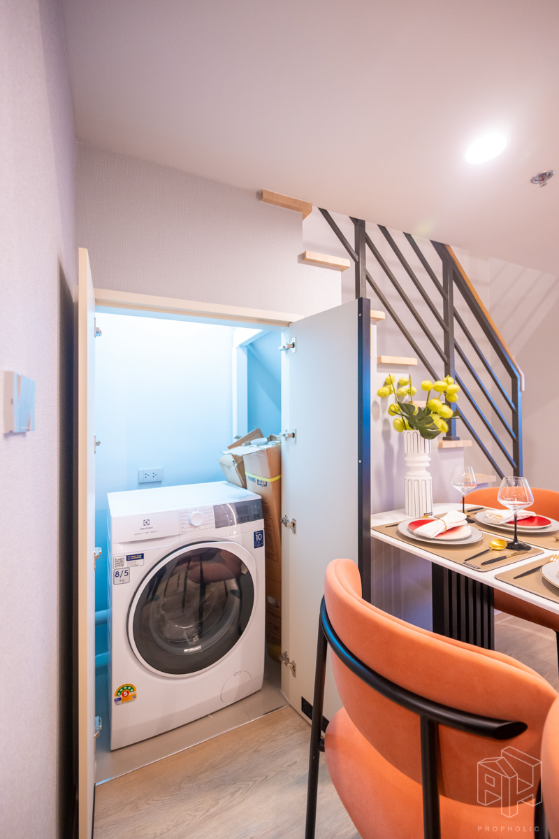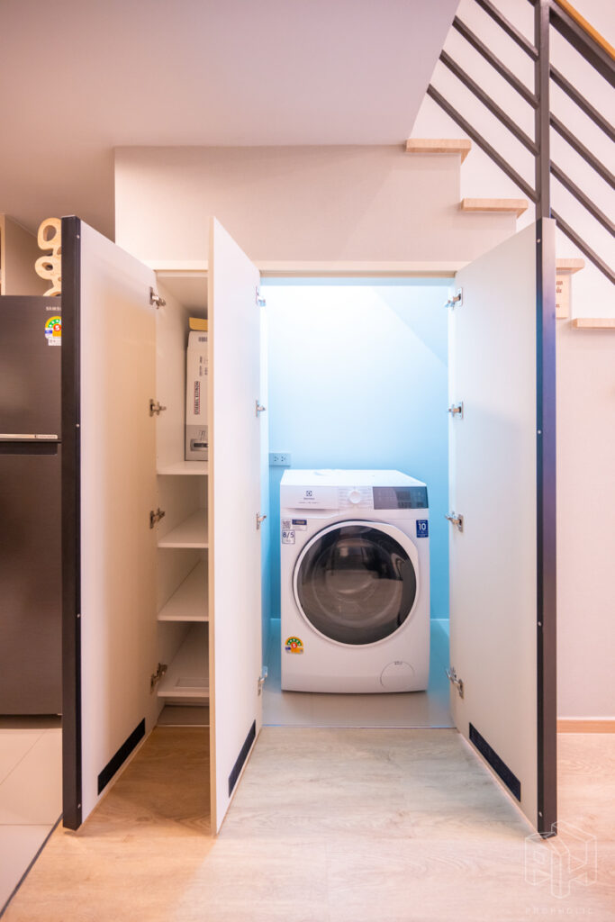 เครื่องซักผ้าถูกออกแบบให้ซ่อนจัดเป็นโซนซักล้างโดยใช้พื้นที่ใต้บันได ตู้เก็บของใต้บันไดและที่ว่างเครื่องซักผ้าซ่อนไว้เป็นสัดส่วน และตู้เก็บของใต้บันไดมีช่องระบายอากาศ