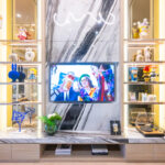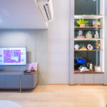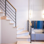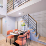 มุมทีวีและตู้วางของ มุมมองจากโต๊ะกินข้าวมองไปยังทีวีที่แขวนติดไว้ที่ผนังตรงทางขึ้นบันได มุมห้องนั่งเล่นติดกับประตูออกระเบียงและกระจกใสบานสูง ทำให้ห้องดูโล่งโปร่ง พร้อมโซนรับประทานอาหารที่จัดโต๊ะขนาด 2 – 4 ที่นั่งได้