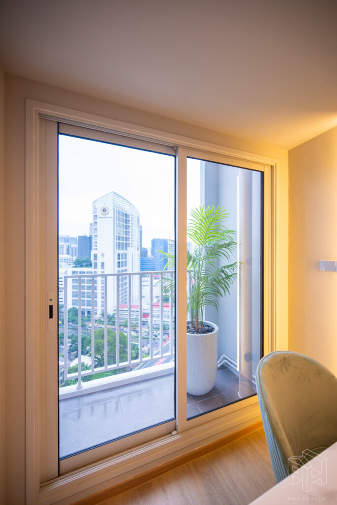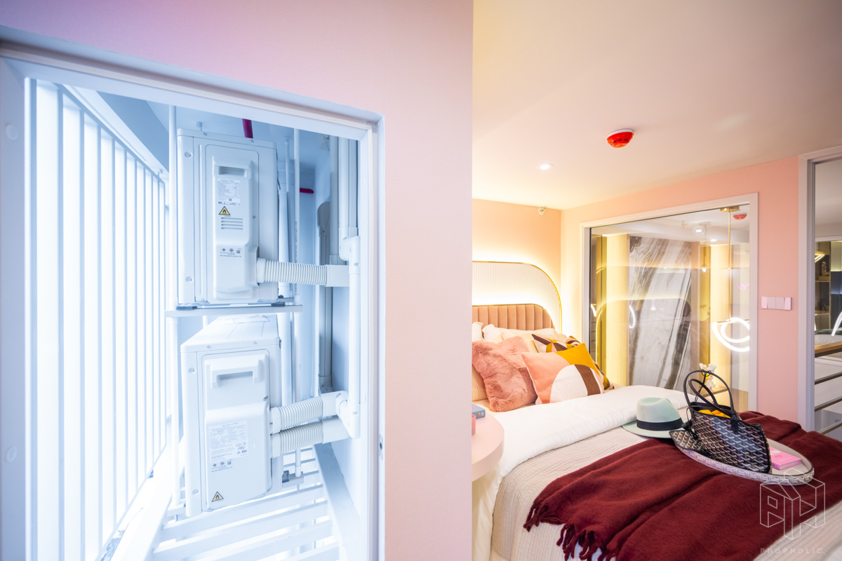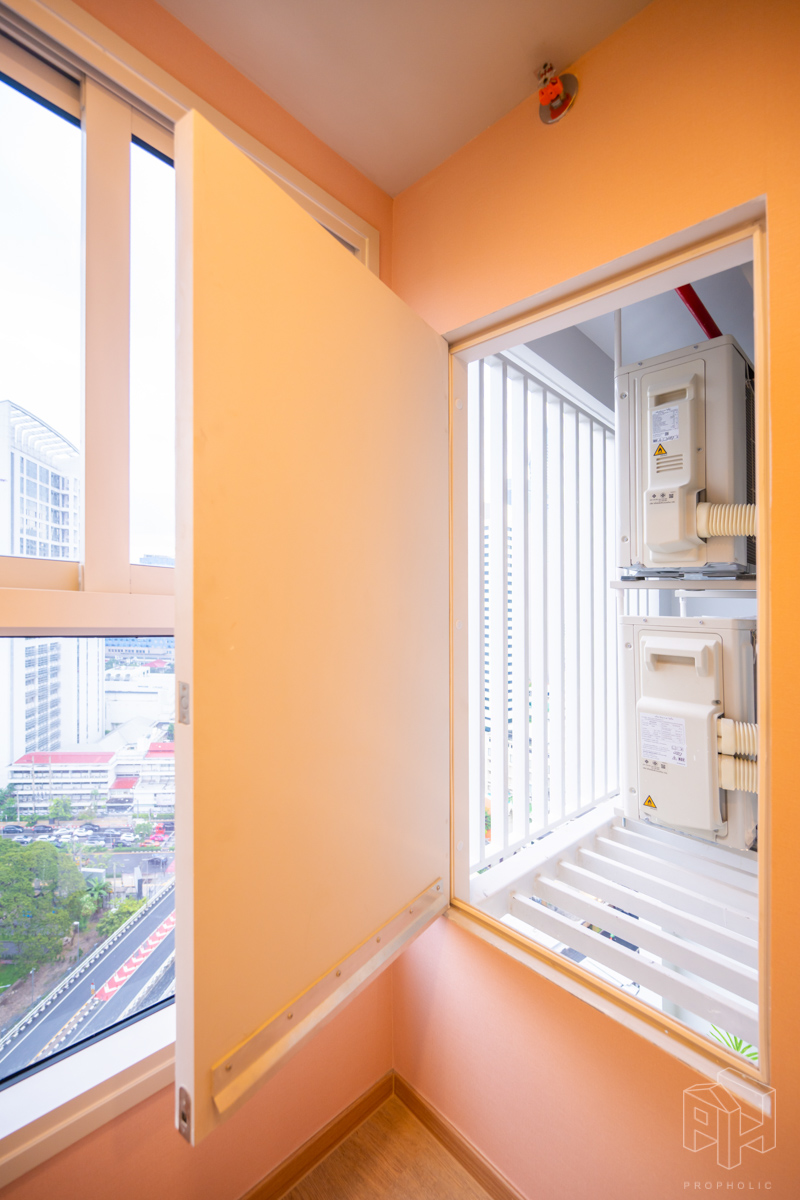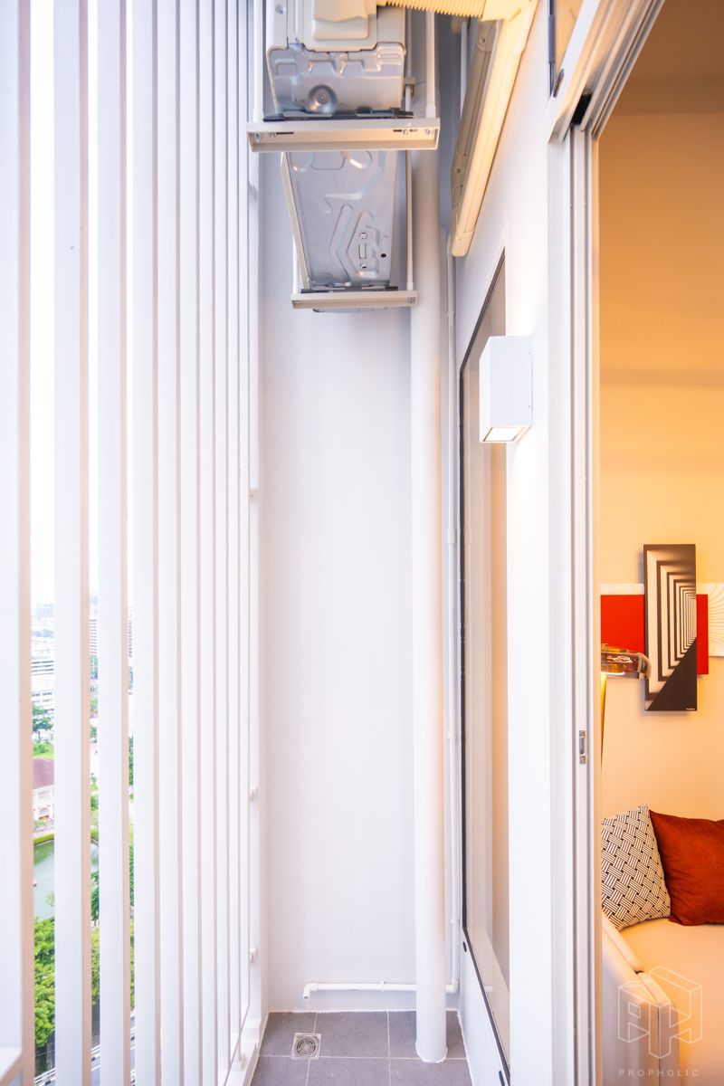 บริเวณระเบียงมีการแขวน CDU แอร์ไว้ด้านบน ทำให้ระเบียงมีพื้นที่สำหรับวางกระถางต้นไม้หรือเก้าอี้เล็กไว้สำหรับออกไปนั่งเล่นด้านนอกได้