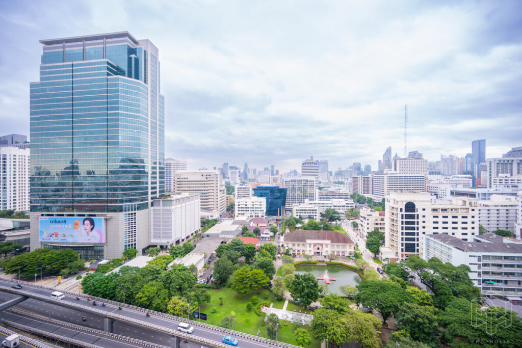 ฝั่งด้านหน้าโครงการถนนพระรามสี่จะได้วิวสวนสวยๆของสถานเสาวภา