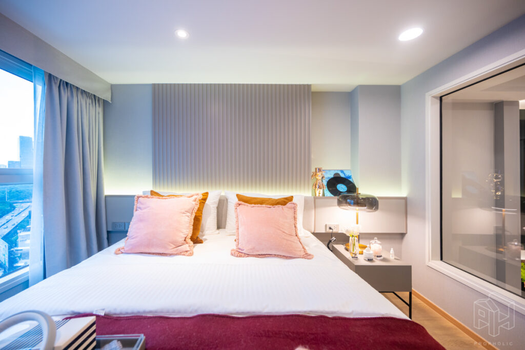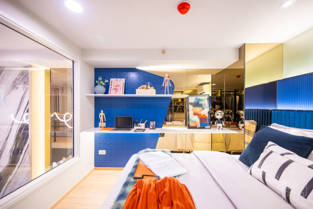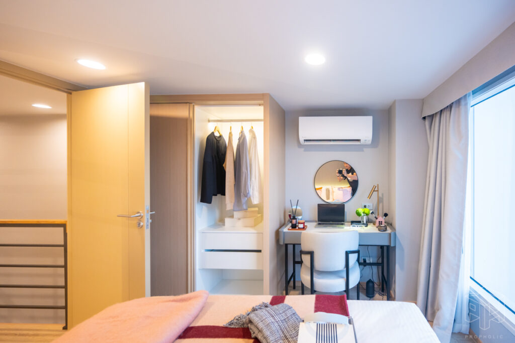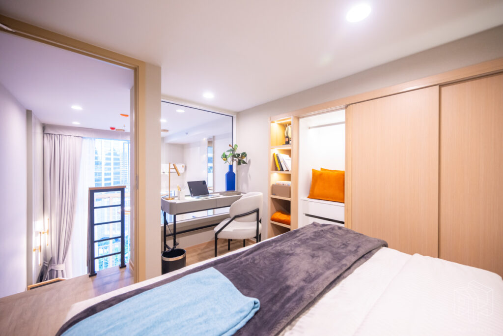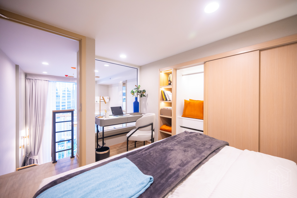 ห้องนอนและเตียงนอน โซนโต๊ะทำงานและชั้นวางของอยู่ข้างเตียงหันหน้าออกทางกระจกใสมองเห็นวิวกว้าง และตู้เสื้อผ้าบานเลื่อนใหญ่ในห้องนอน