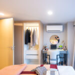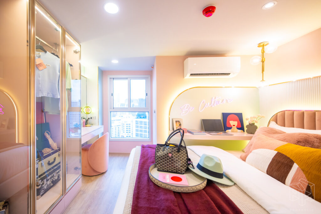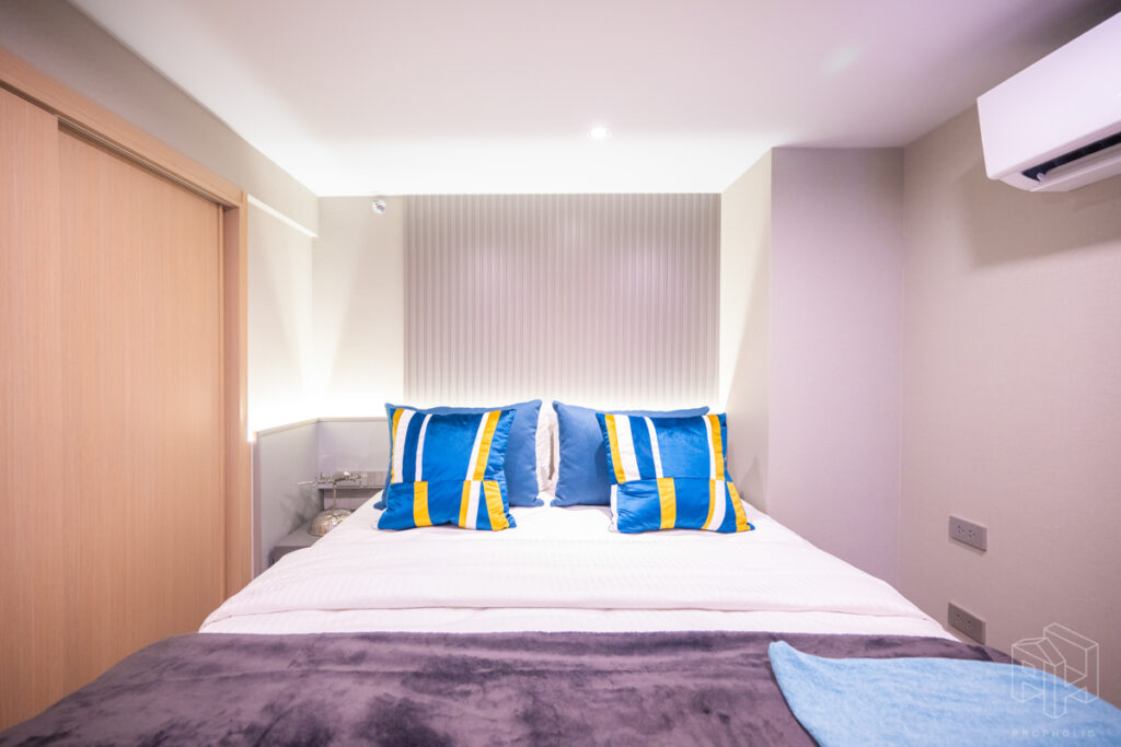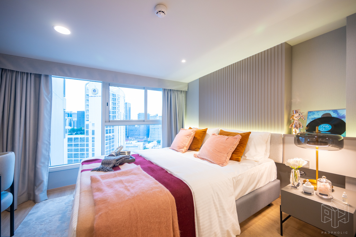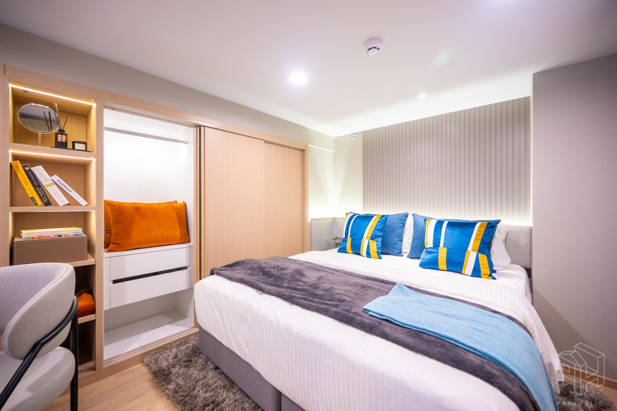 ห้องนอนและเตียงนอน โซนโต๊ะทำงานและชั้นวางของอยู่ข้างเตียงหันหน้าออกทางกระจกใสมองเห็นวิวกว้าง และตู้เสื้อผ้าบานเลื่อนใหญ่ในห้องนอน