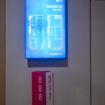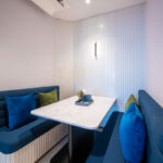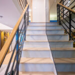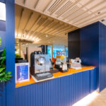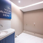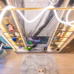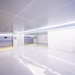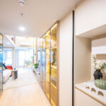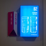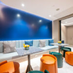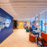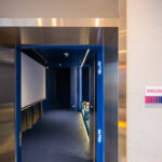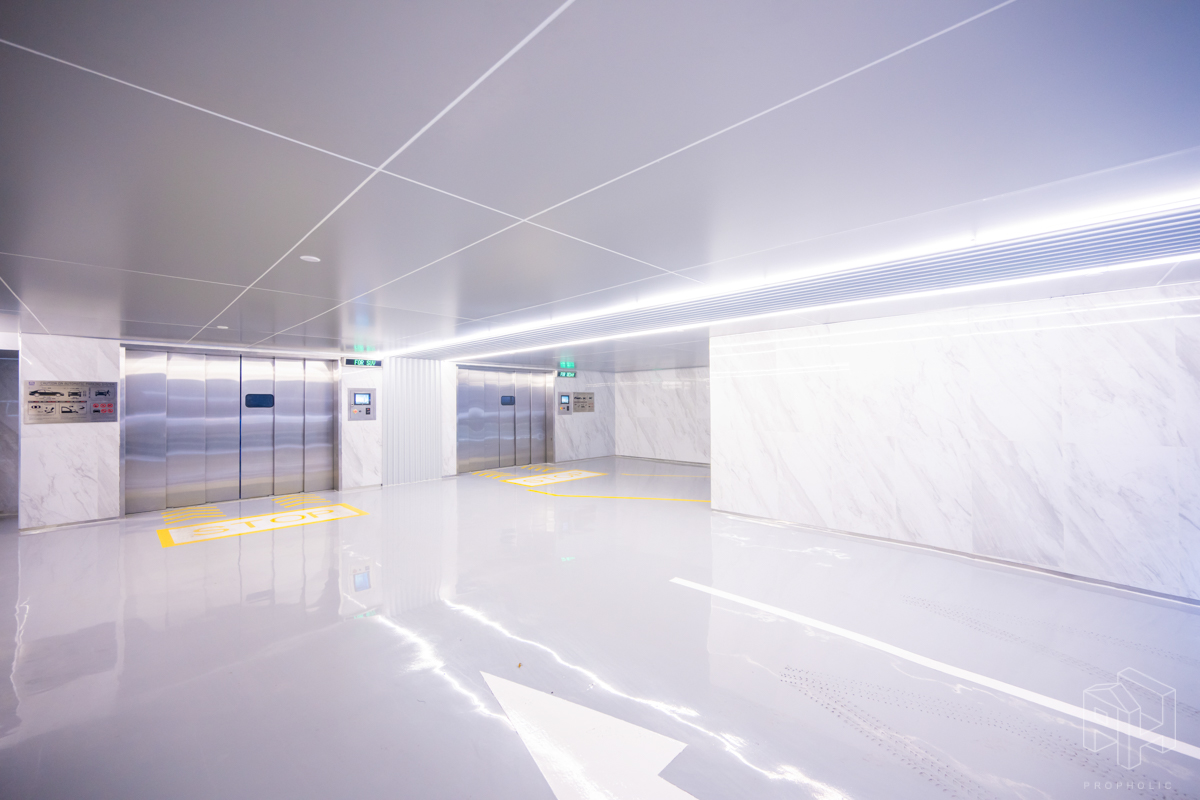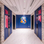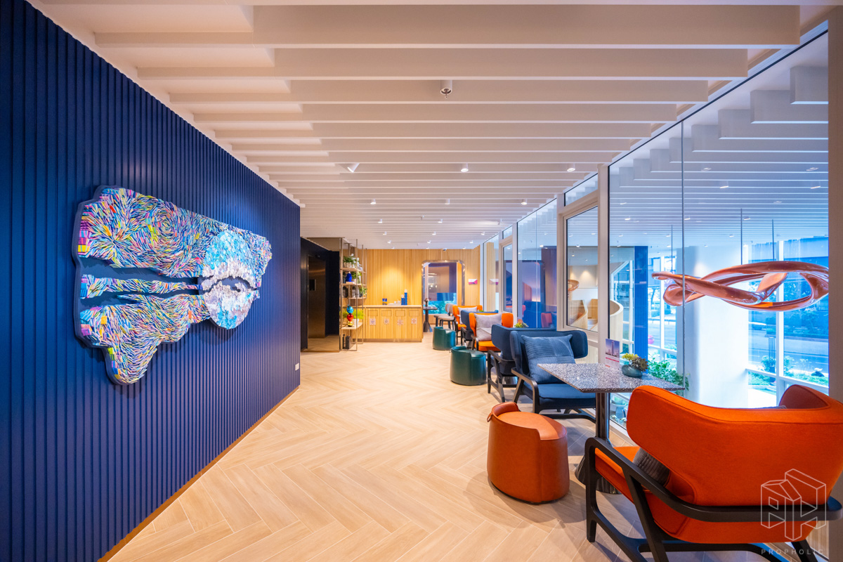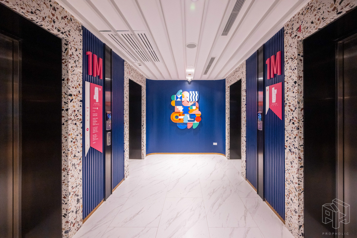โถงลิฟท์ชั้น 1M ตกแต่งสวยงาม ด้วยวัสดุหิน Terazzo สลับกับระแนงแนวตั้งสีน้ำเงิน