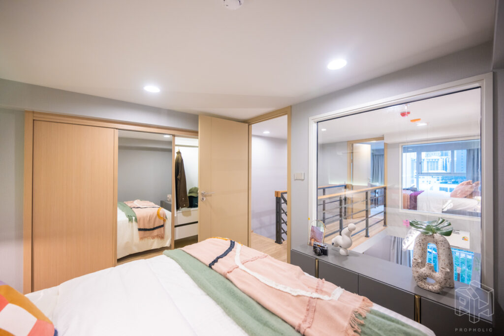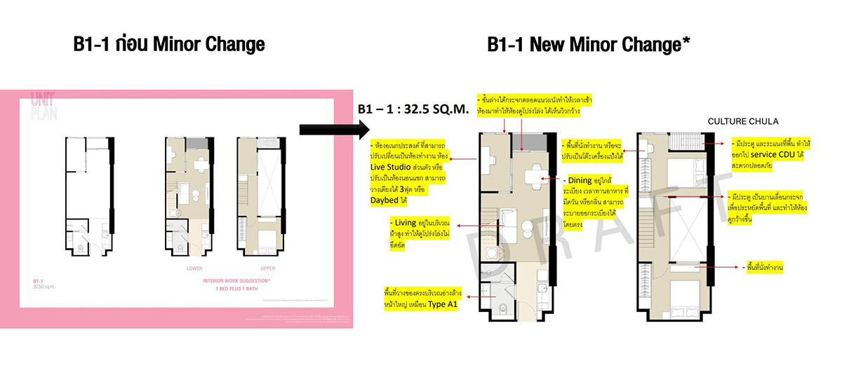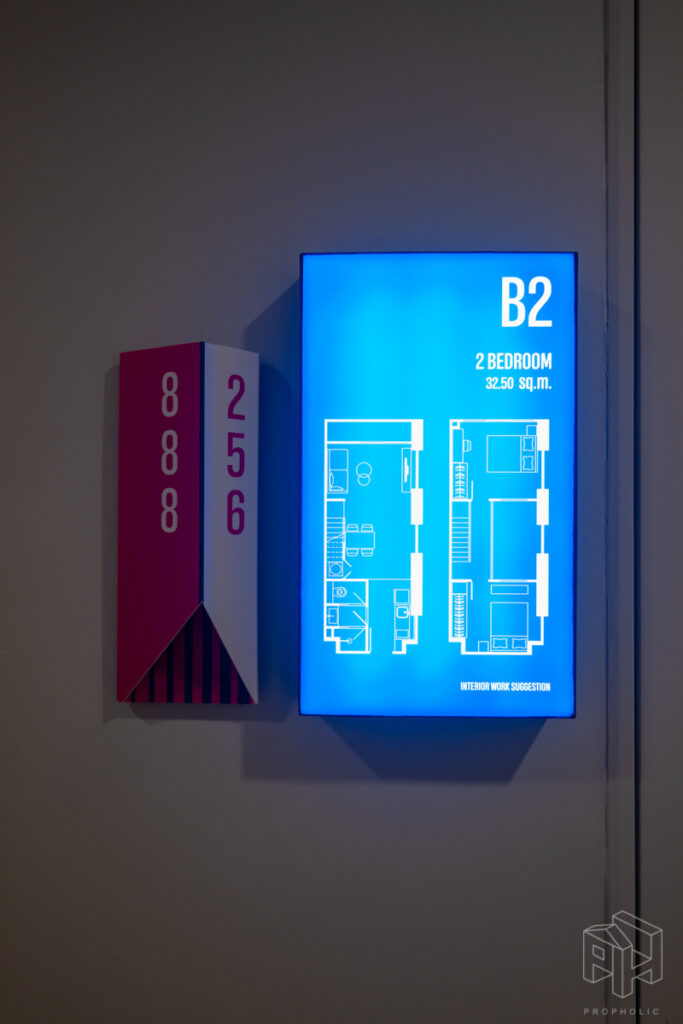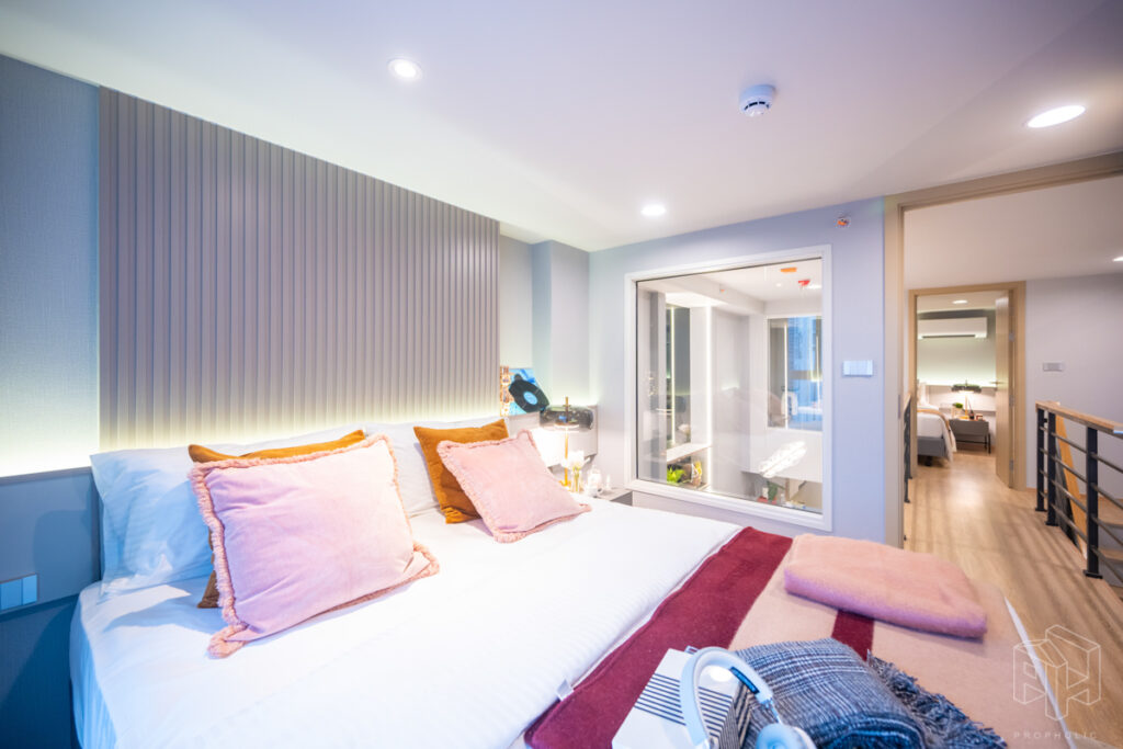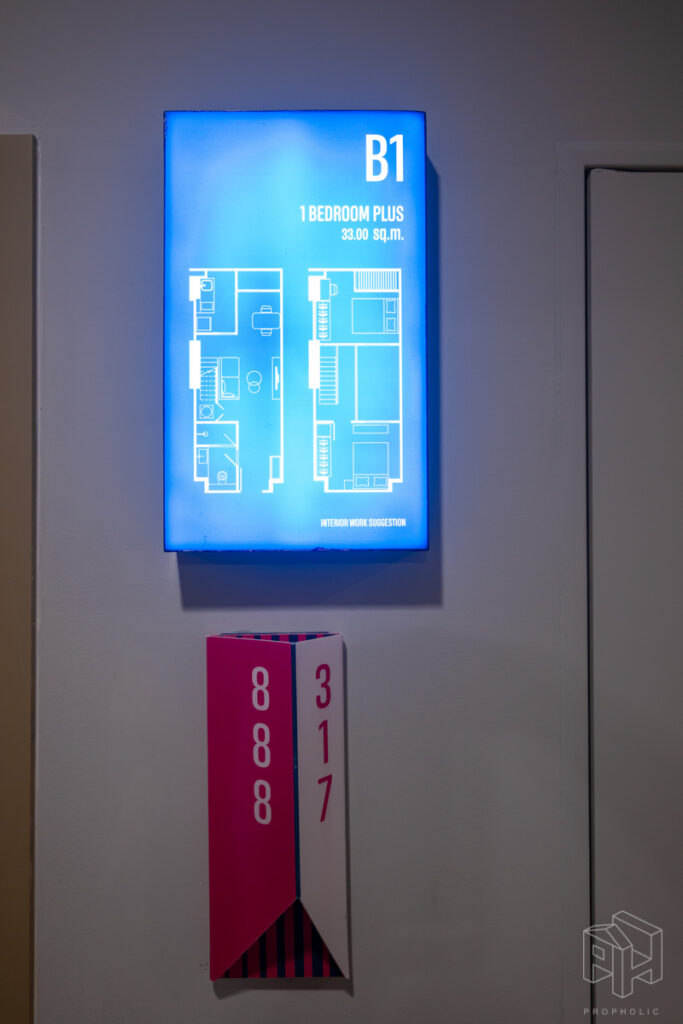ห้องนี้มีความพิเศษมากเพราะเอาห้องแบบ 1 Bed Plus ใน Type B1 ขนาด 33 ตรม. มาทำ Minor Change ด้วยการปรับเลย์เอาท์ เพิ่มพื้นที่ใช้สอยของชั้นลอยให้มากขึ้นจนเพียงพอที่จะวางเตียงเพิ่มเป็น 2 ห้องนอนได้ ซึ่งเดิมห้อง Type B1 จะมีห้องเอนกประสงค์เพิ่มขึ้นมาที่ชั้นลอย เหนือส่วนครัวปิดติดอากาศ ซึ่งถ้าดูจากขนาดพื้นที่แล้วก็น่าจะเหมาะกับการทำเป็นห้องทำงาน work from home หรือทำเป็นห้องเก็บของมากกว่าทำเป็นห้องนอนแบบจริงจังวางตู้เสื้อผ้าได้