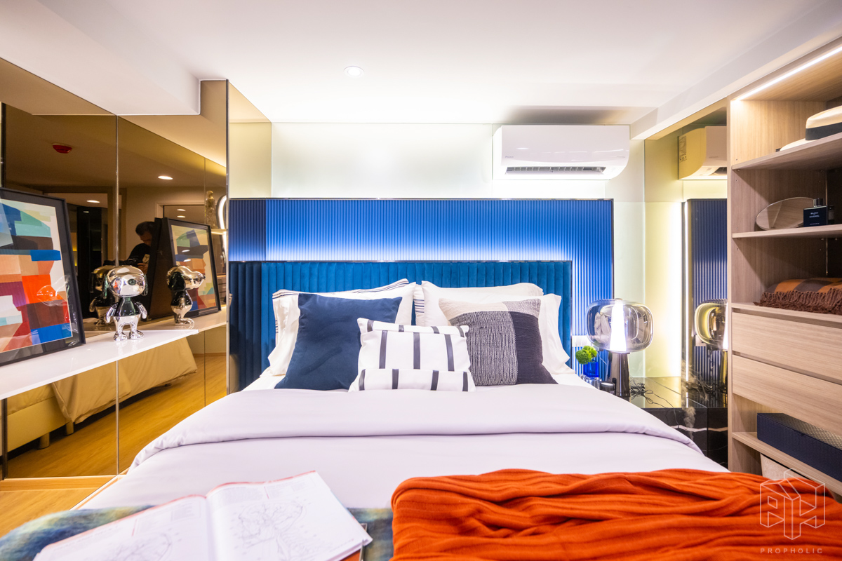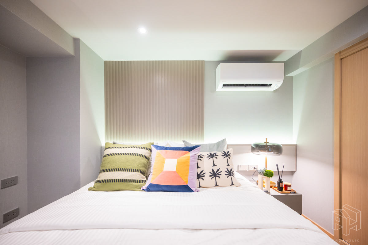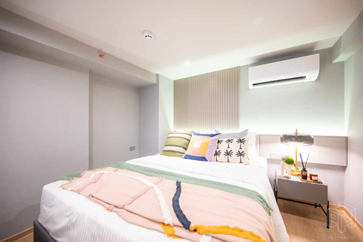 ห้องนี้มีความพิเศษมากเพราะเอาห้องแบบ 1 Bed Plus ใน Type B1 ขนาด 33 ตรม. มาทำ Minor Change ด้วยการปรับเลย์เอาท์ เพิ่มพื้นที่ใช้สอยของชั้นลอยให้มากขึ้นจนเพียงพอที่จะวางเตียงเพิ่มเป็น 2 ห้องนอนได้ ซึ่งเดิมห้อง Type B1 จะมีห้องเอนกประสงค์เพิ่มขึ้นมาที่ชั้นลอย เหนือส่วนครัวปิดติดอากาศ ซึ่งถ้าดูจากขนาดพื้นที่แล้วก็น่าจะเหมาะกับการทำเป็นห้องทำงาน work from home หรือทำเป็นห้องเก็บของมากกว่าทำเป็นห้องนอนแบบจริงจังวางตู้เสื้อผ้าได้