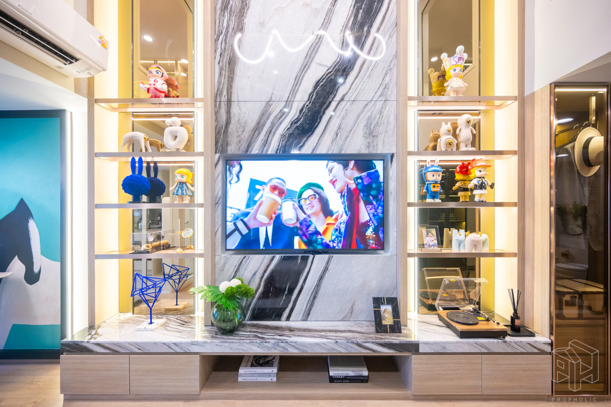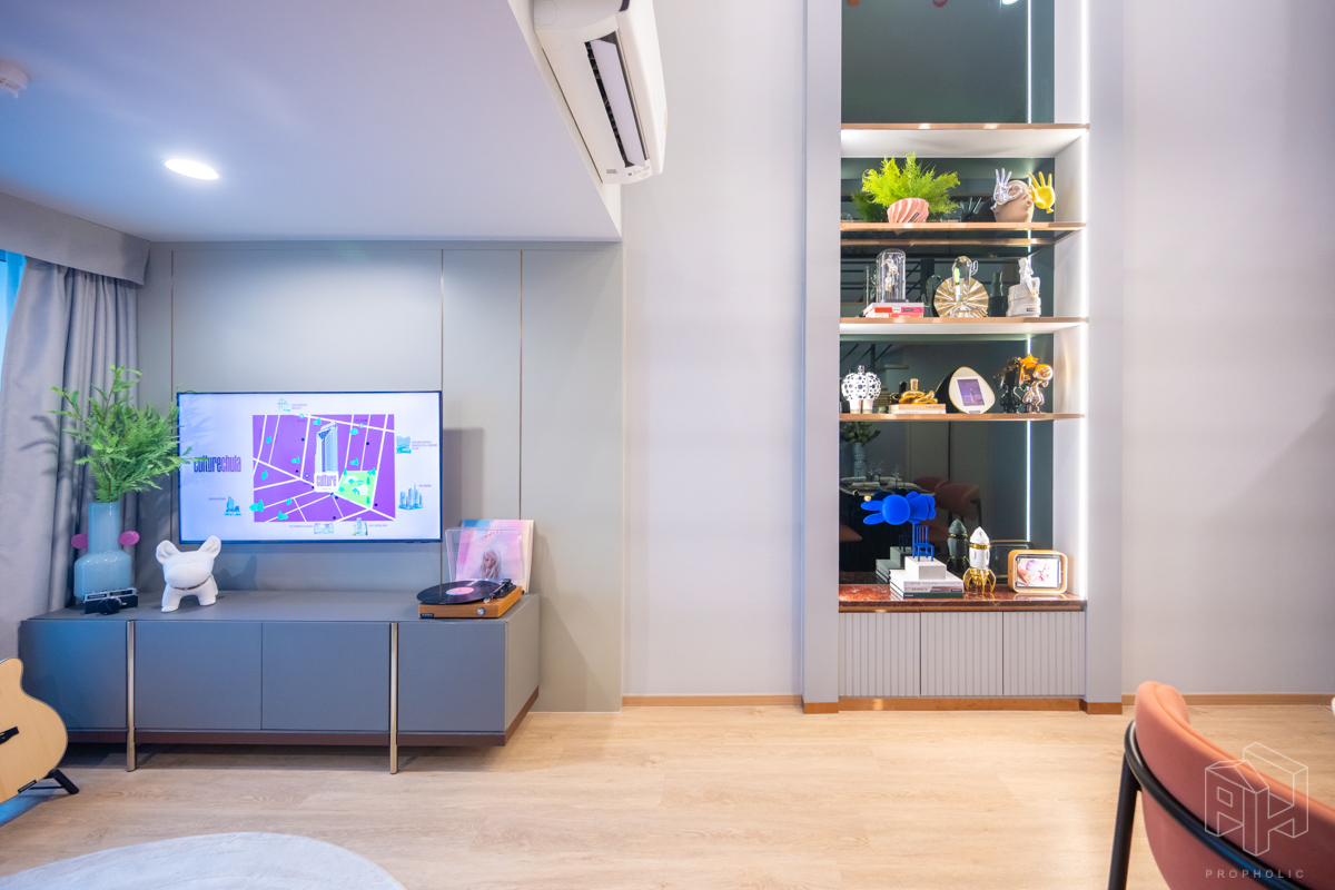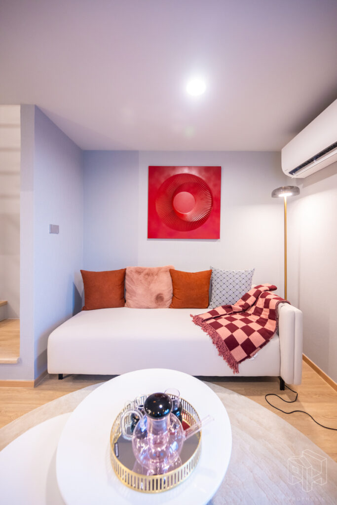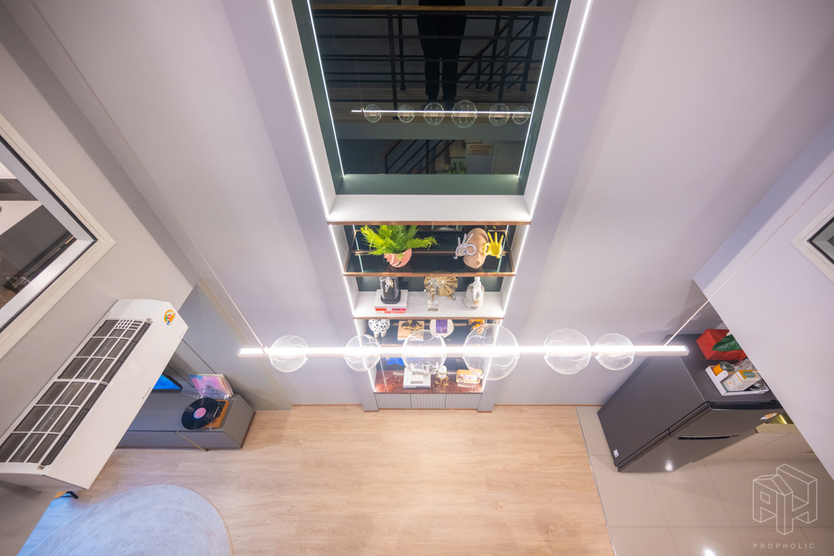 ถัดมาเป็นห้องนั่งเล่นที่อยู่ตรงกลางห้อง ติดกับช่อง Void ที่มองเห็นทางเดินและห้องนอนชั้นบนได้ เพดานสูง 4.3 เมตร วางโซฟา โต๊ะกาแฟ และชั้นวางทีวีแล้ว แต่ก็ยังมีพื้นที่ให้เดินผ่านได้สะดวก พร้อมห้องใต้บันไดที่เป็นพื้นที่ซักล้าง วางเครื่องซักผ้าไว้ด้านใน