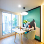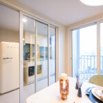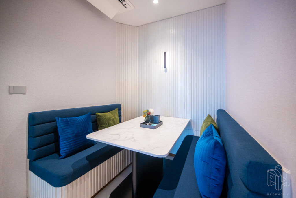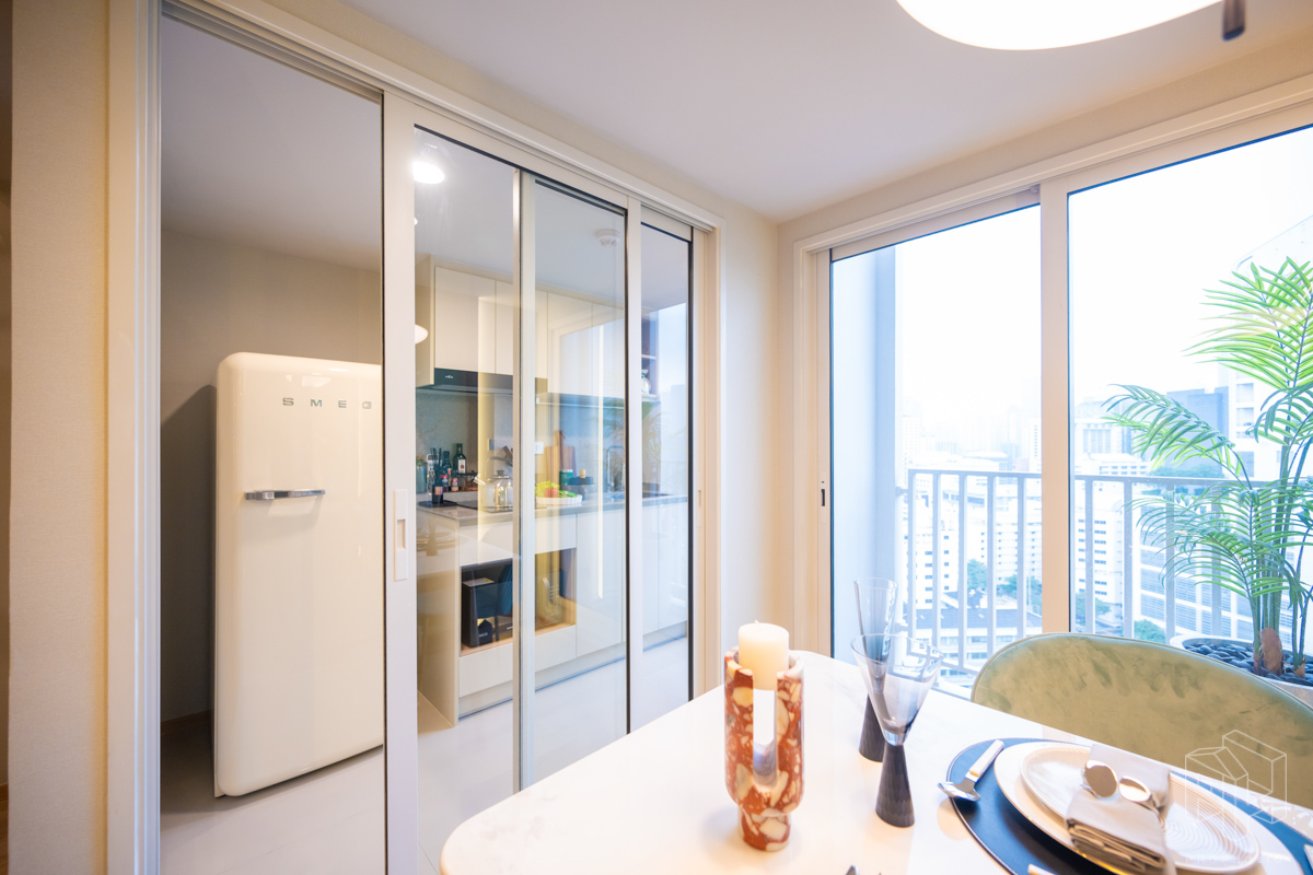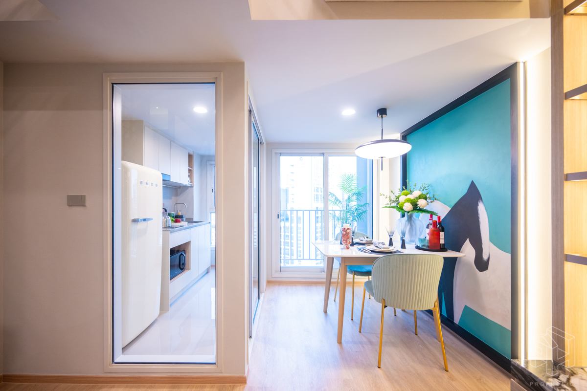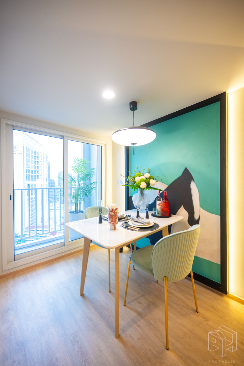ห้องนี้มีพื้นที่วางโต๊ะทานอาหารเชื่อมต่อกับระเบียงด้านนอกได้ โดยโต๊ะทานอาหารวางได้เต็มที่ 2- 3 ที่นั่ง