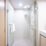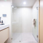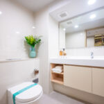 เมื่อเปิดประตูเข้ามาจะเจอห้องน้ำและส่วนที่เป็นครัว ภายในห้องอาบน้ำที่กั้นเป็นกระจกและฝักบัว 2 แบบ อ่างล้างหน้าแบบชิ้นเดียวกับเคาน์เตอร์กว้างวางของได้มากพร้อมกระจกบานใหญ่ โดยกระจกส่องหน้าบานใหญ่ทำให้ห้องน้ำดูกว้าง มีที่วางของและตู้เก็บของใต้ซิงค์อ่างล้างหน้า ที่วางของหลังชักโครกเป็นที่ซ่อนระบบกดน้ำชักโครก ซึ่งช่วยลดเสียงได้ มีโถสุขภัณฑ์แบบติดผนังลอยตัว พร้อมสายฉีดชำระและที่แขวนกระดาษชำระ มีธรณีและประตูกระจกแบบผลักแบ่งโซนเปียกโซนแห้ง