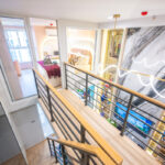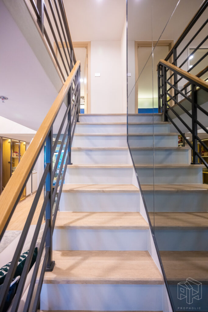บันไดขึ้นชั้นลอยห้องชั้นลอยมีหน้าต่างกระจกใสบานใหญ่มองเห็นด้านล่างและทำให้ห้องดูโปร่ง เพดานสูงประมาณ 4.3 เมตร