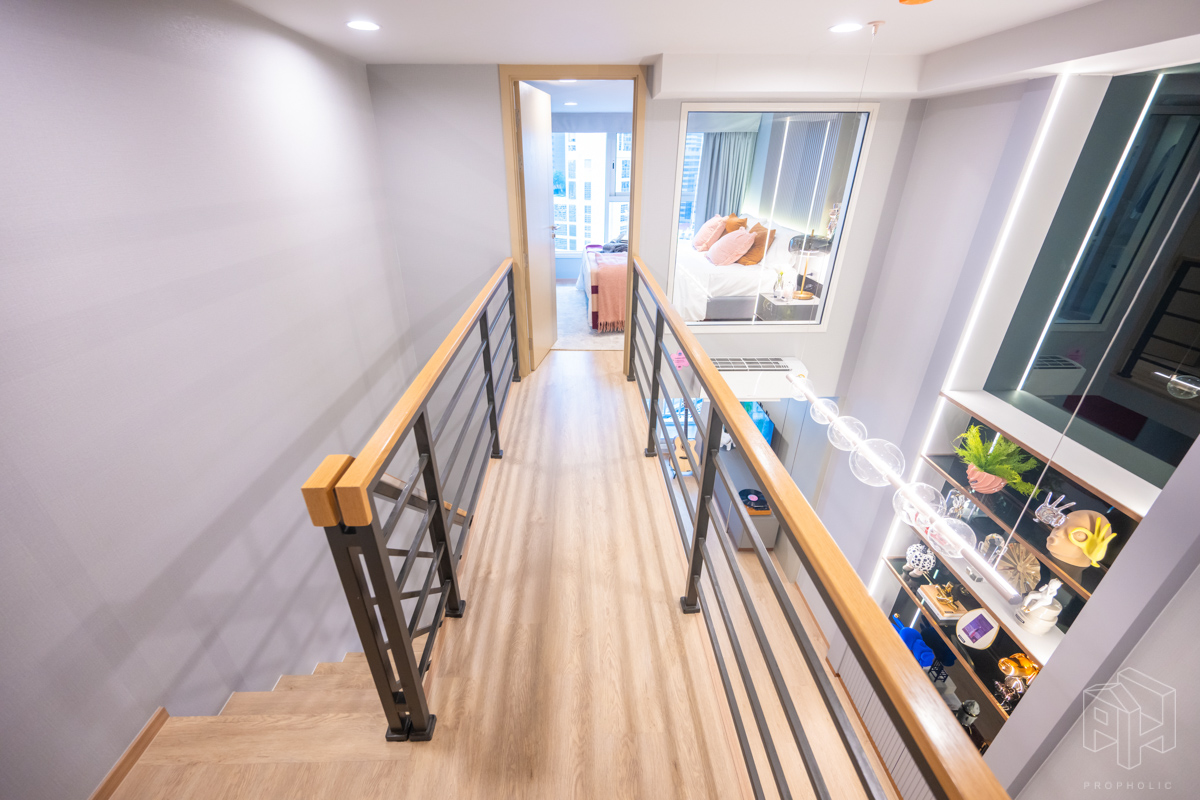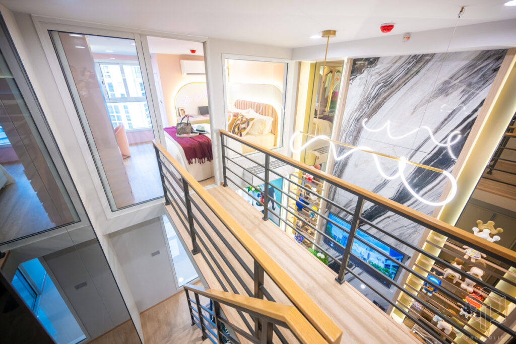ด้านบนมีห้องนอน 2 ห้อง บริเวณหน้าห้องเป็นทางเดินที่สามารถเดินเชื่อมต่อหากันได้ มองเห็นข้างล่างที่เป็นห้องนั่งเล่นพอดี พร้อมช่องกระจกขนาดใหญ่ของห้องนอนทั้ง 2 ห้อง ที่สามารถมองเห็นกันได้ และช่วยทำให้ห้องไม่มืด ไม่ดูอึดอัดเวลาที่อยู่ในห้องนอน
