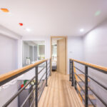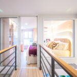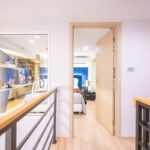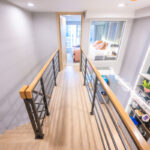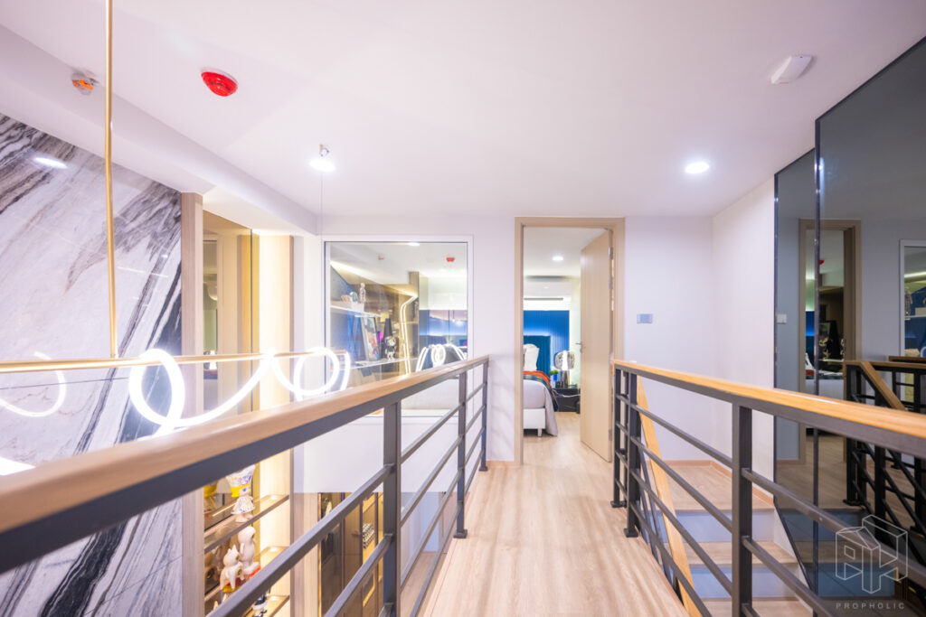 ขึ้นมาดูกันที่ชั้นบน บันไดและทางเดินเชื่อมระหว่างสองห้องนอนที่อยู่บนชั้นลอย ทางเดินเข้าห้องนอนเหมือนสะพาน มองเห็นข้างล่างที่อยู่ระหว่างโต๊ะทานอาหารและห้องนั่งเล่นพอดี