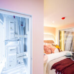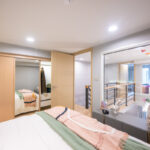 ห้องนอนใหญ่อยู่อีกฝั่งมีกระจกใสบานใหญ่ให้รู้สึกโล่งโปร่ง สามารถมองเห็นอีกห้องนอนตรงข้ามได้ ห้องนอนใหญ่มีโซนตู้เสื้อผ้า จะออกแบบให้โปร่งแบบนี้ก็ได้ และวิวจากหน้าต่างที่มองทะลุทั้งสองห้อง