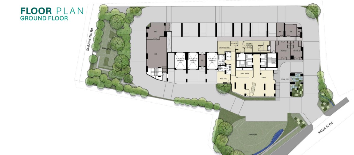 ชั้น 1 มีทางเข้าหลักรถยนต์เข้าออกได้ มีถนนปูชิดรอบโครงการ ข้างหน้าเป็นสวนติดถนนพระราม 4 นอกจากนี้มีพื้นที่สีเขียวและทางเดินสำหรับคนเดินออกไปยังถนนสุรวงศ์อีกด้วย ถ้าเข้าไปในอาคารก็จะมีโถง Lobby ห้องนิติบุคคล ห้องตู้จดหมาย และพื้นที่สำหรับร้านค้า