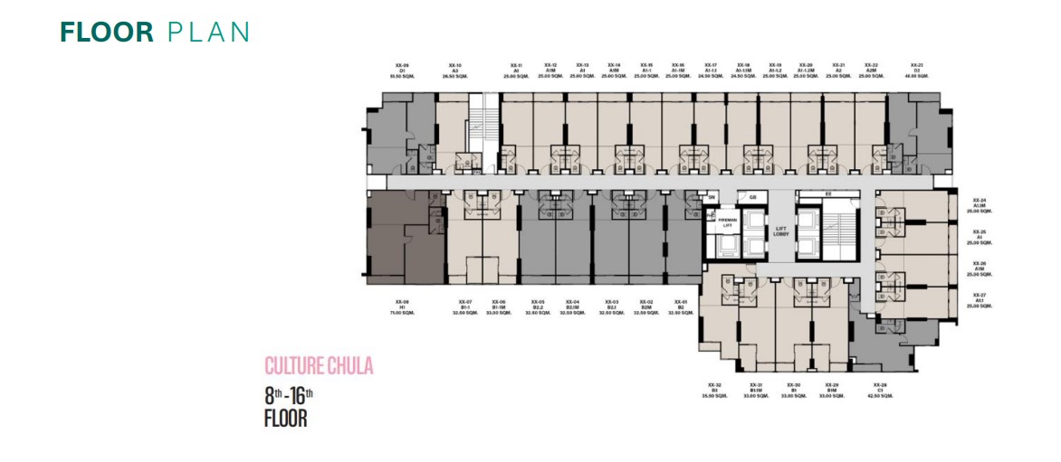 ต่อไปเป็นชั้น 8 – 16 เป็นโซนพักอาศัยทั้งหมด ชั้นนี้จะเป็นแบบเต็ม Floor มากที่สุด มี 32 ยูนิตต่อชั้น และชั้นสูงขึ้นต่อจากนี้ไปจะค่อยๆ ลดจำนวนพื้นที่ลงเพื่อให้เป็นไปตามกฎหมายระยะ Setback กับถนนสุรวงศ์